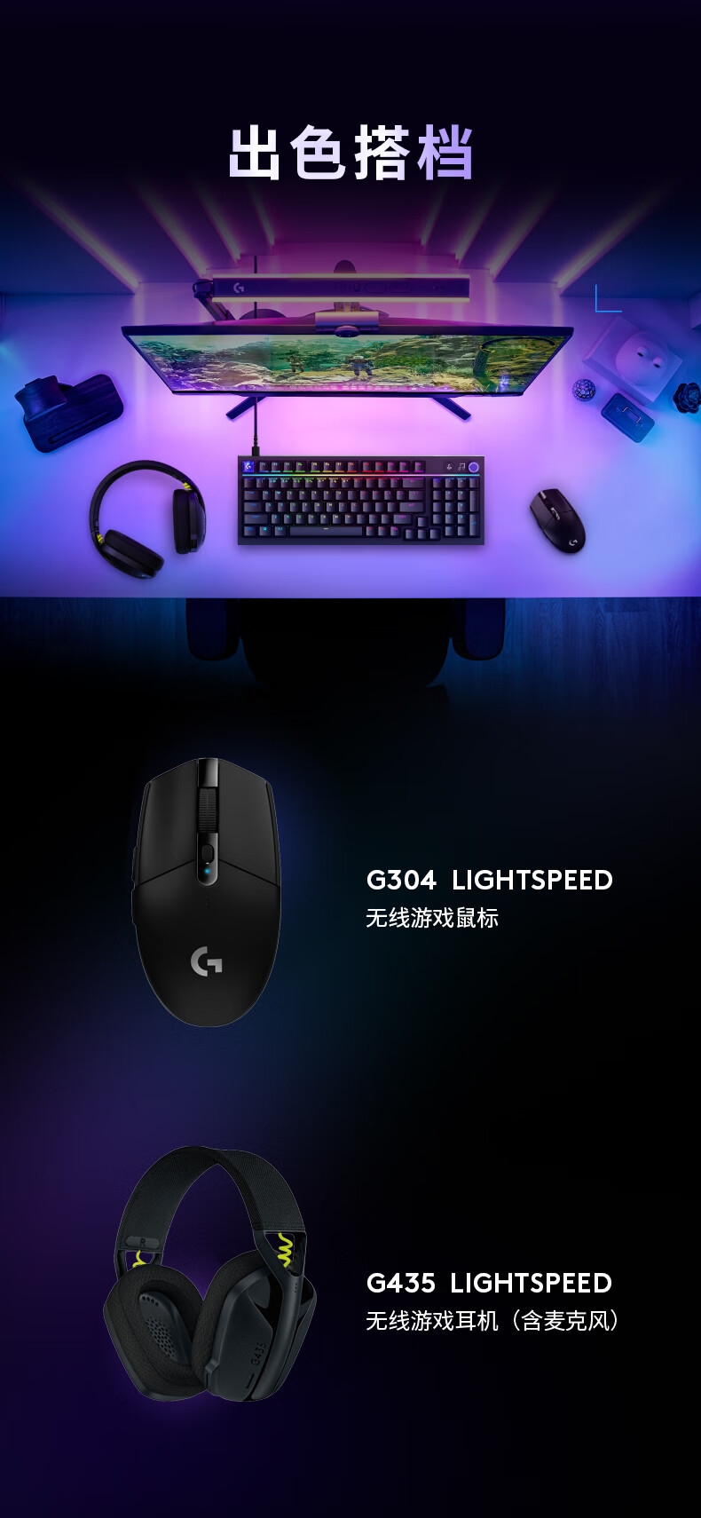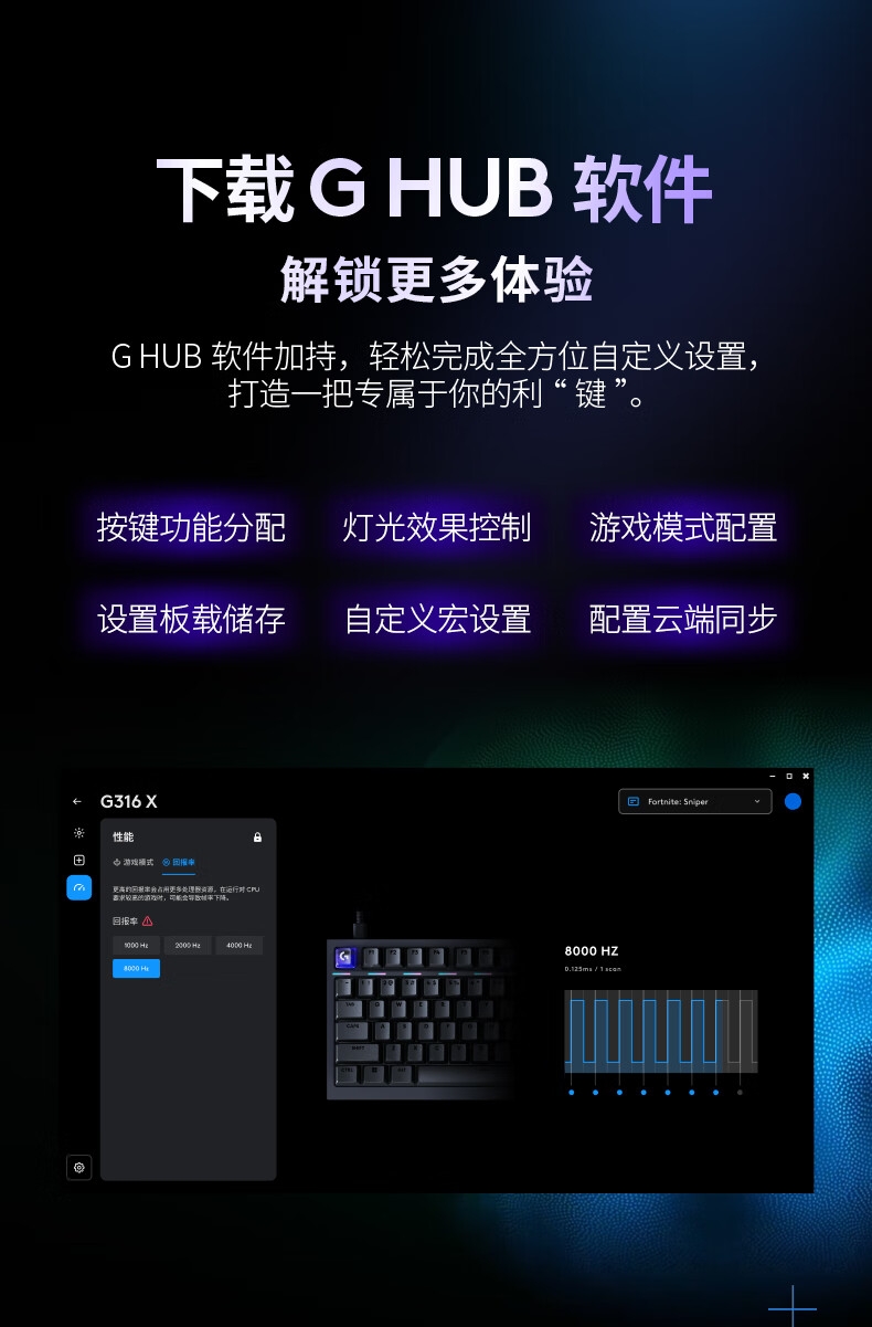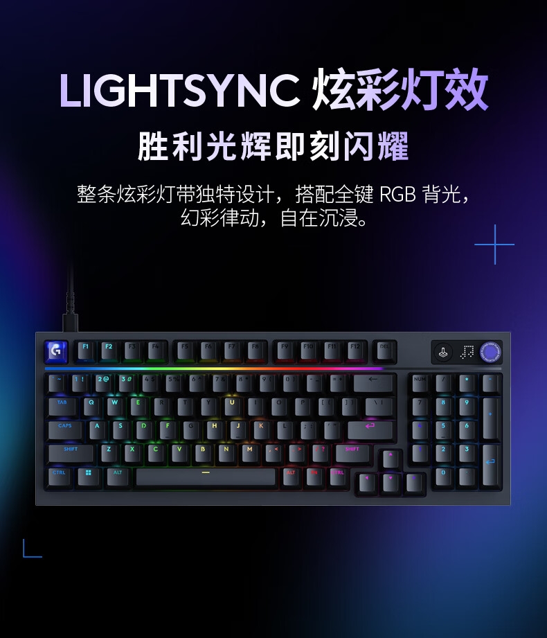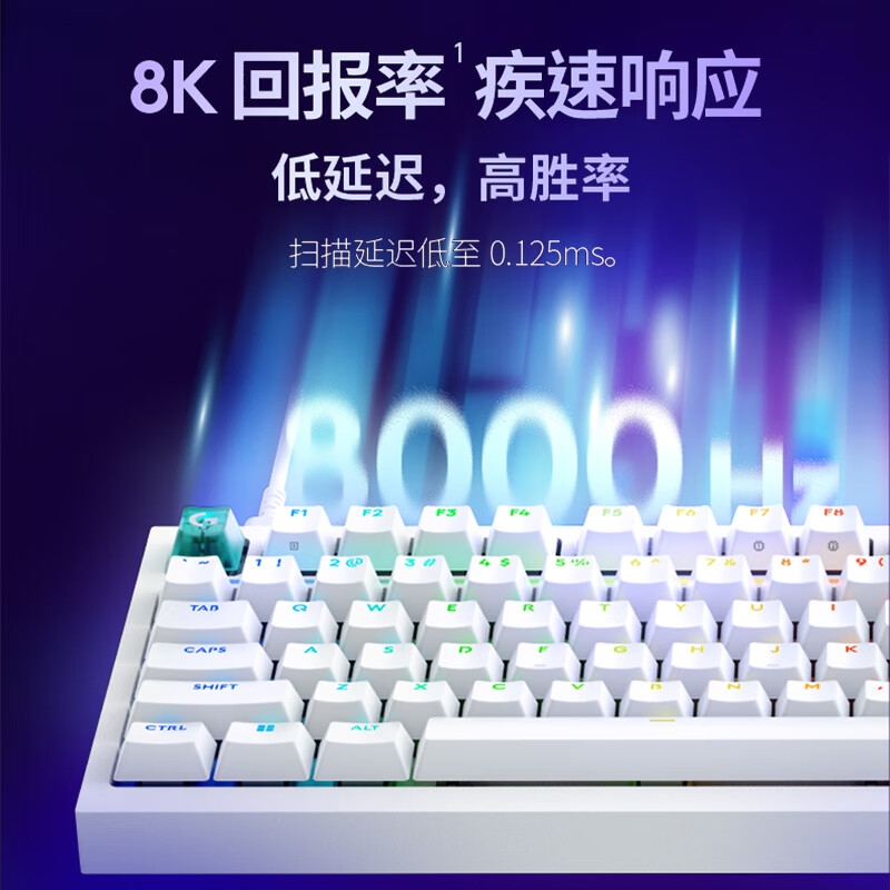 8K回报, 疾速响应 低延迟,高胜率;罗技G特调轴,精准顺滑,内外兼修·悦耳坚果音;轻松客制化 风格随心换 全键全轴热插拔