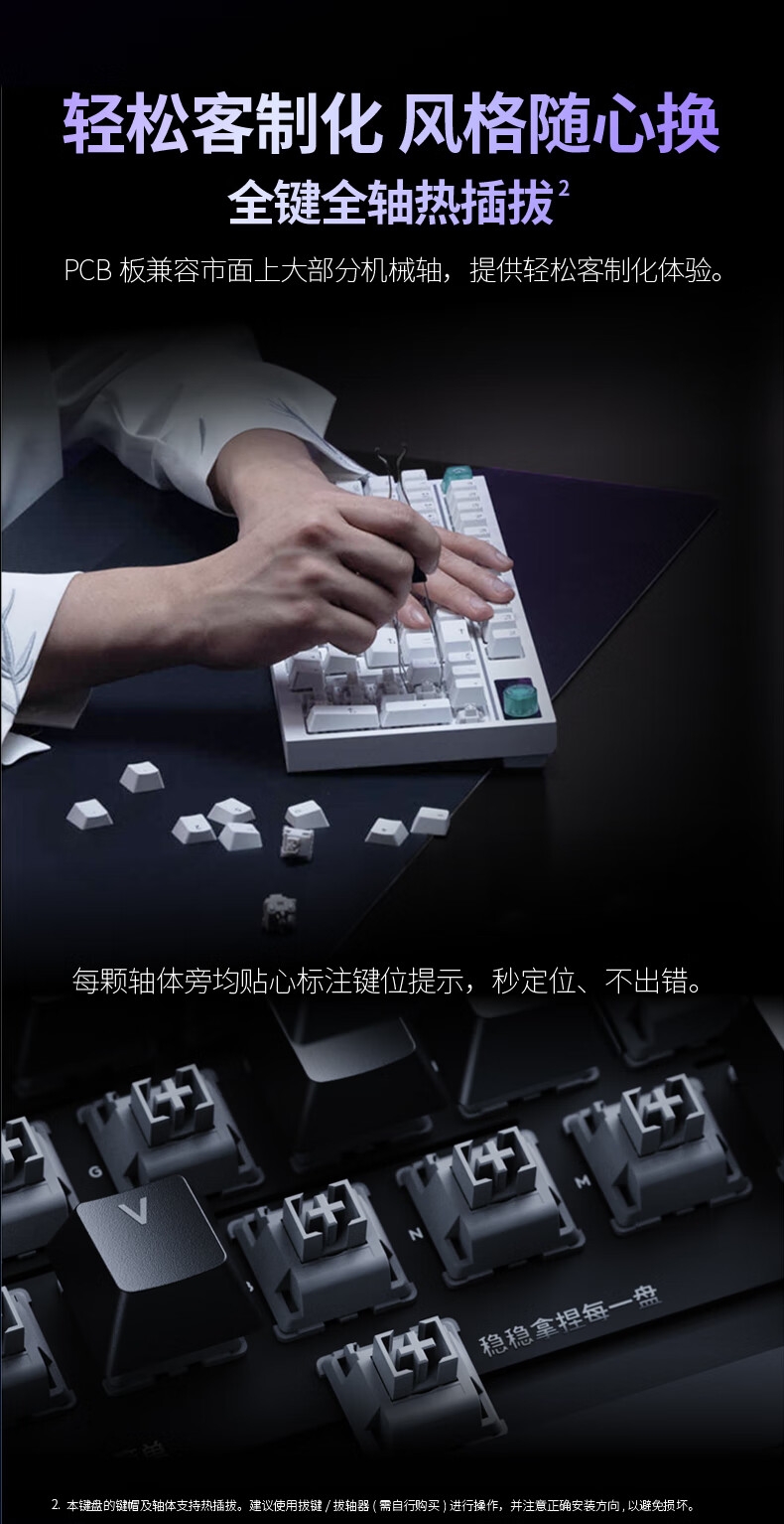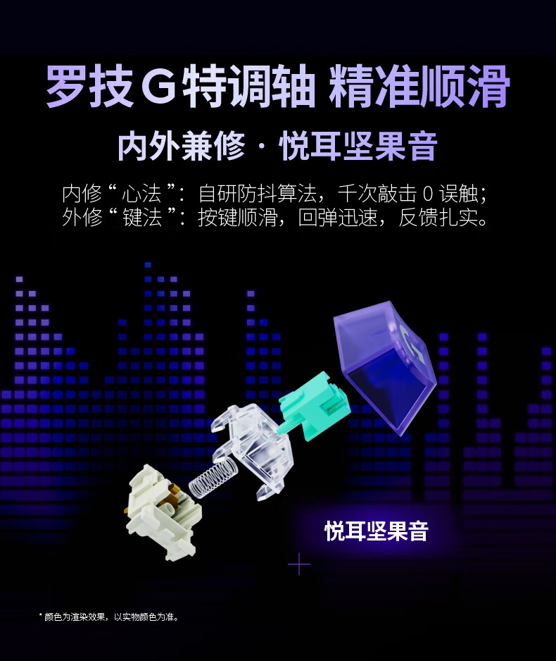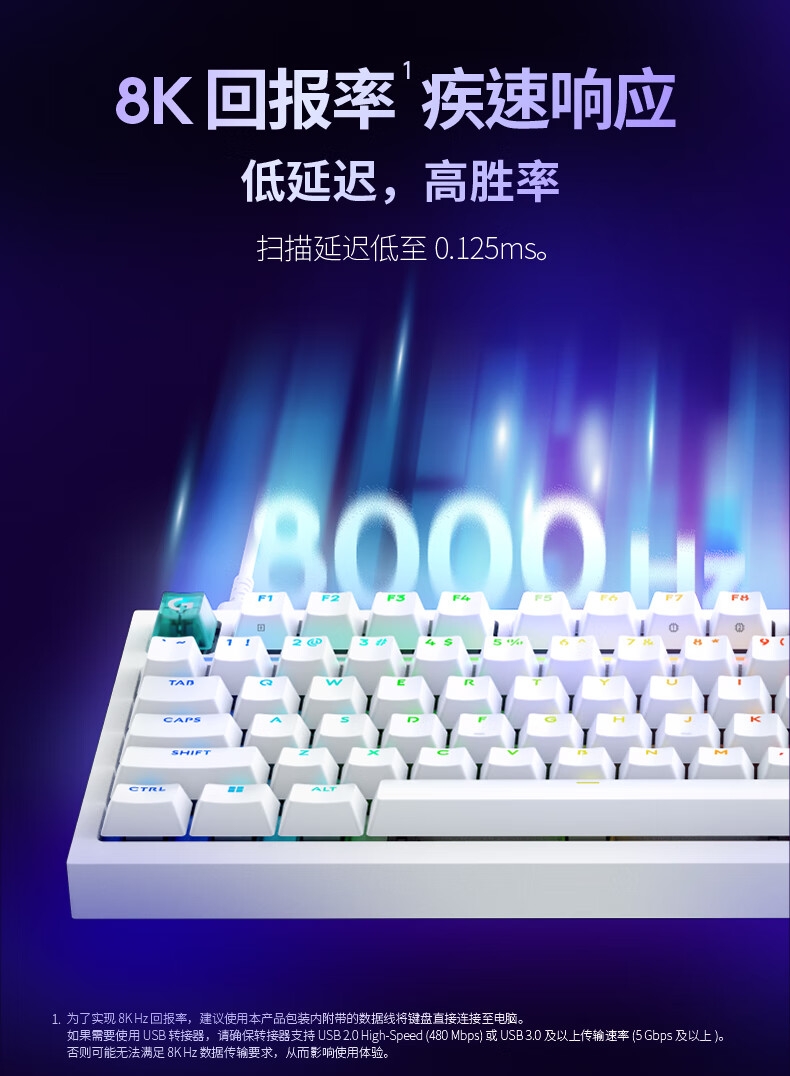 8K回报, 疾速响应 低延迟,高胜率;罗技G特调轴,精准顺滑,内外兼修·悦耳坚果音;轻松客制化 风格随心换 全键全轴热插拔