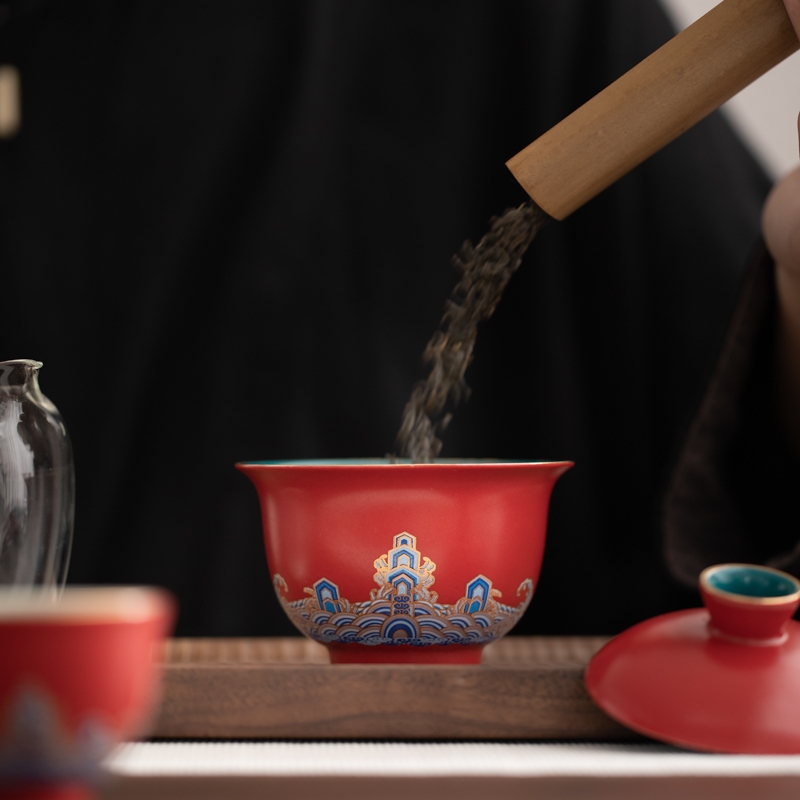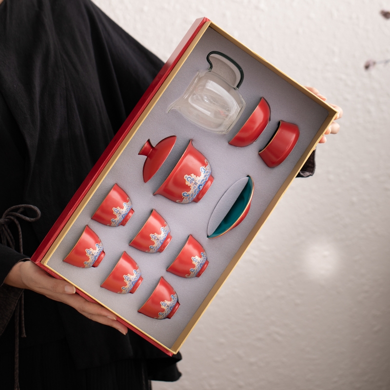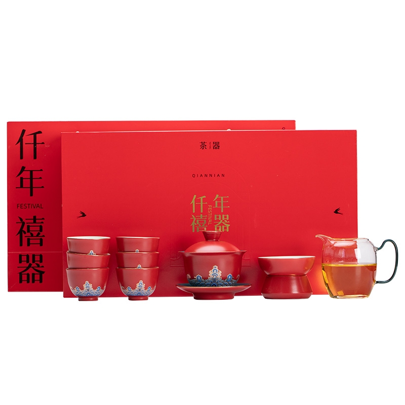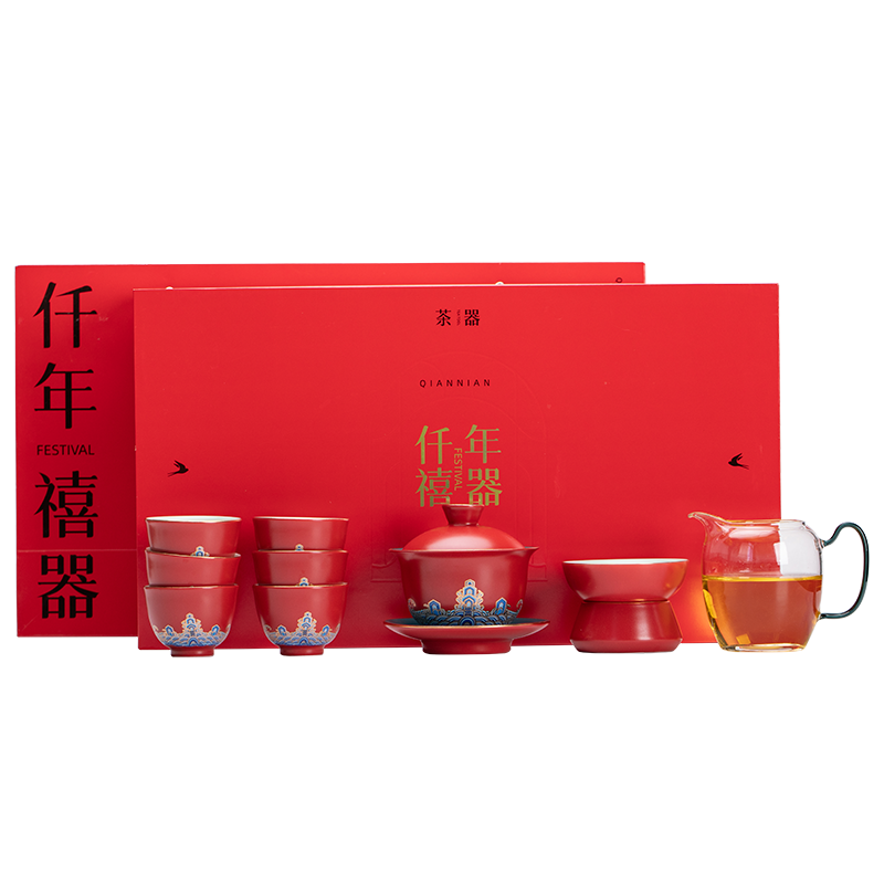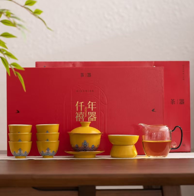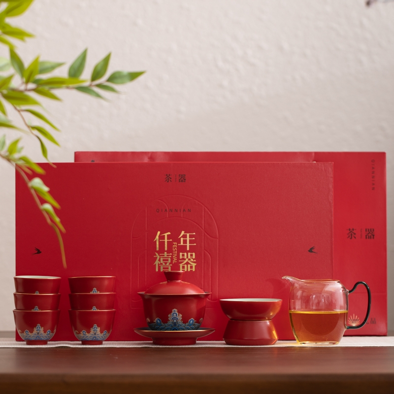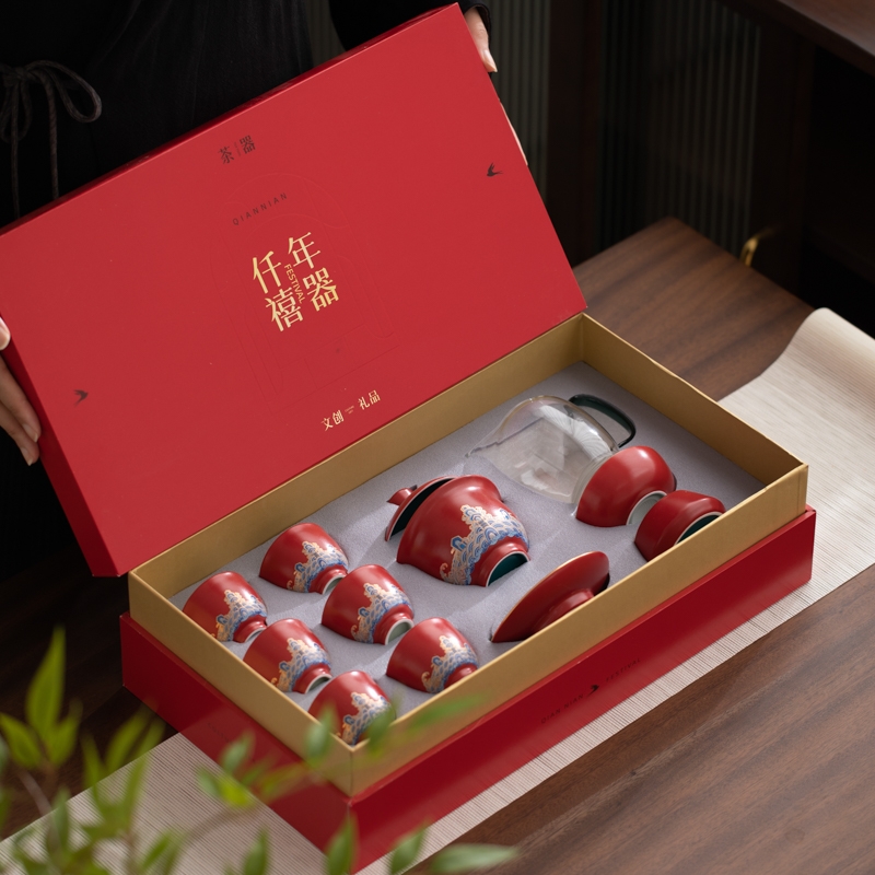开门红仟禧年器高端商务套装,品质高档精致细腻;绸缎般质感釉面,堆料立体画面,独家专利技术新品;加入稀土,瓷身油质感强,堆金花纸两次烧成画面,