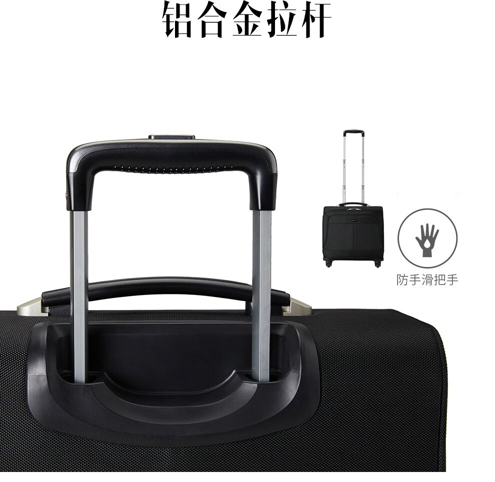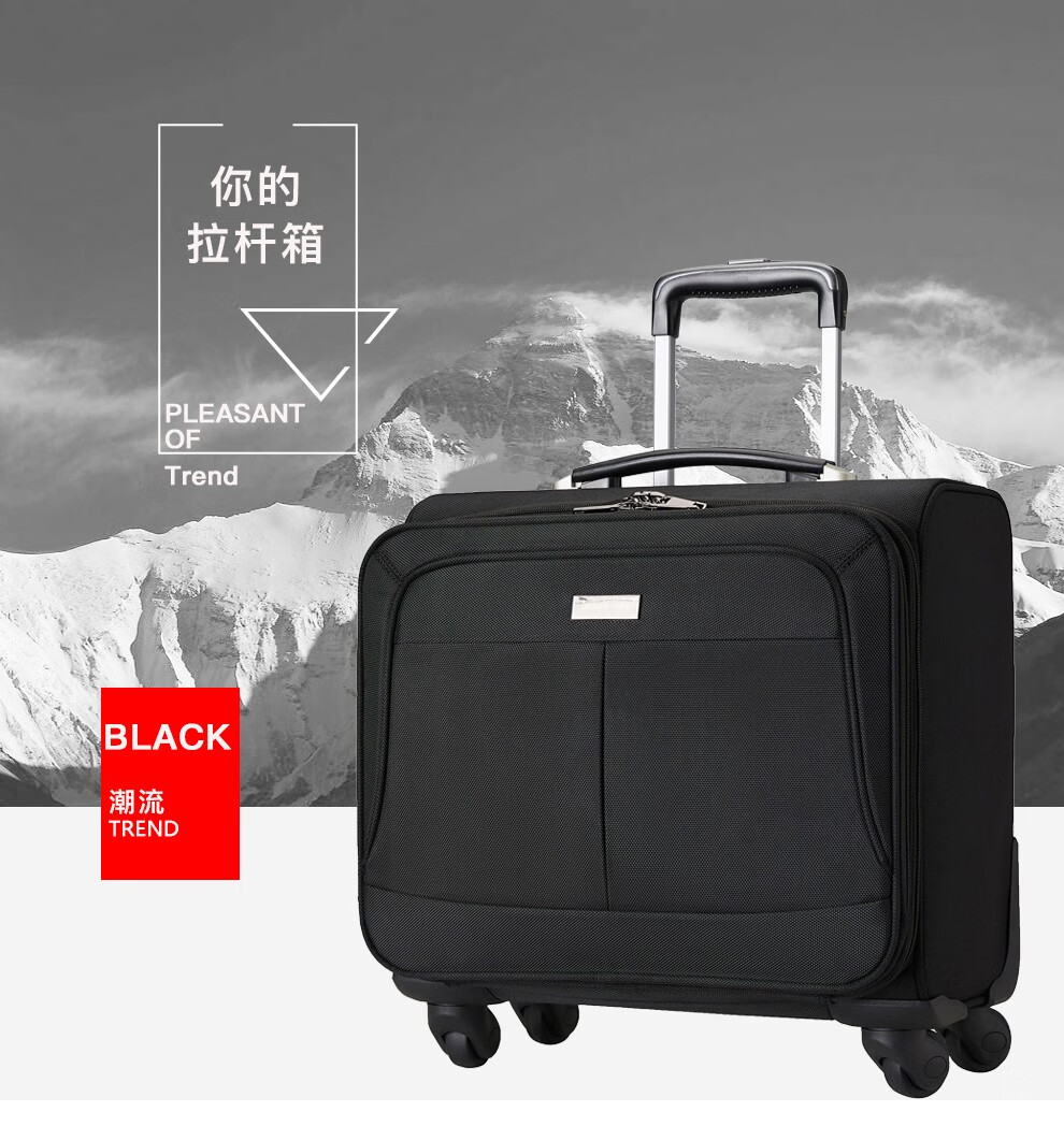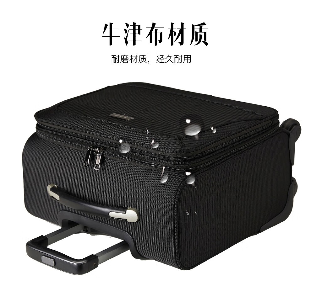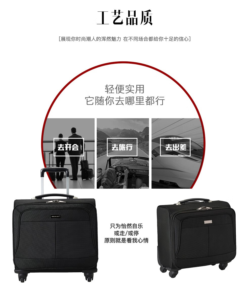 轻便实用 · 品质保证 牛津布材质,经久耐用;配备铝合金拉杆,360度万向轮;内部配备电脑隔层,适合商务人士出差使用