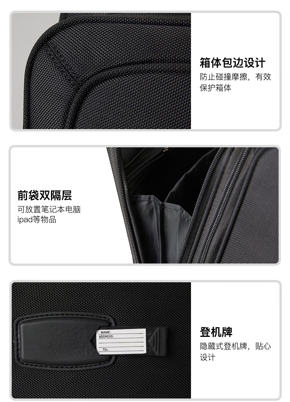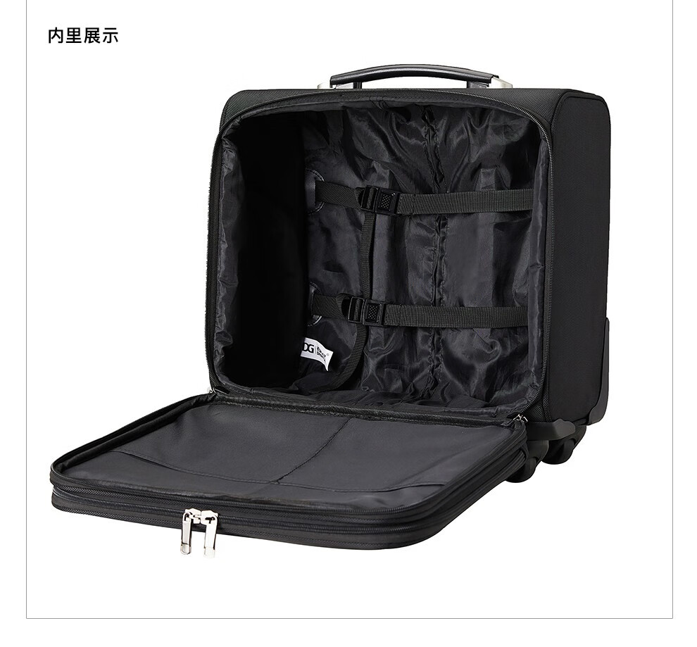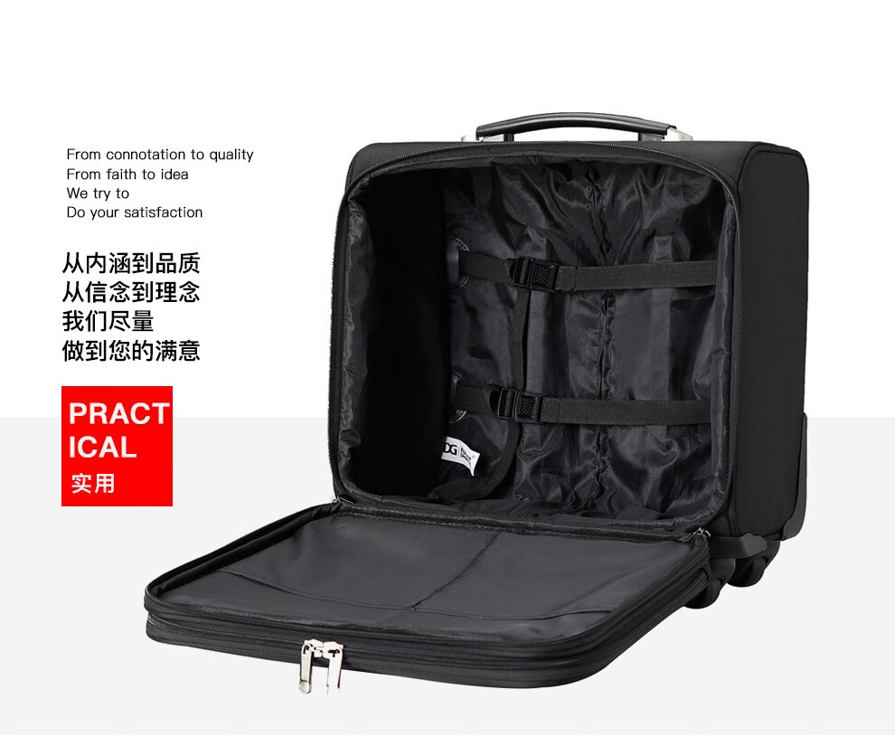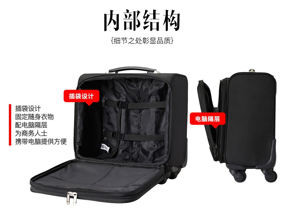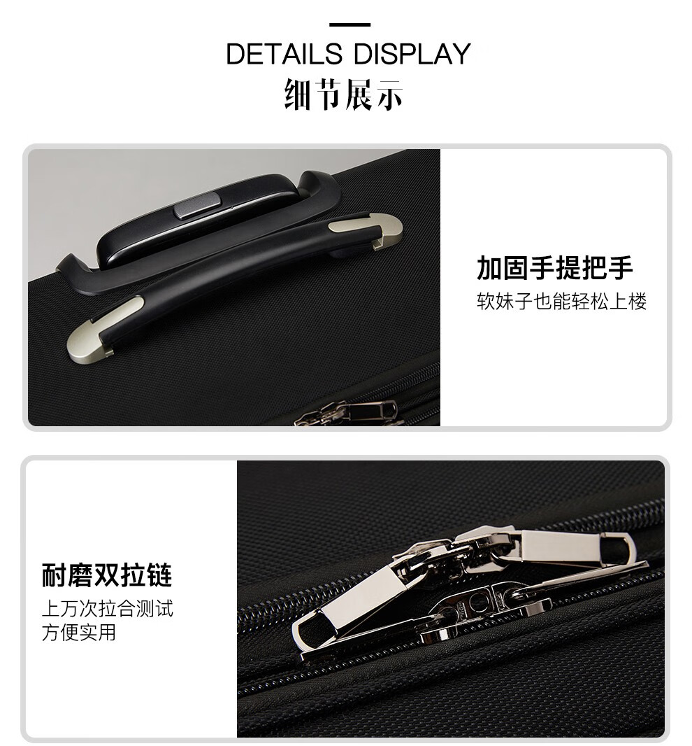 轻便实用 · 品质保证 牛津布材质,经久耐用;配备铝合金拉杆,360度万向轮;内部配备电脑隔层,适合商务人士出差使用
