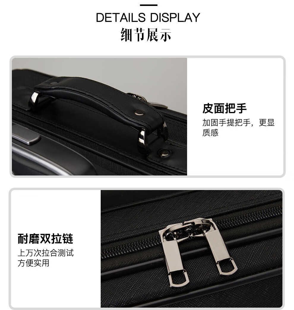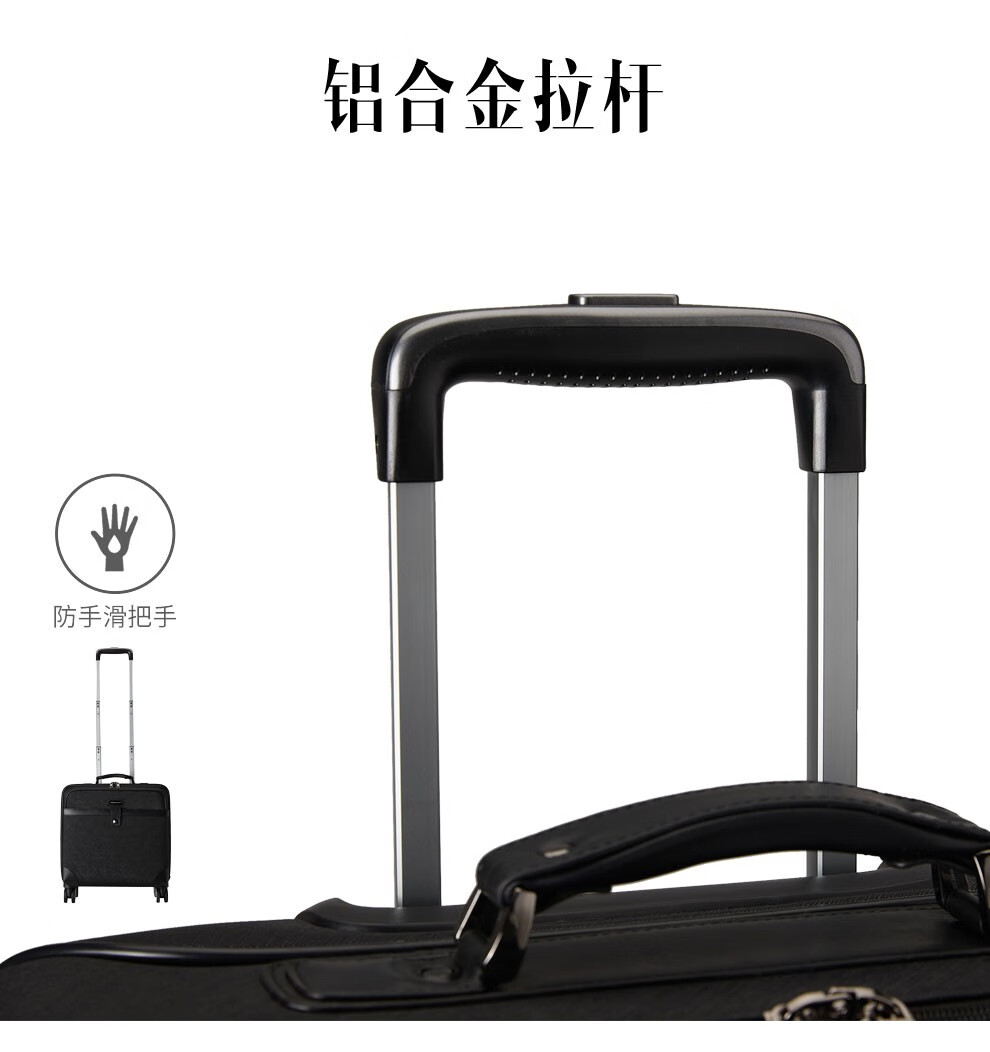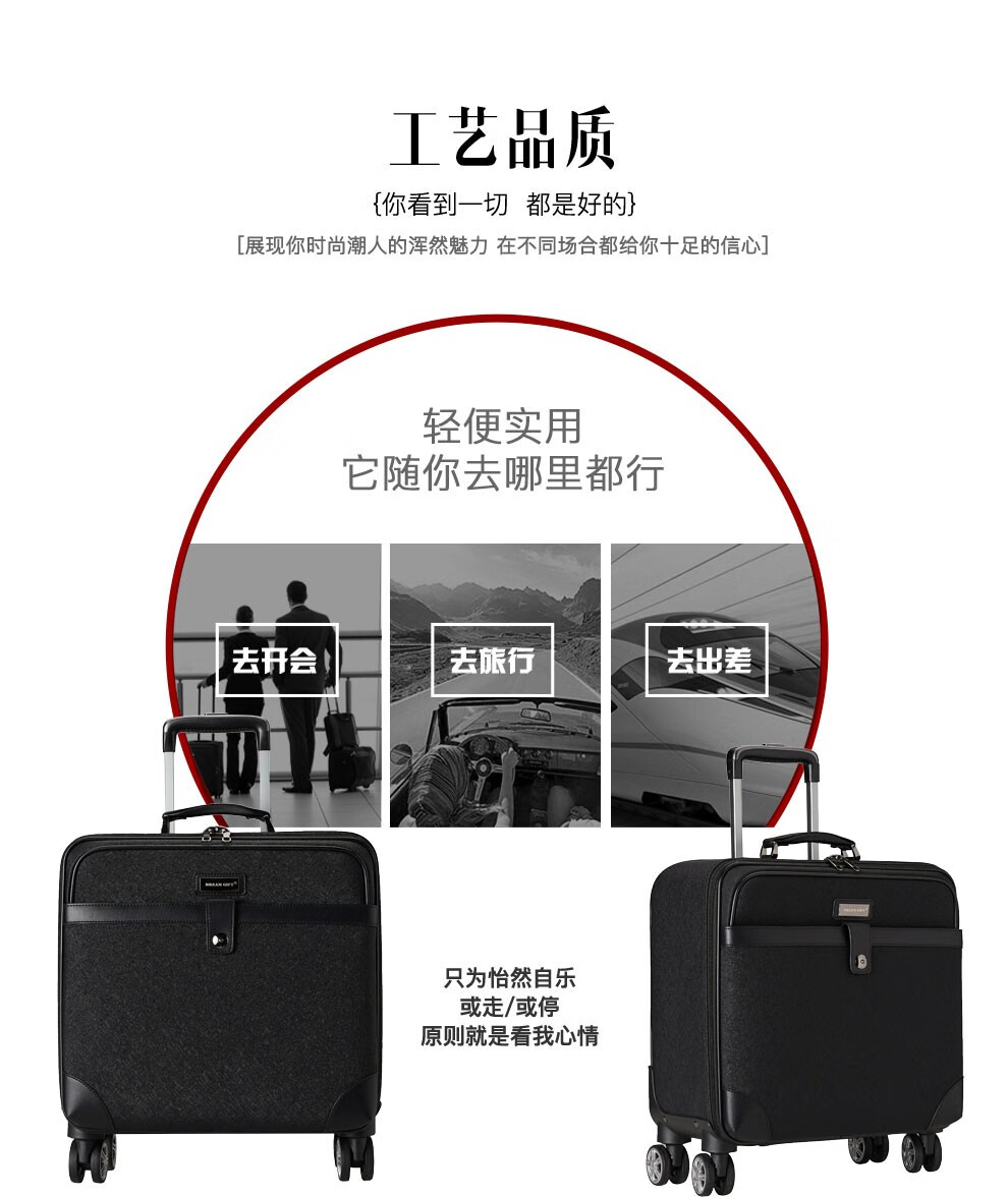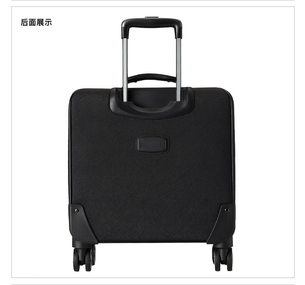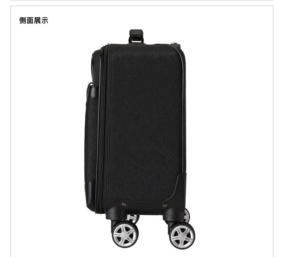 轻便实用 · 品质保证 轻便实用 · 品质保证 ;PVC(复合革)配PU皮的设计,耐磨防刮;箱体支持LOGO定制,打造您的专属行李箱;内部配备笔记本电脑隔层,更加贴合商务人士的出行需求