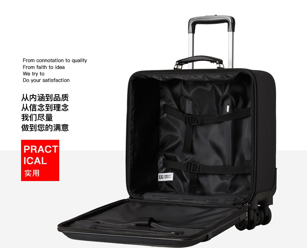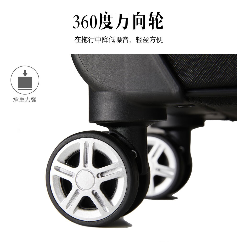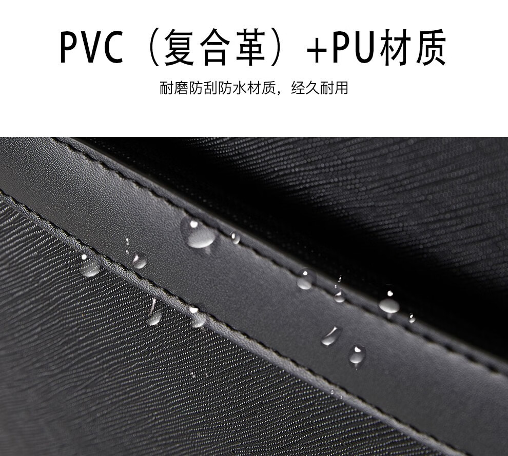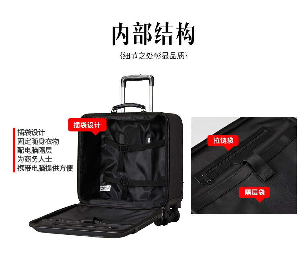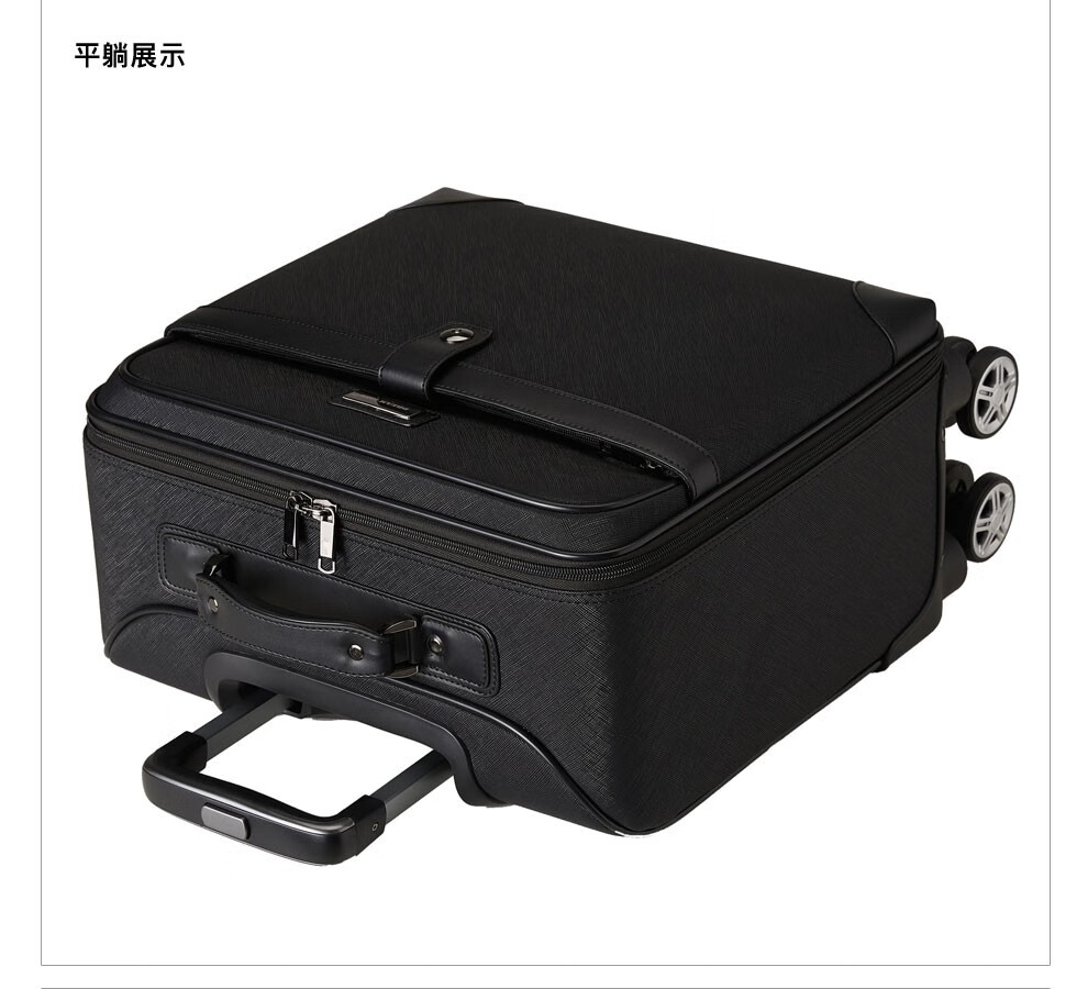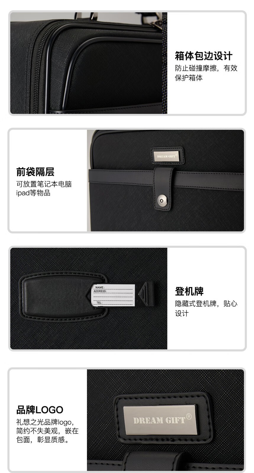轻便实用 · 品质保证 轻便实用 · 品质保证 ;PVC(复合革)配PU皮的设计,耐磨防刮;箱体支持LOGO定制,打造您的专属行李箱;内部配备笔记本电脑隔层,更加贴合商务人士的出行需求