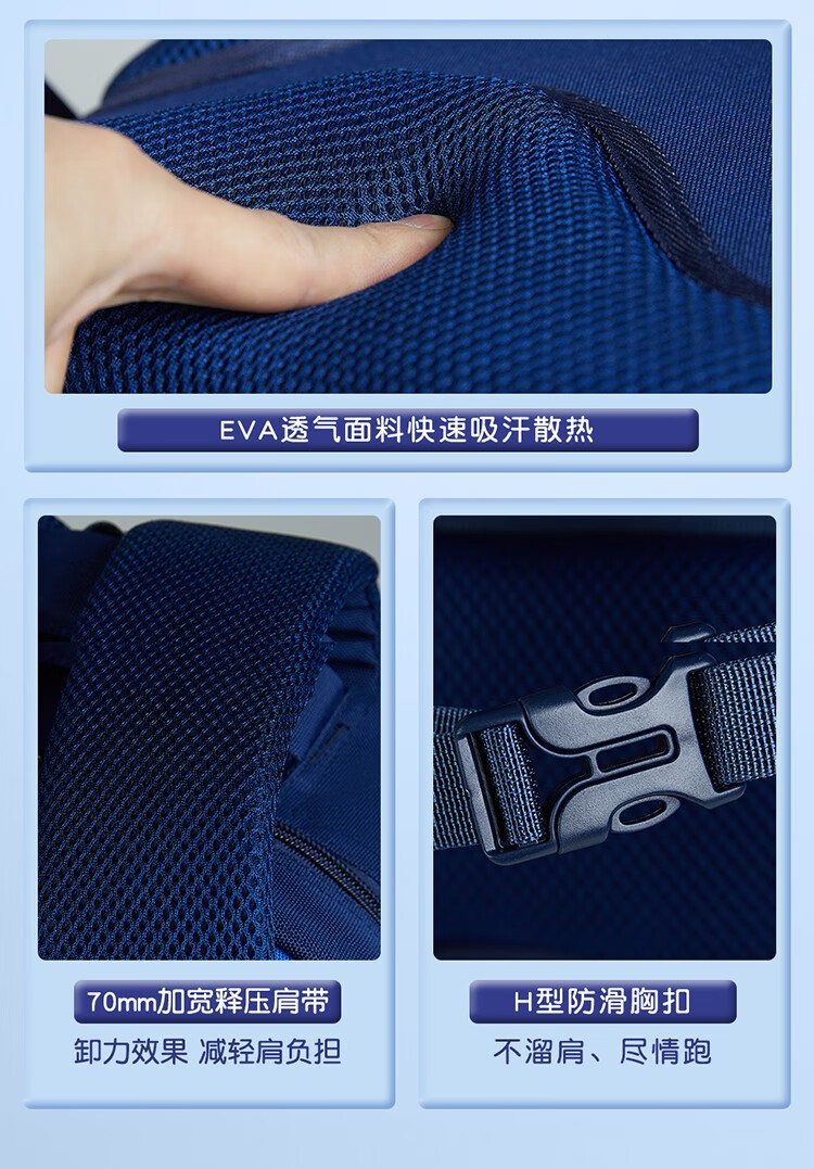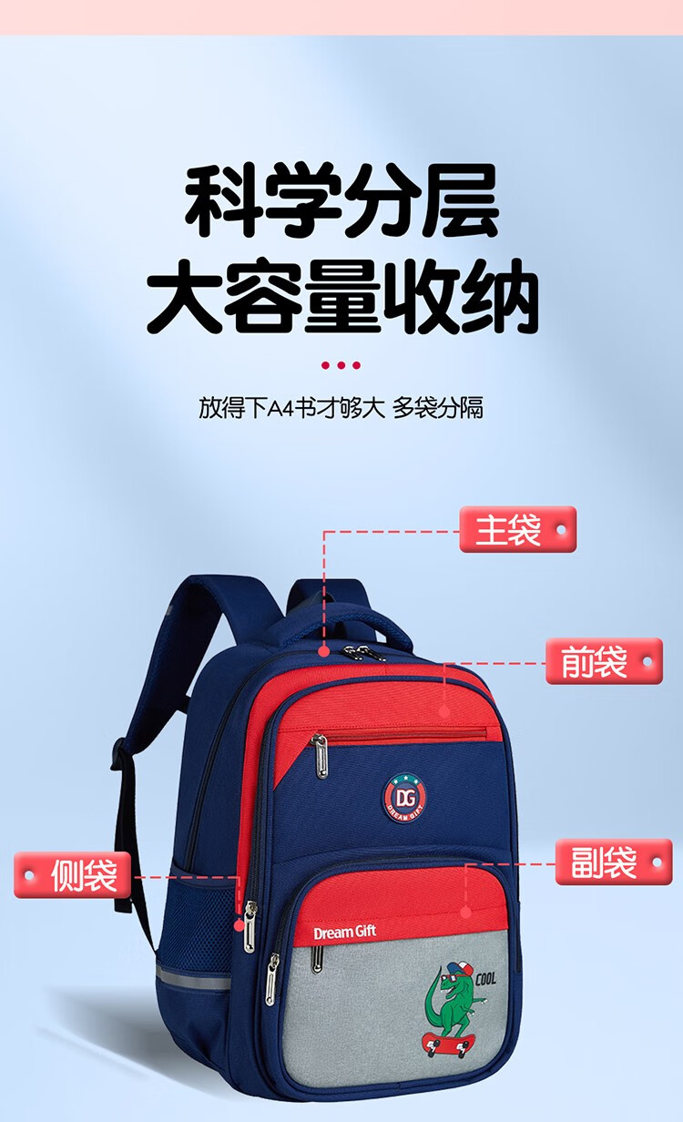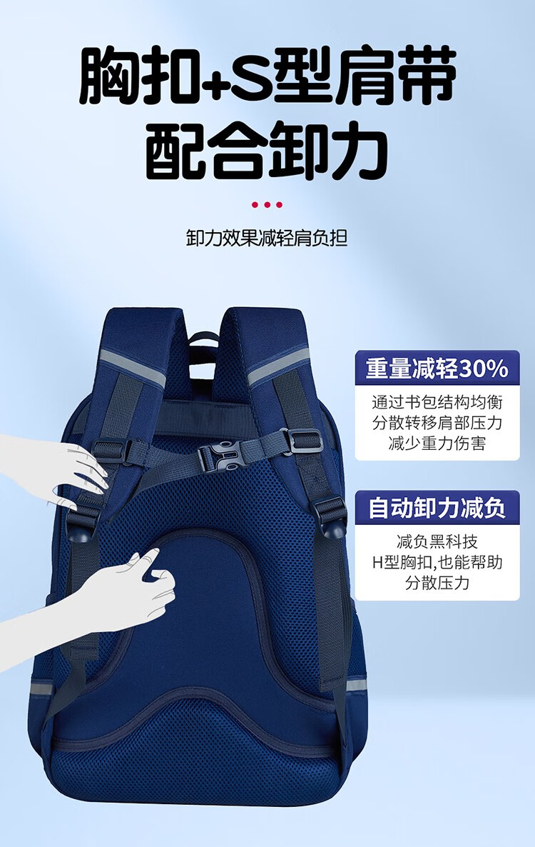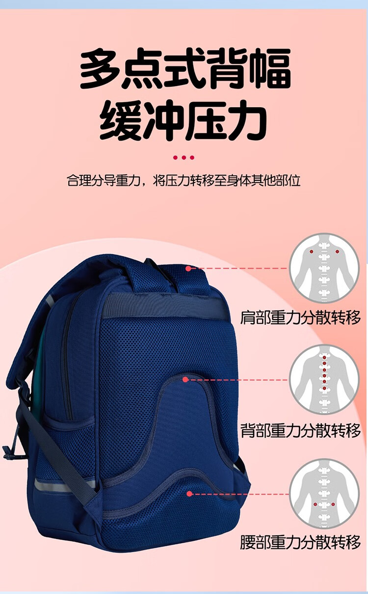 科学分层大容量收纳 背包配备大容量主袋和多个副袋;再多课本也装的下,多点式背幅设计,有效缓冲压力;科学轻量化,轻盈自在久背不喊累;同时呵护孩子脊椎,为孩子的健康成长保驾护航