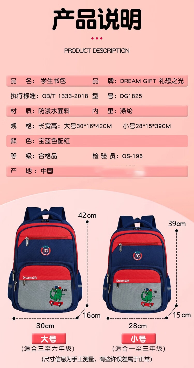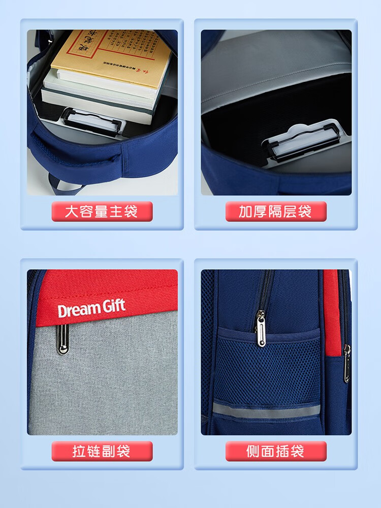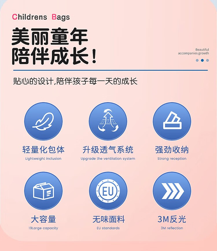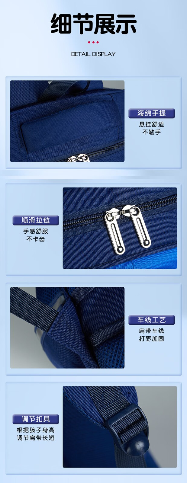 科学分层大容量收纳 背包配备大容量主袋和多个副袋;再多课本也装的下,多点式背幅设计,有效缓冲压力;科学轻量化,轻盈自在久背不喊累;同时呵护孩子脊椎,为孩子的健康成长保驾护航