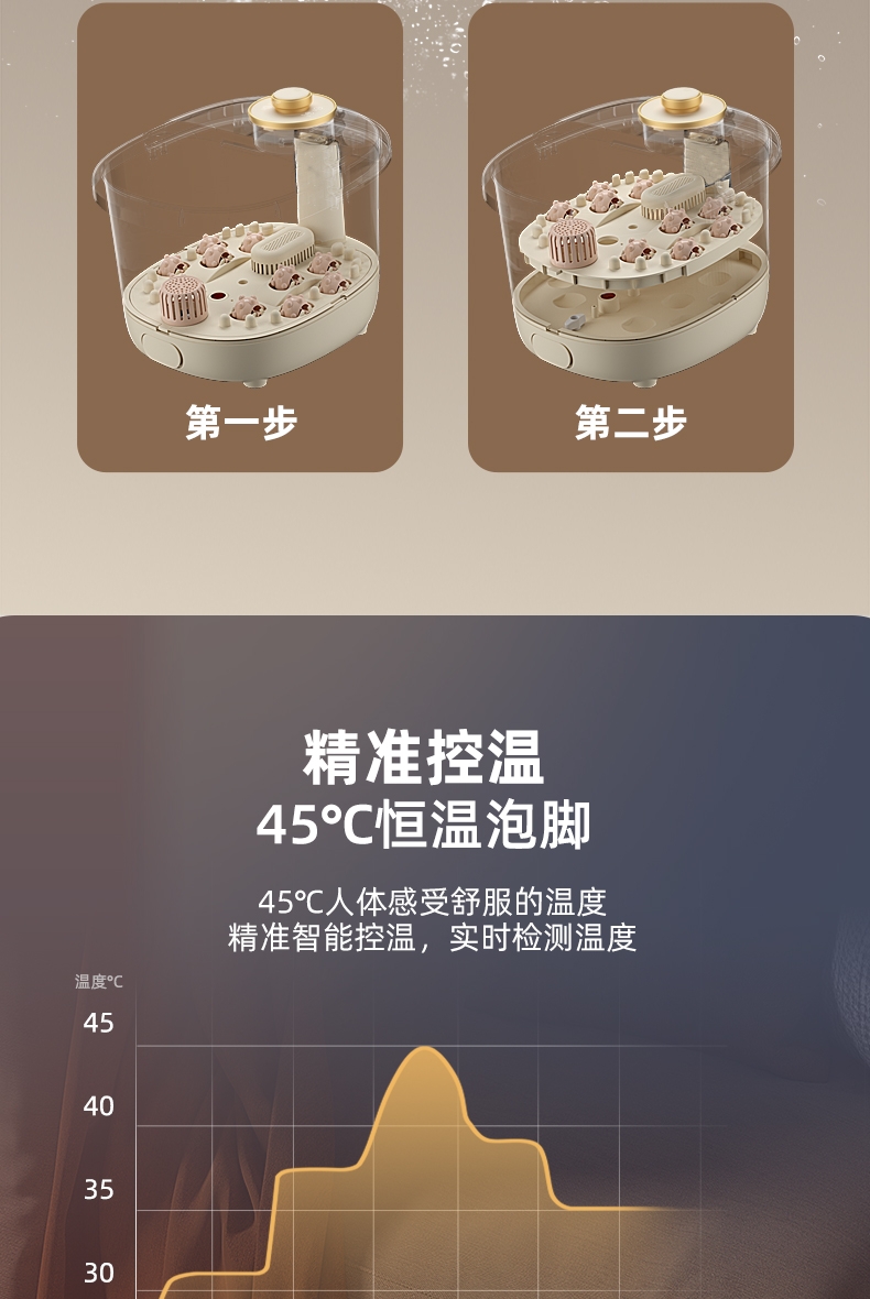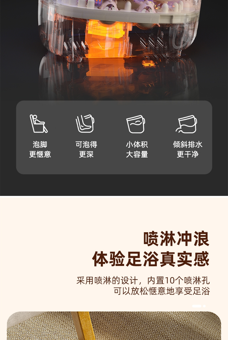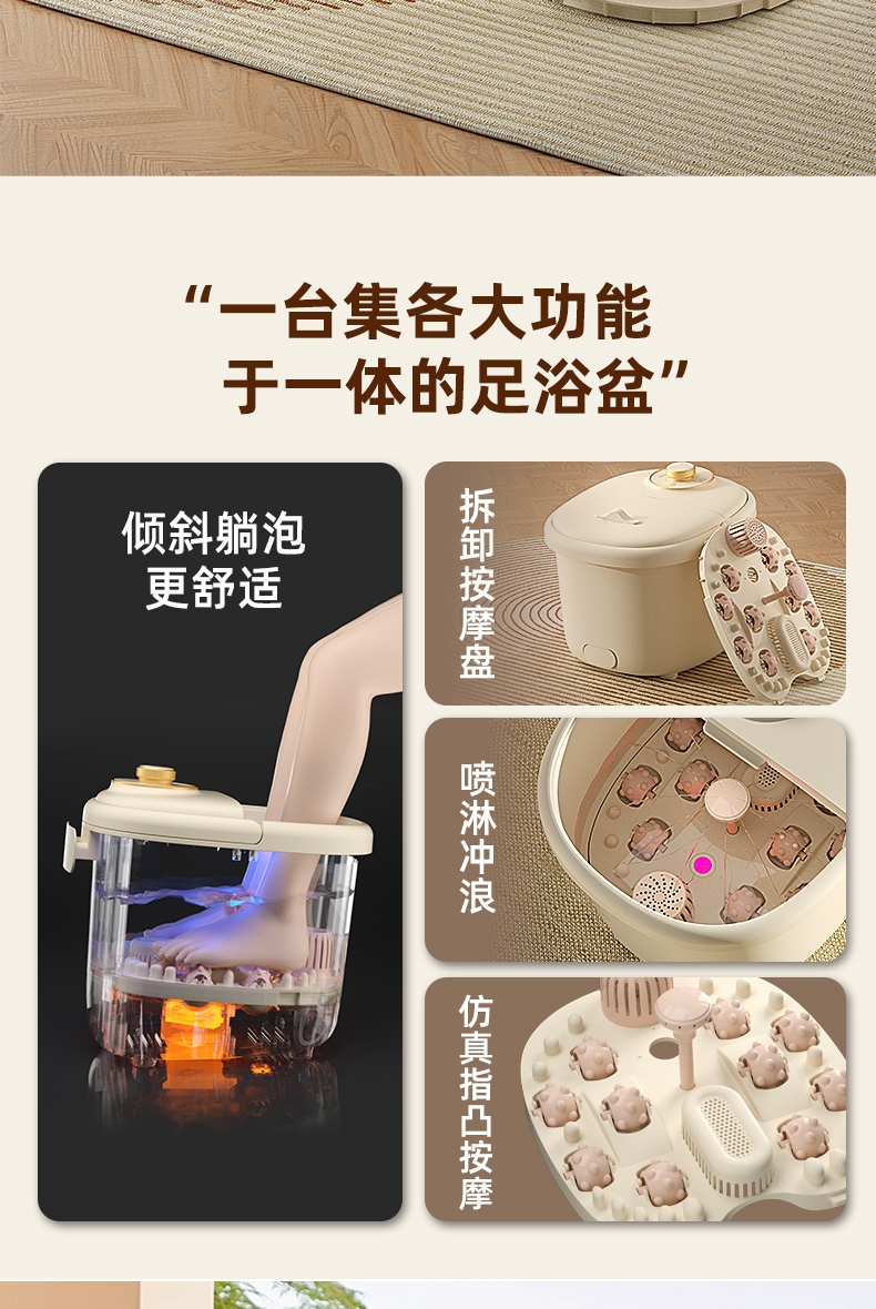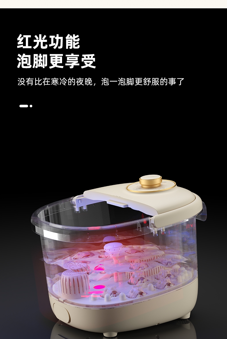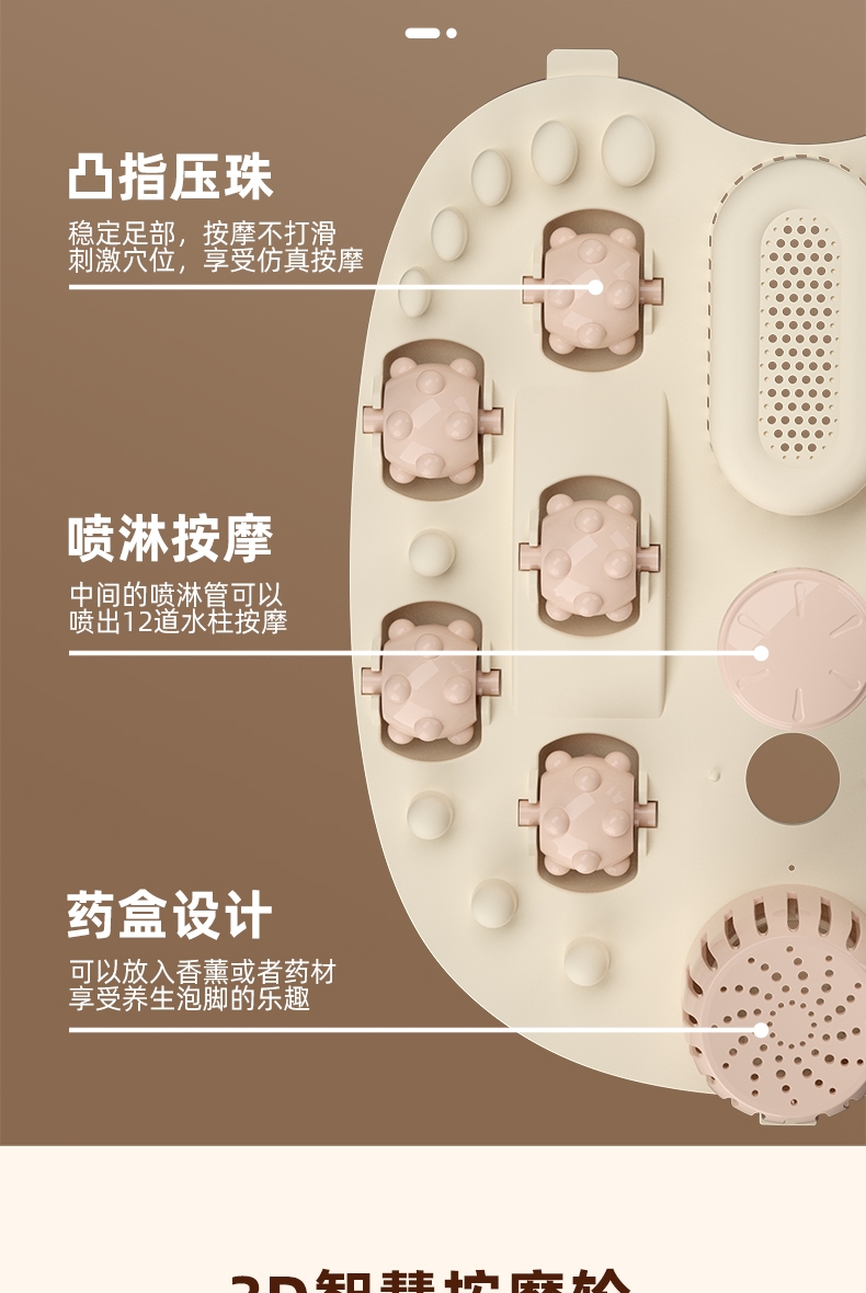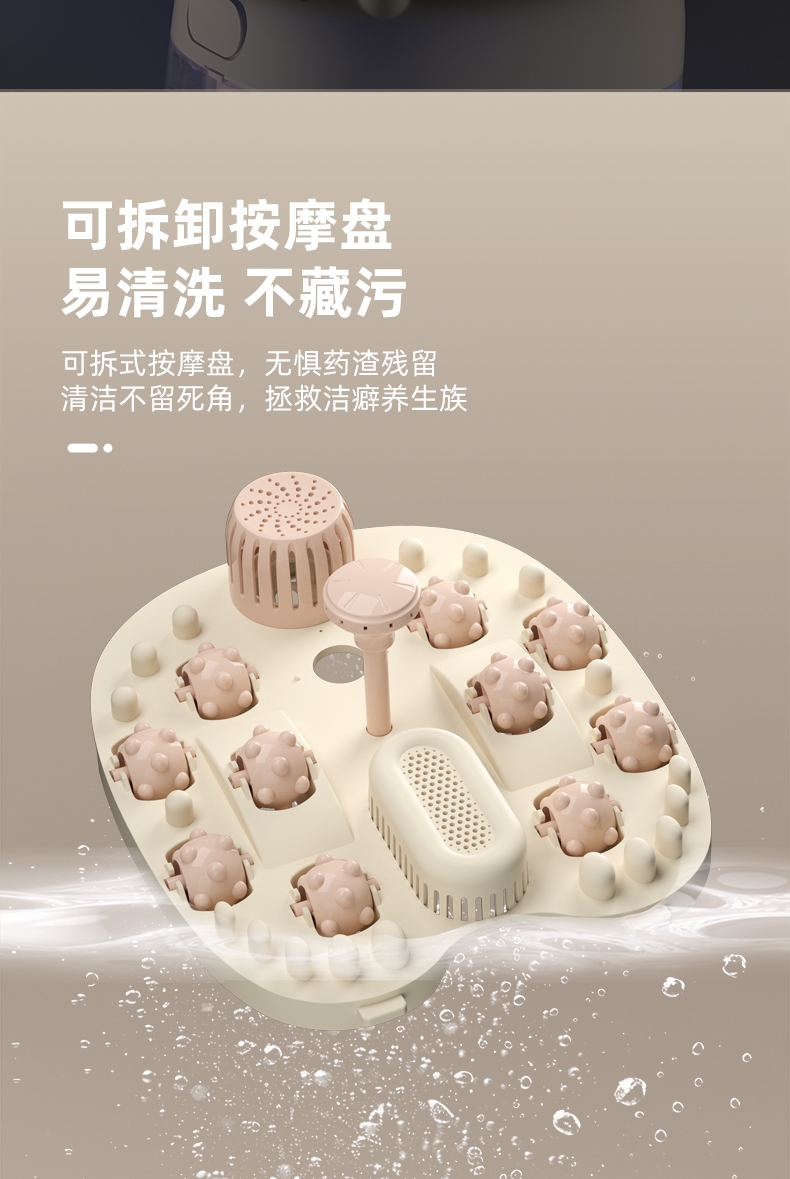 喷淋冲浪,体验足浴真实感;可拆卸按摩盘,易清洗 ;凸珠+药盒+喷淋,养生按摩更健康