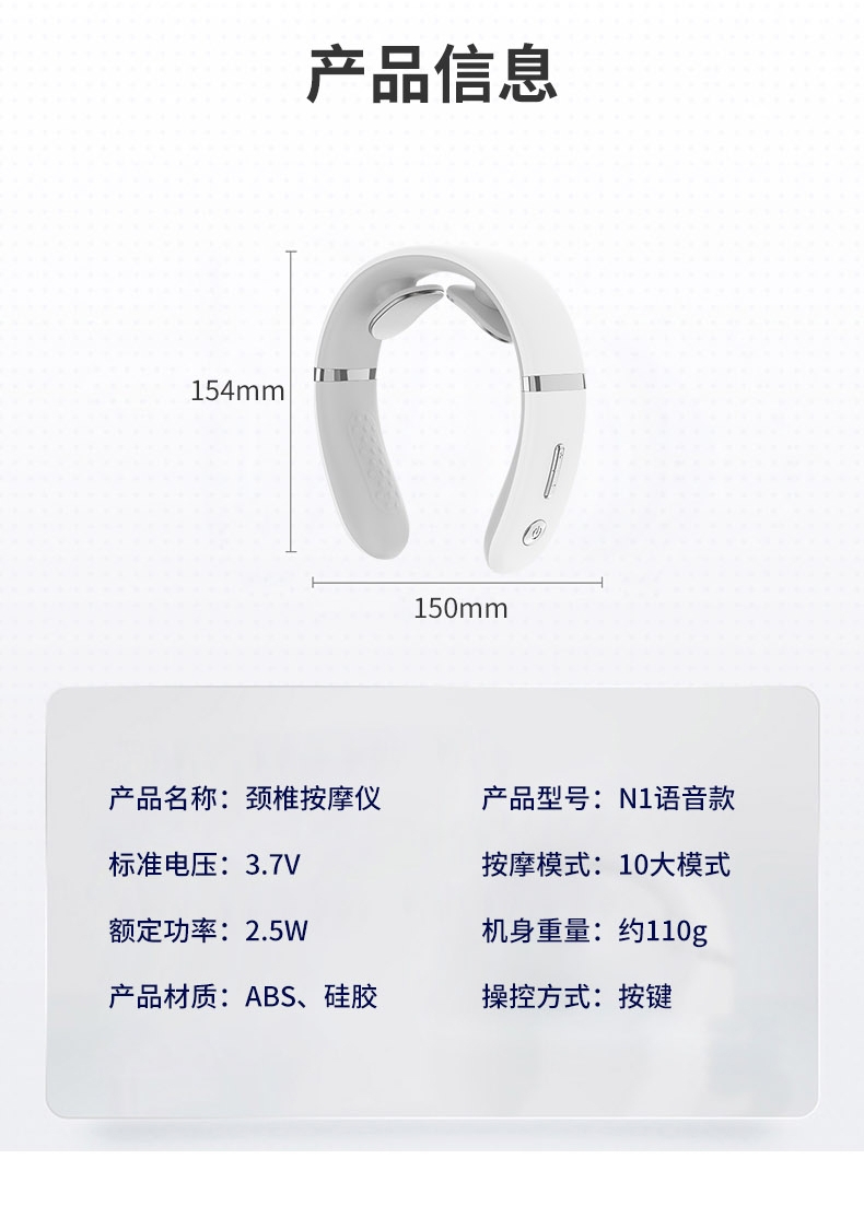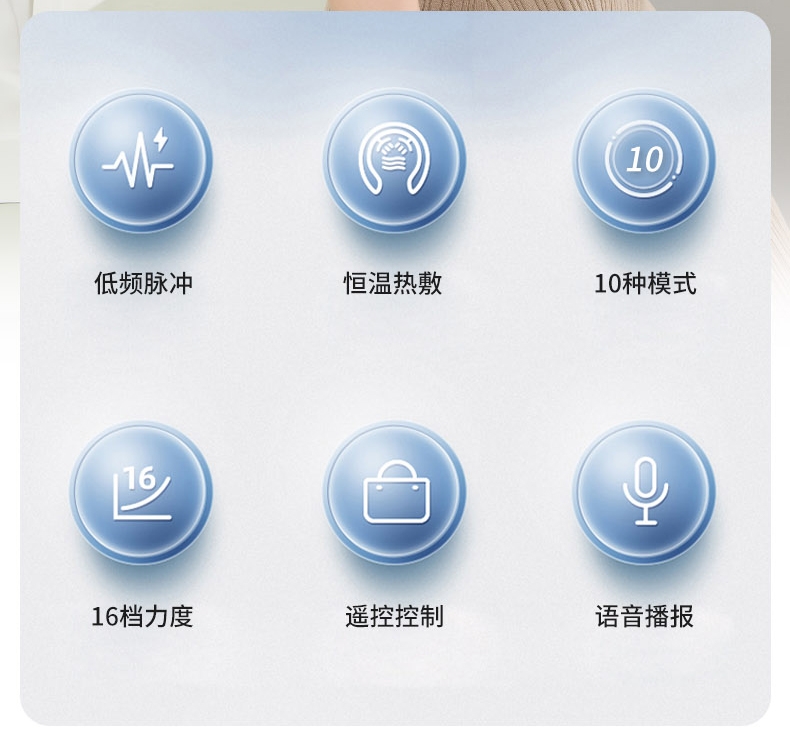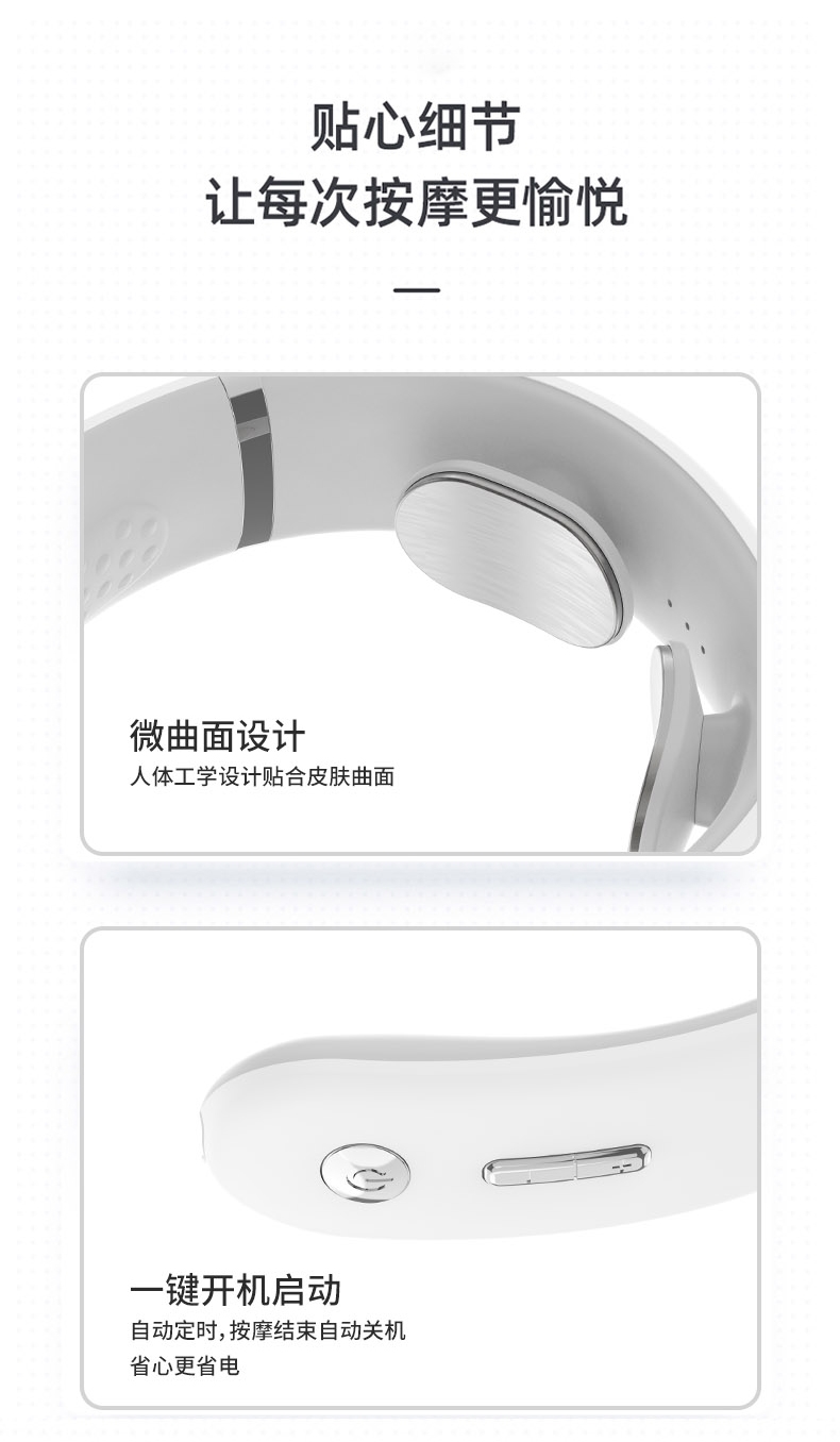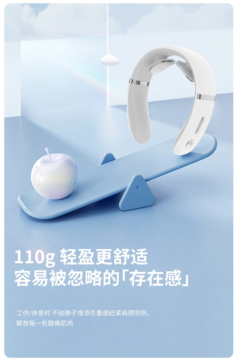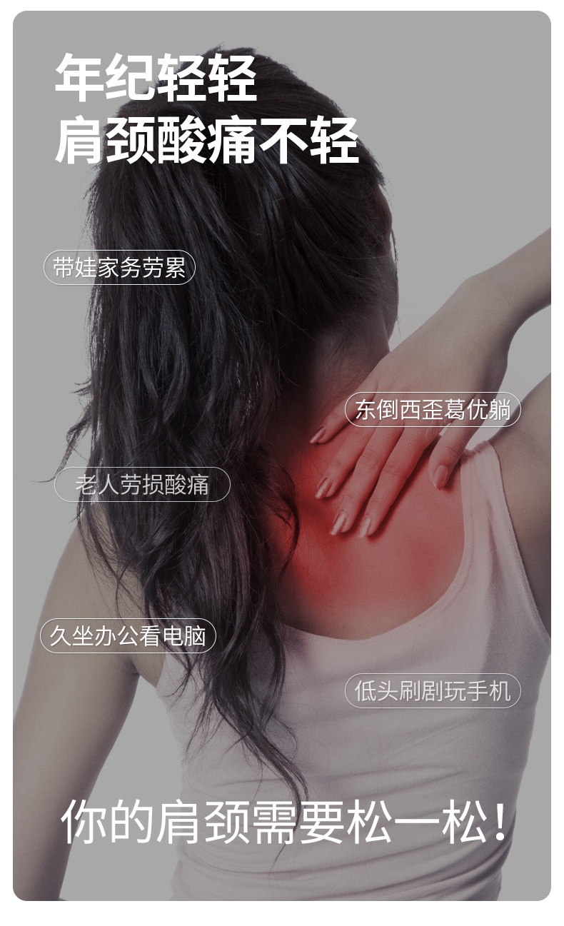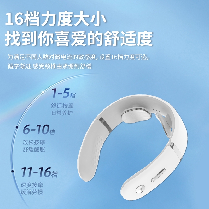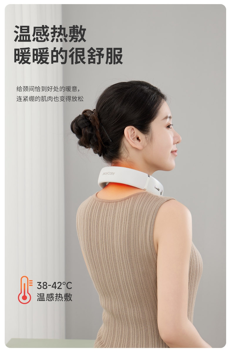 按键操控,语音播报,使用方便;42°恒温热敷,像热毛巾一样敷走疲惫;16档力度脉冲,深入刺激颈部,缓解疲劳酸痛
