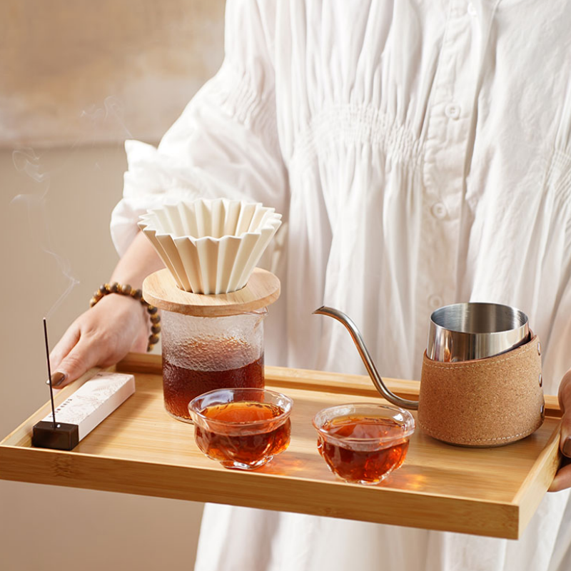 配置清单:竹制托盘x1,不锈钢手冲咖啡壶x1,咖啡线香x1,核桃纹品茗杯x1,折纸滤杯x1,竹托x1,玻璃分享杯x1