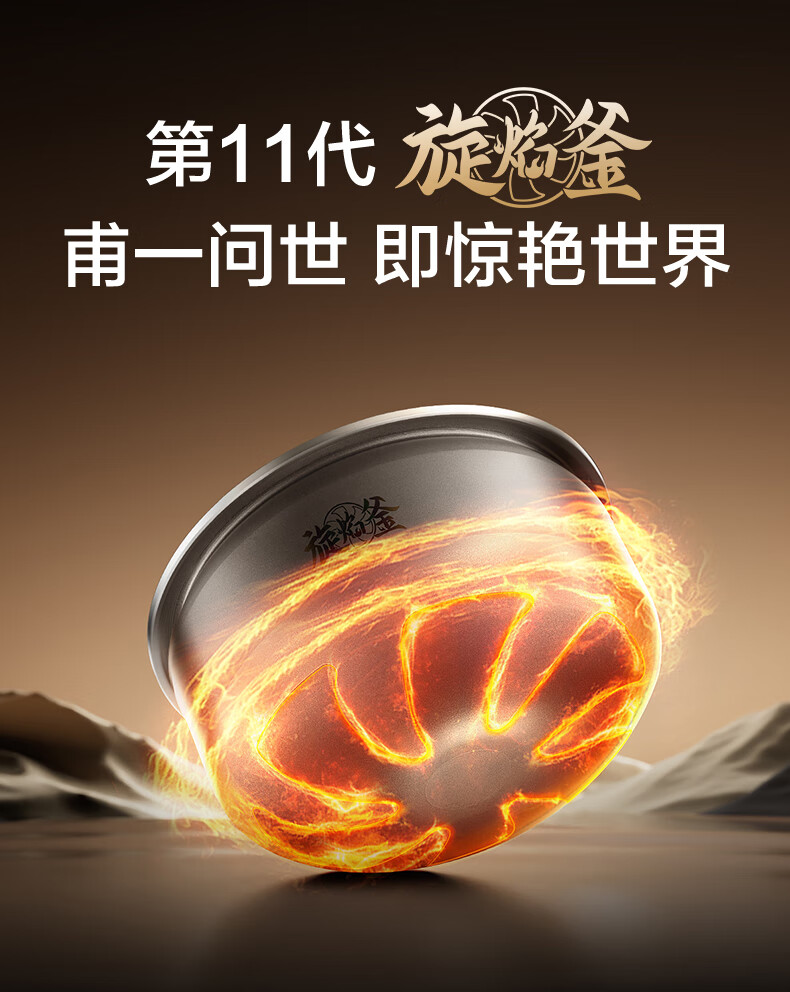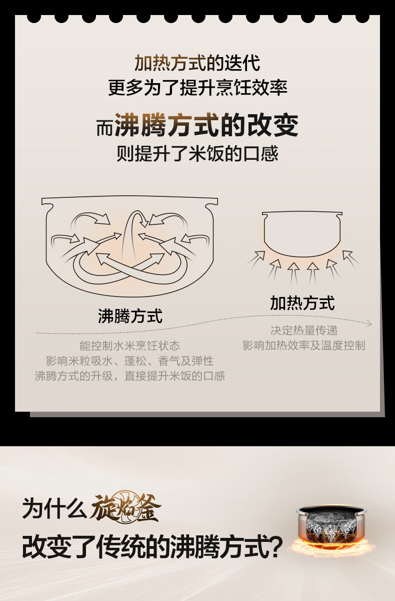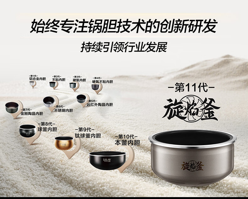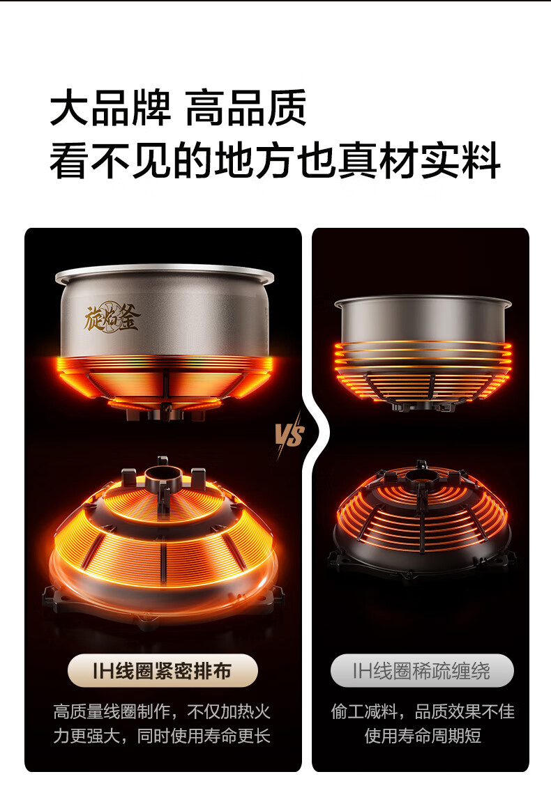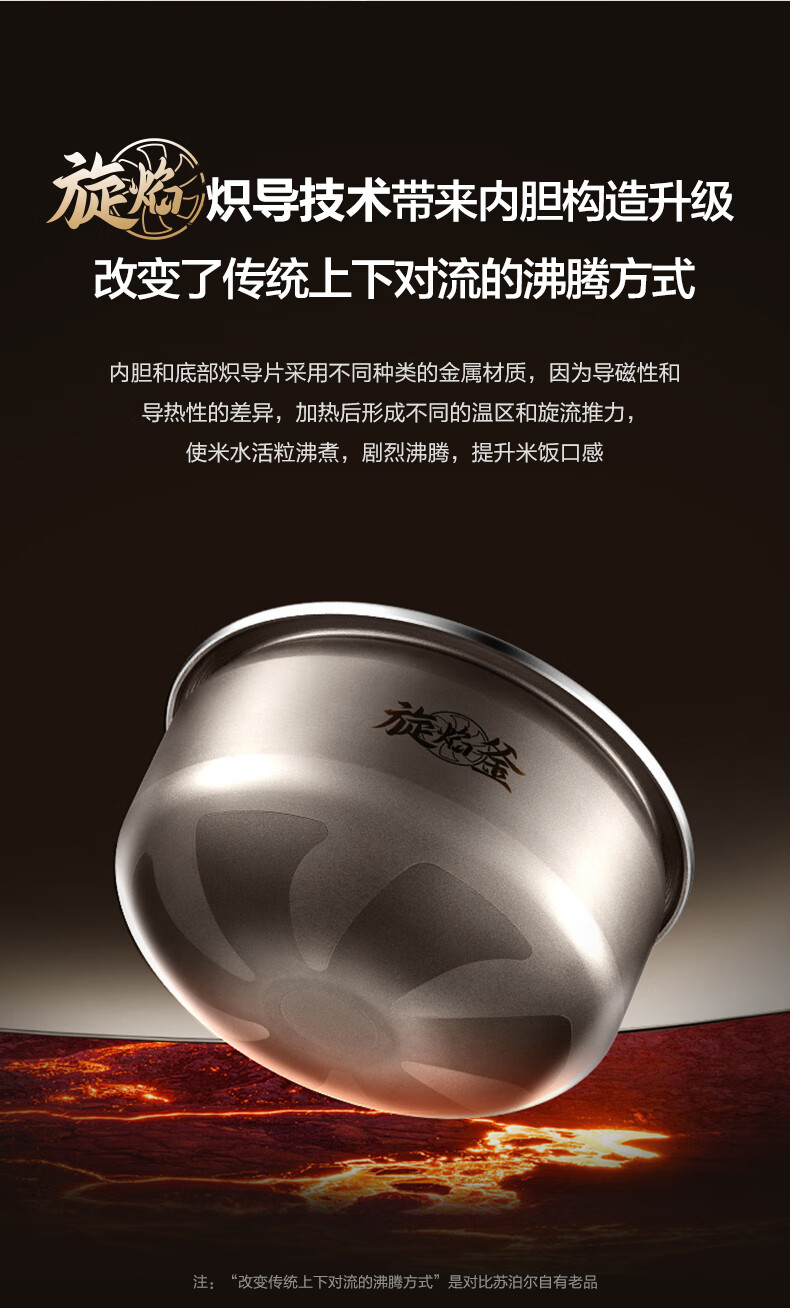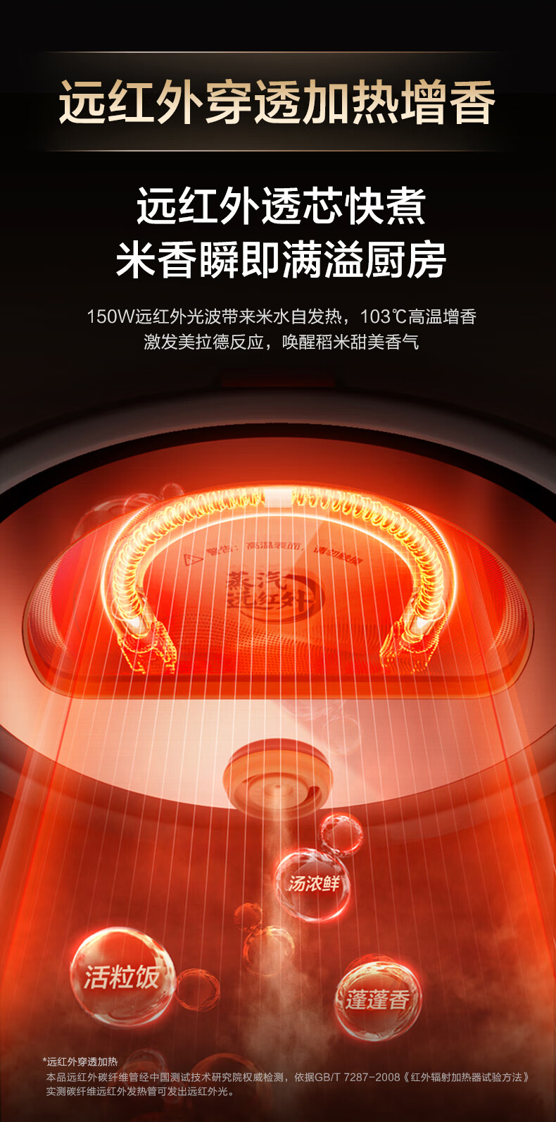 4.0mm旋焰釜,10年耐用,1级不粘;旋焰炽导技术,米饭活粒烹煮;远红外穿透加热,透芯增香