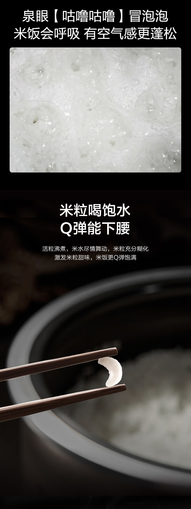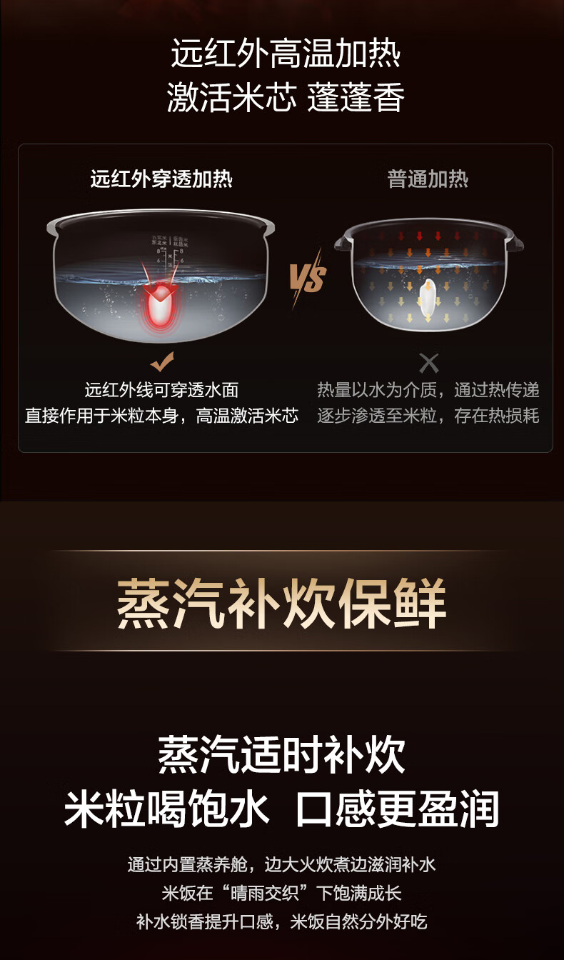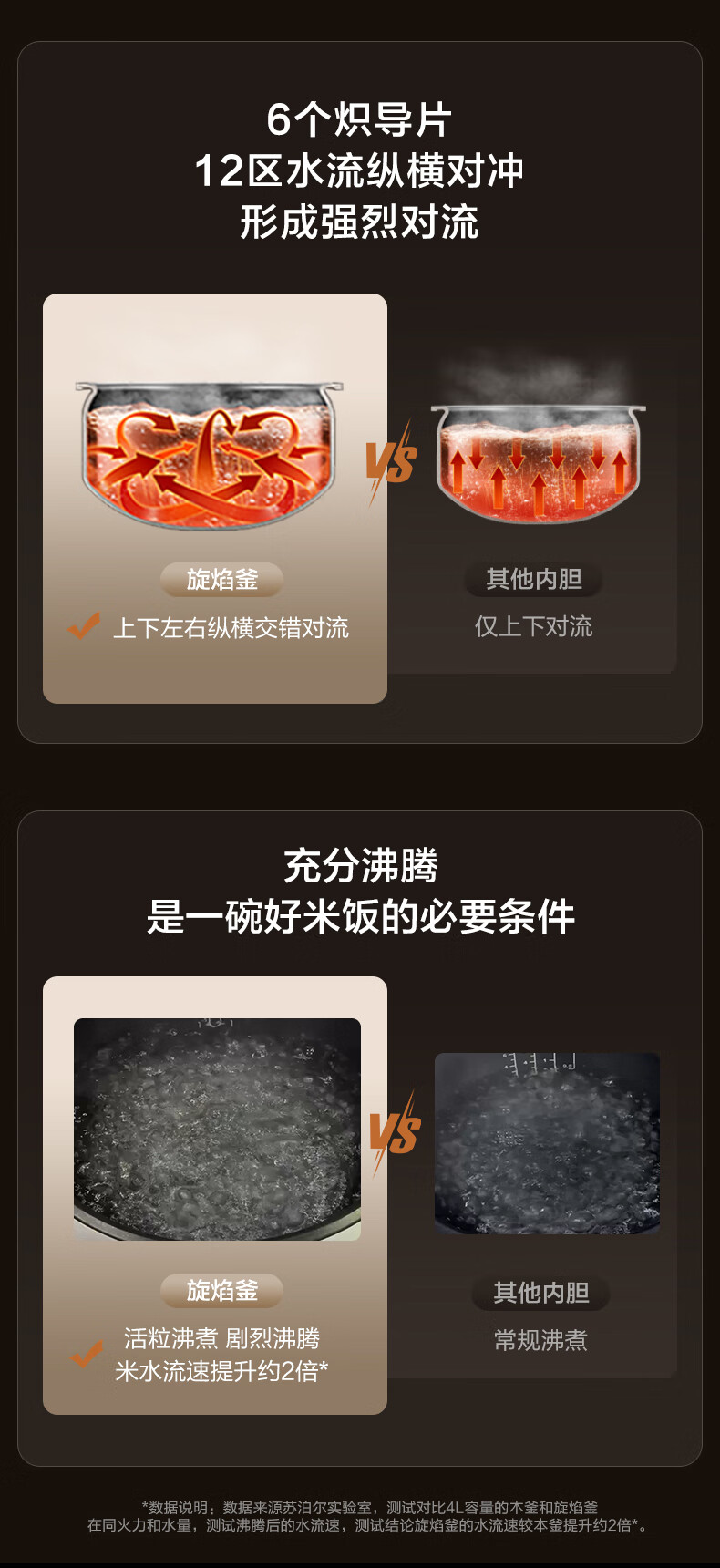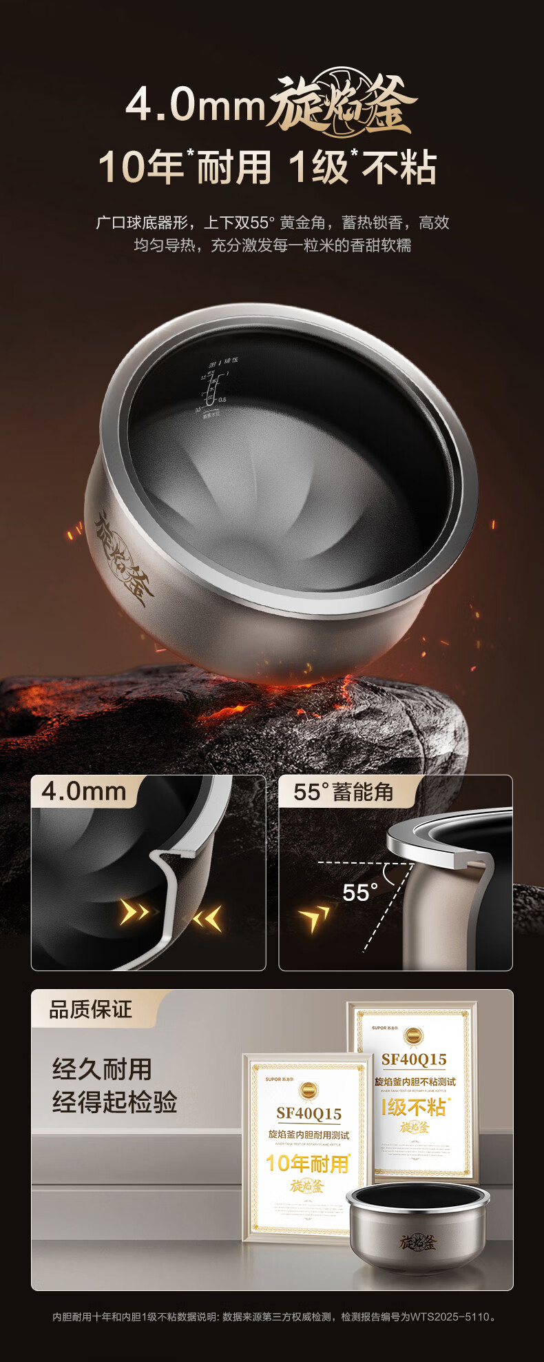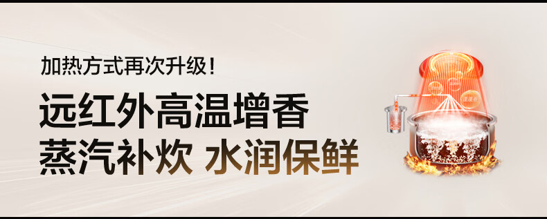 4.0mm旋焰釜,10年耐用,1级不粘;旋焰炽导技术,米饭活粒烹煮;远红外穿透加热,透芯增香