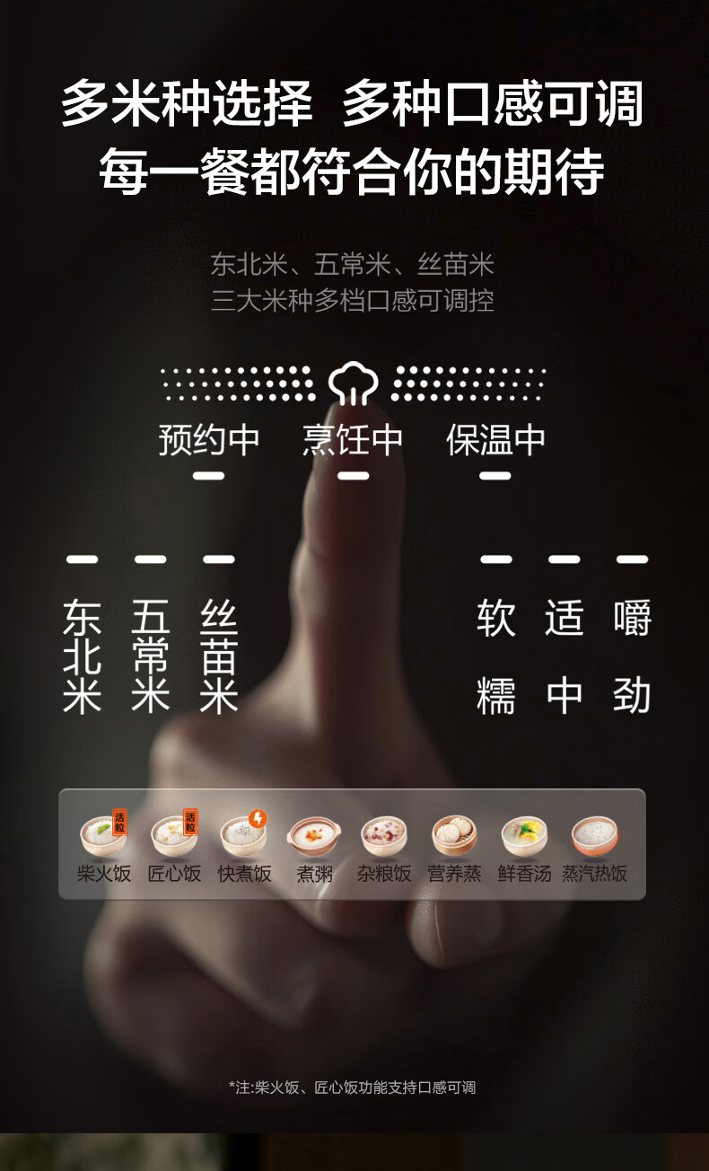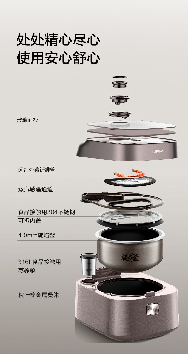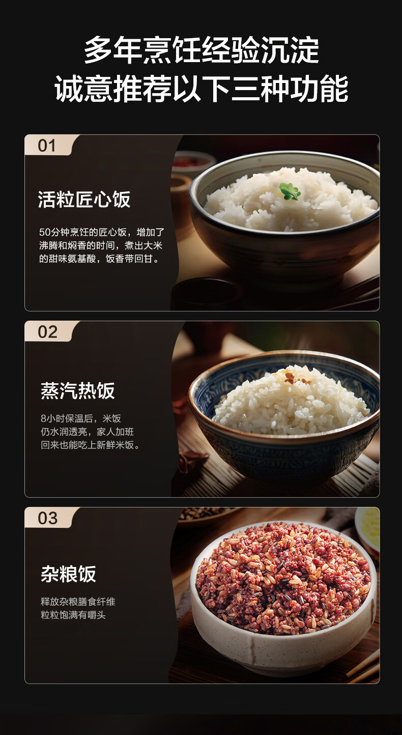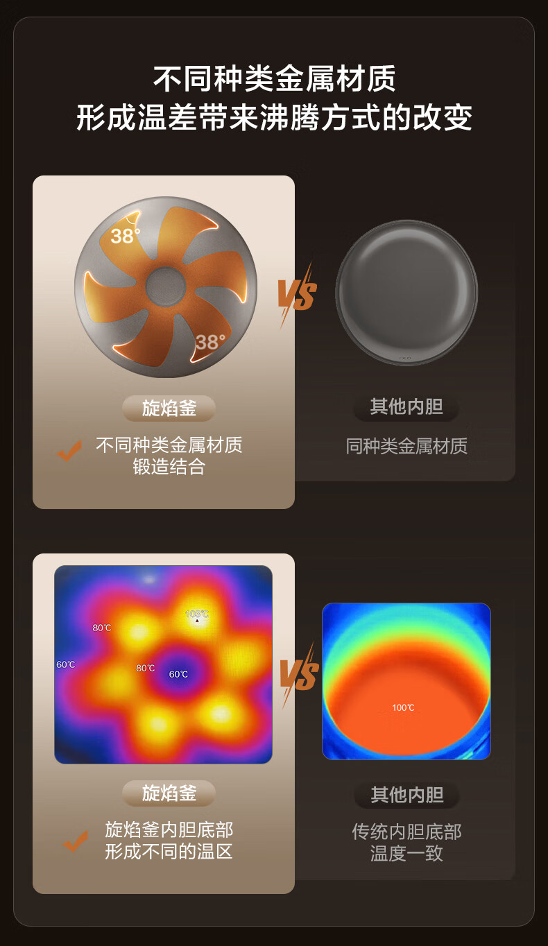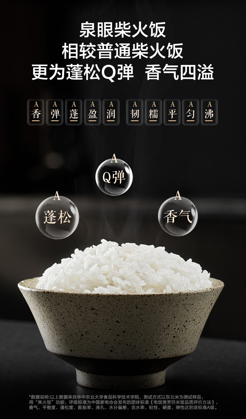 4.0mm旋焰釜,10年耐用,1级不粘;旋焰炽导技术,米饭活粒烹煮;远红外穿透加热,透芯增香