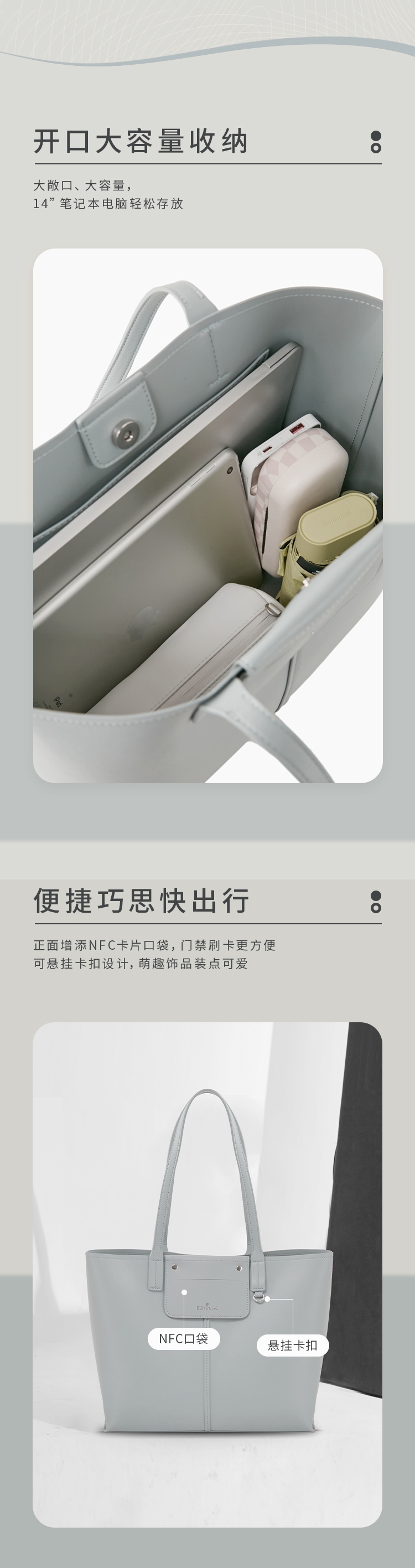 开口大容量收纳,14寸笔记本电脑轻松存放;便捷巧思快出行正面添加NFC卡片口袋门禁刷卡更方便;轻盈上肩易背负,pu皮打造轻量包体,久背不累