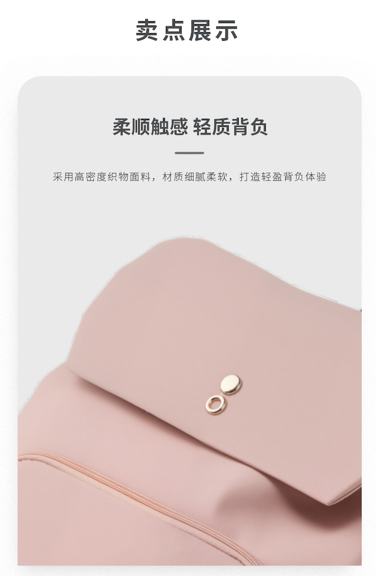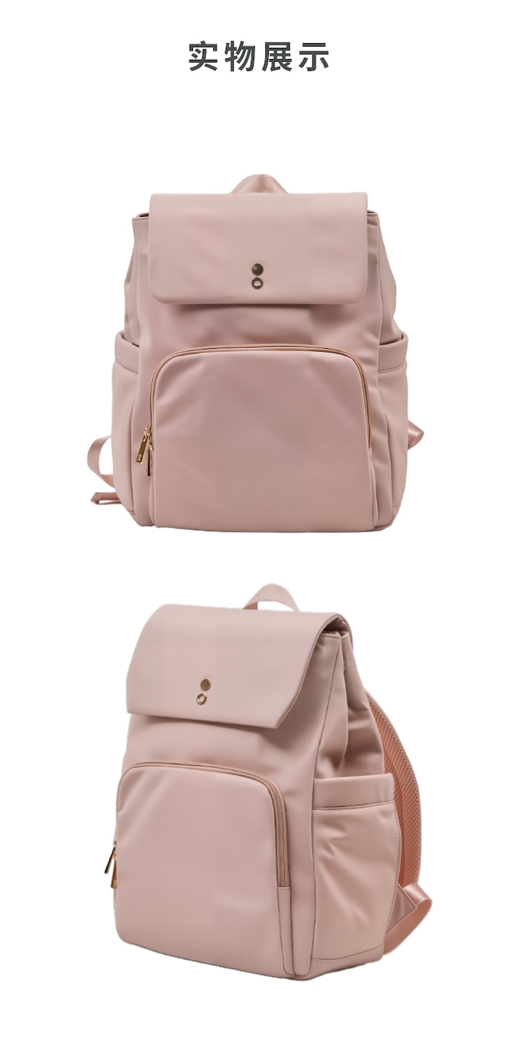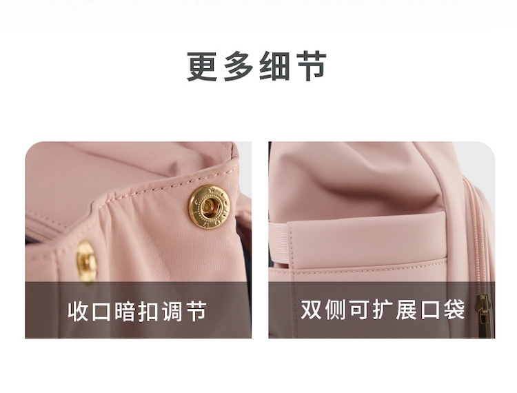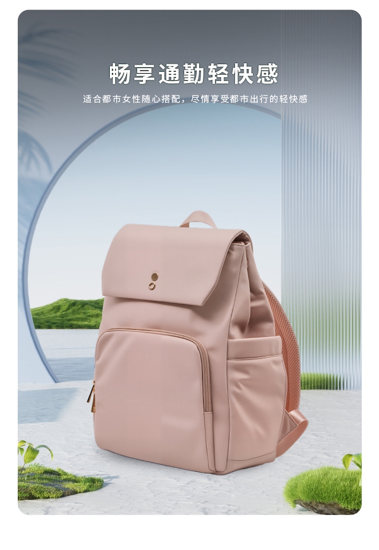 包面采用优质细腻面料,材质细腻柔软,打造轻盈背负体;内里可放14寸电脑拉链封口防物品掉落满足通勤需要;双侧可扩展口袋,日常随时拿取