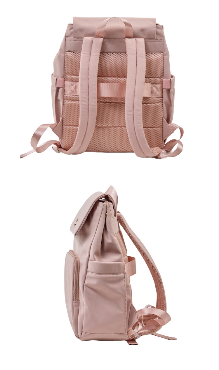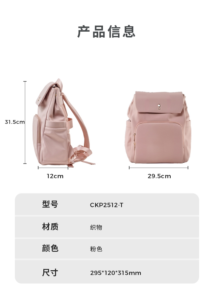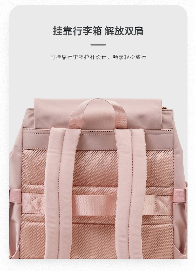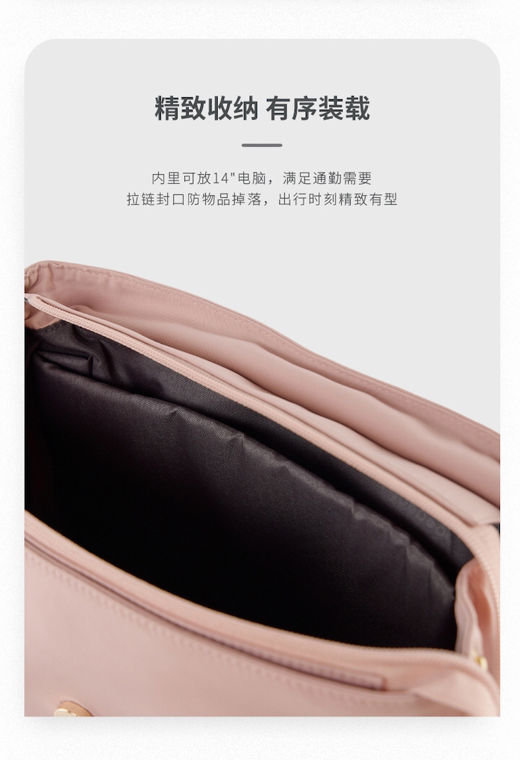 包面采用优质细腻面料,材质细腻柔软,打造轻盈背负体;内里可放14寸电脑拉链封口防物品掉落满足通勤需要;双侧可扩展口袋,日常随时拿取