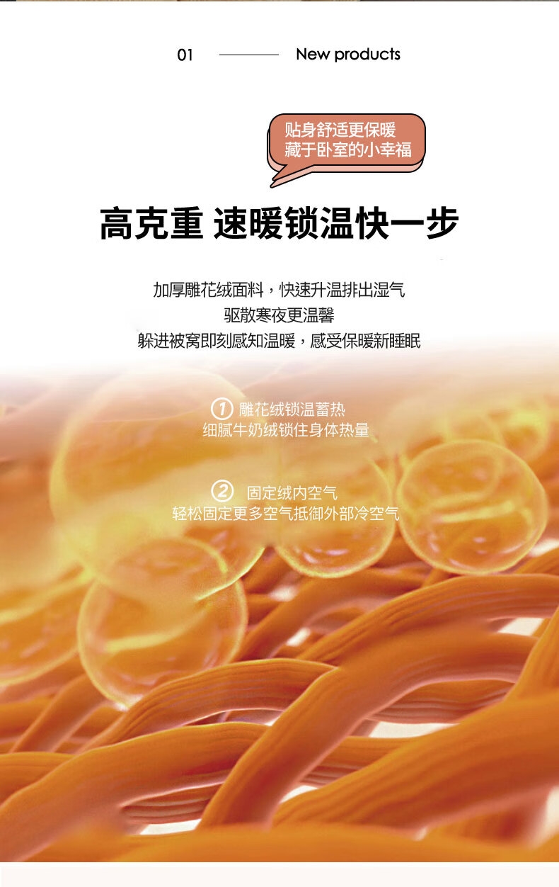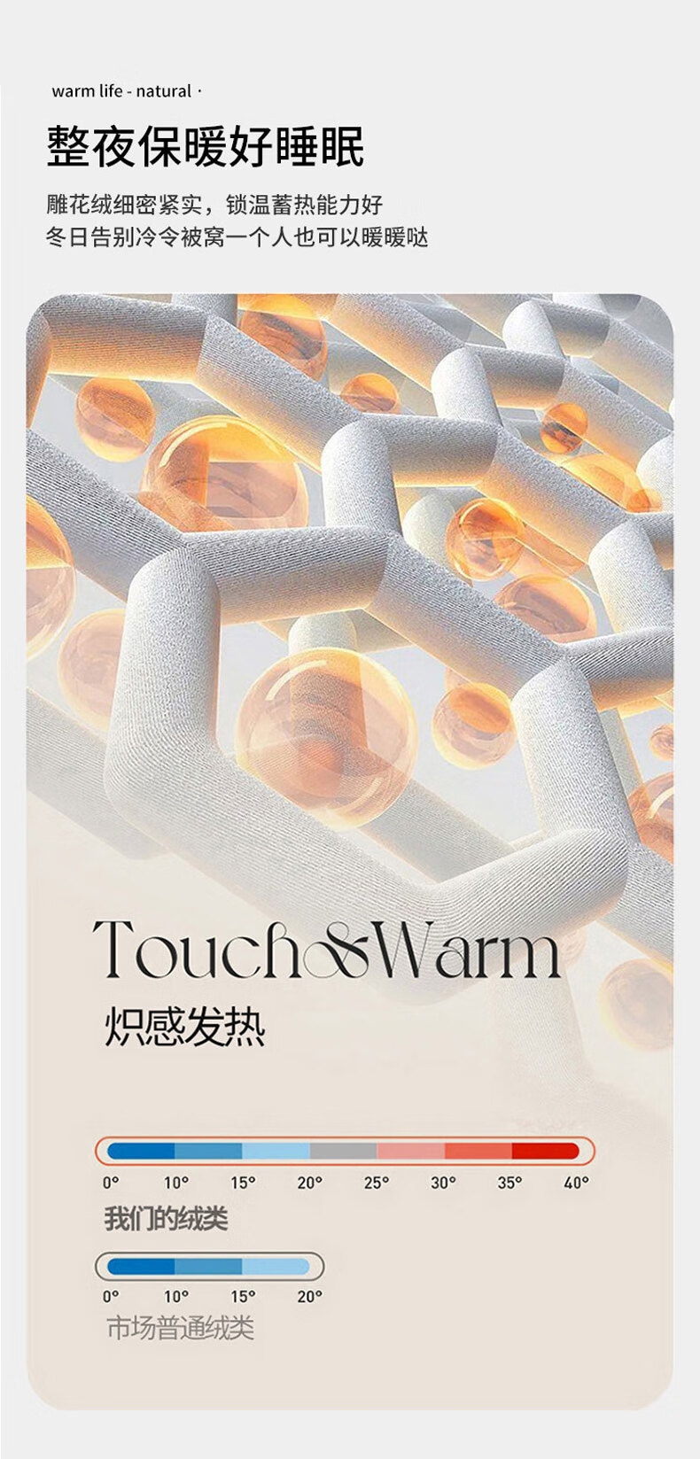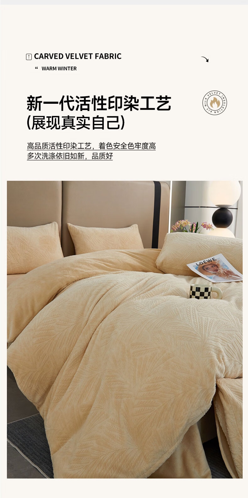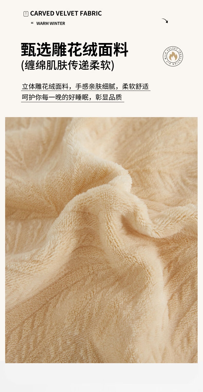 甄选立体雕花绒面料,手感亲肤细腻,柔软舒适;加厚高克重面料,速暖锁温快一步,驱散寒夜更温馨;绒毛细长密集,顺滑舒适,保暖性好