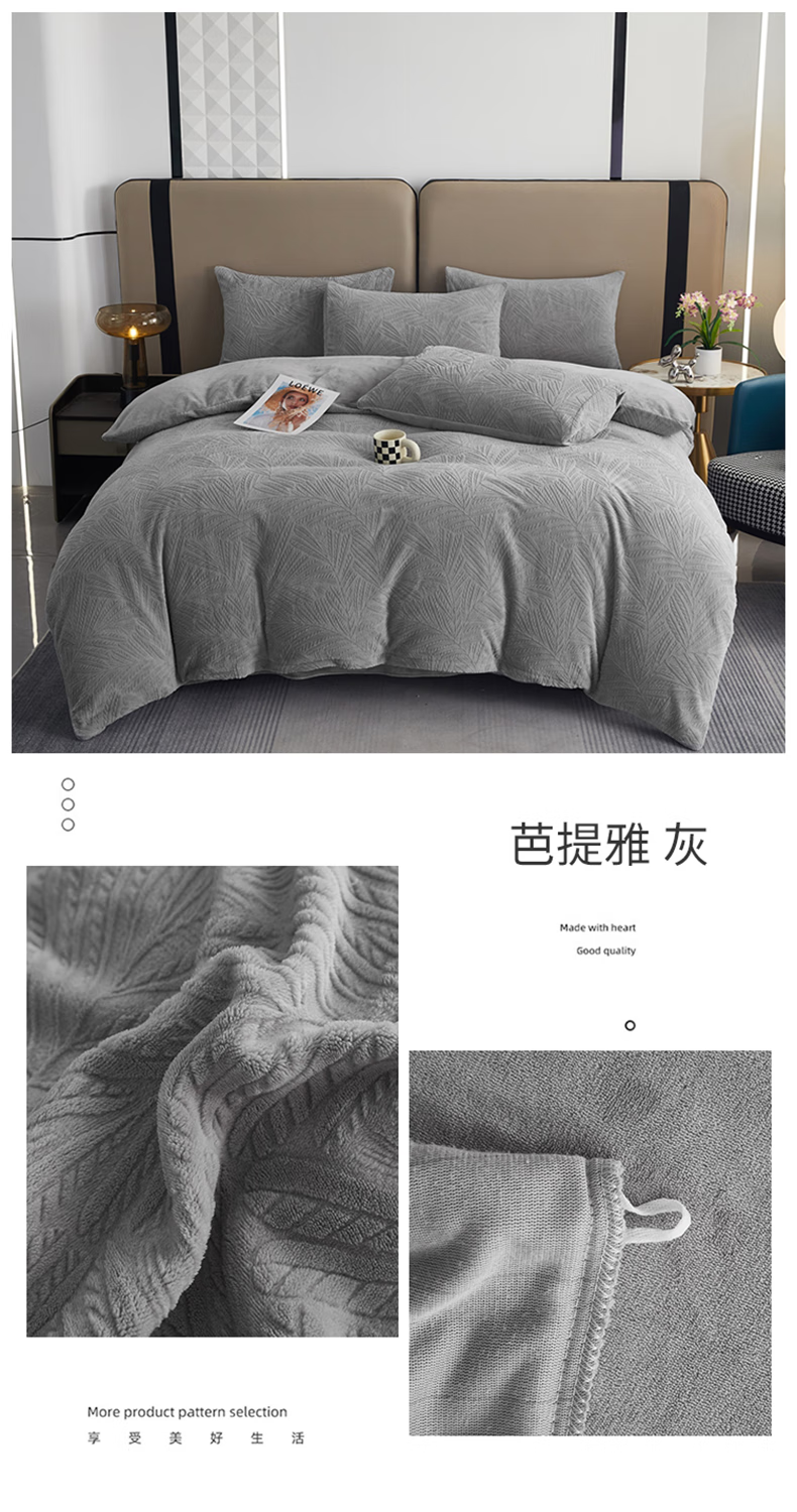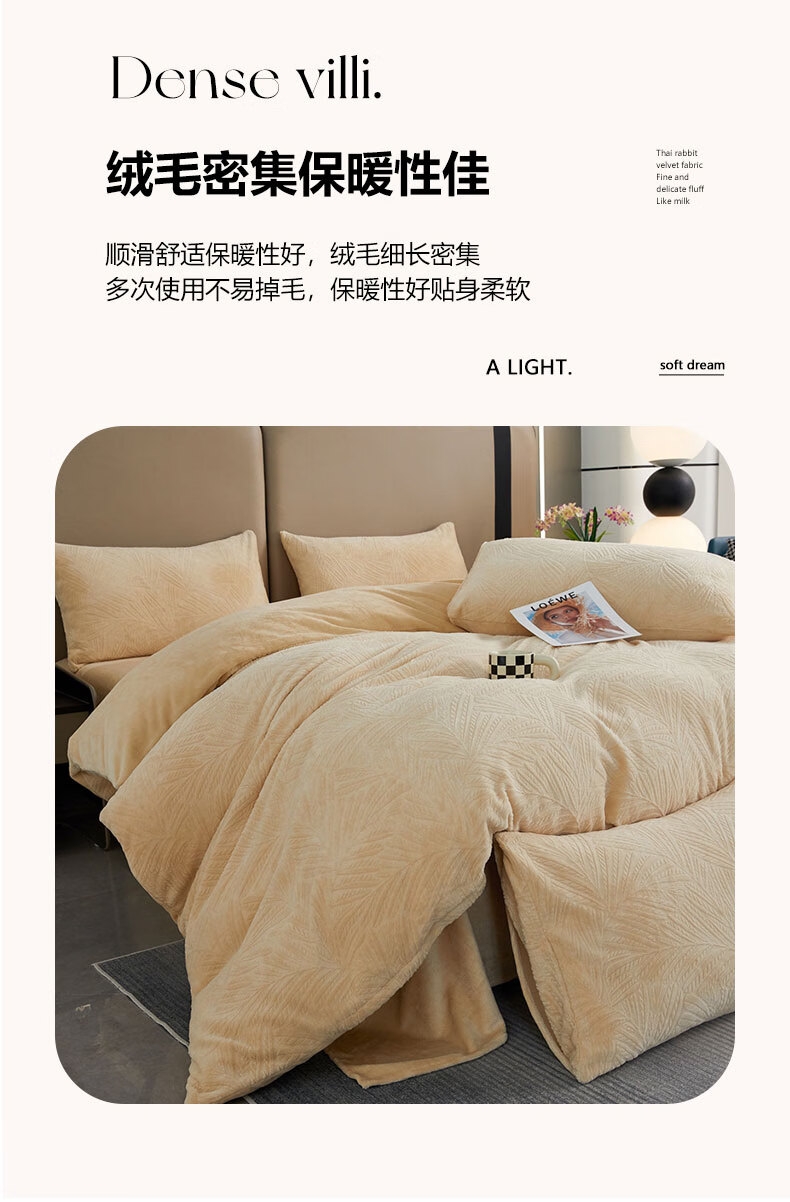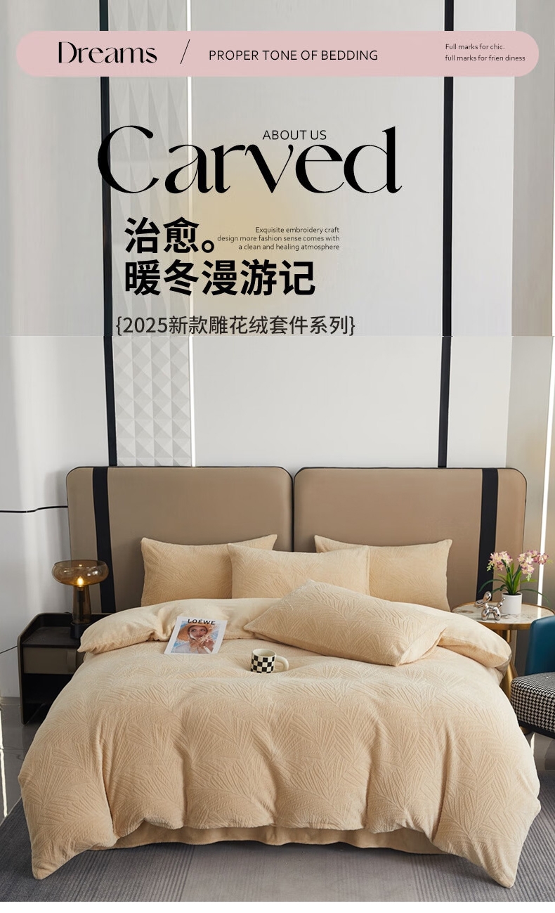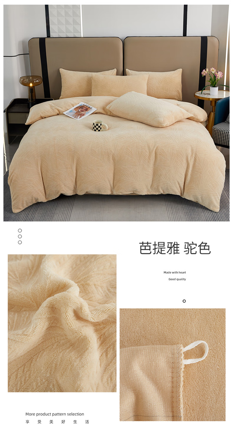 甄选立体雕花绒面料,手感亲肤细腻,柔软舒适;加厚高克重面料,速暖锁温快一步,驱散寒夜更温馨;绒毛细长密集,顺滑舒适,保暖性好