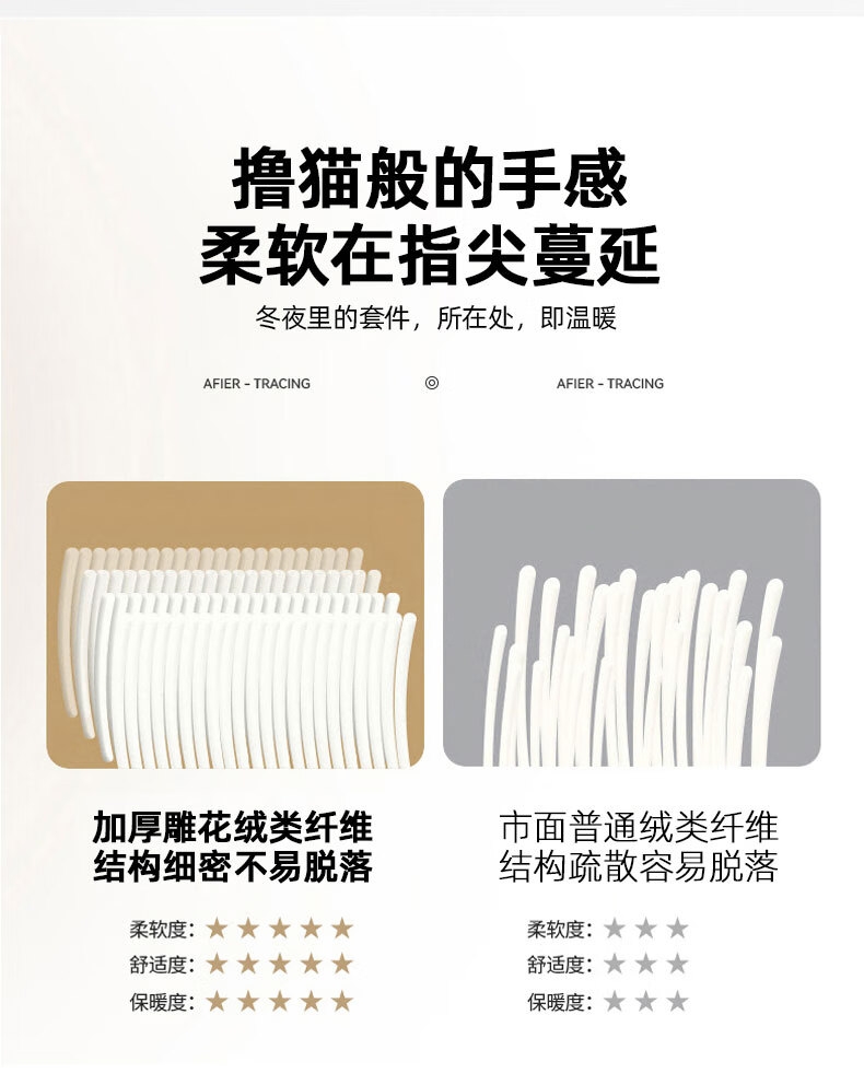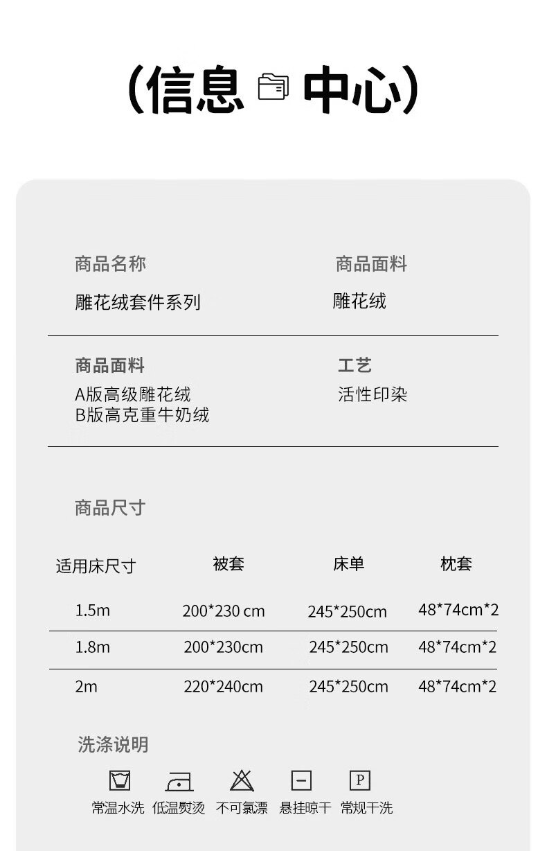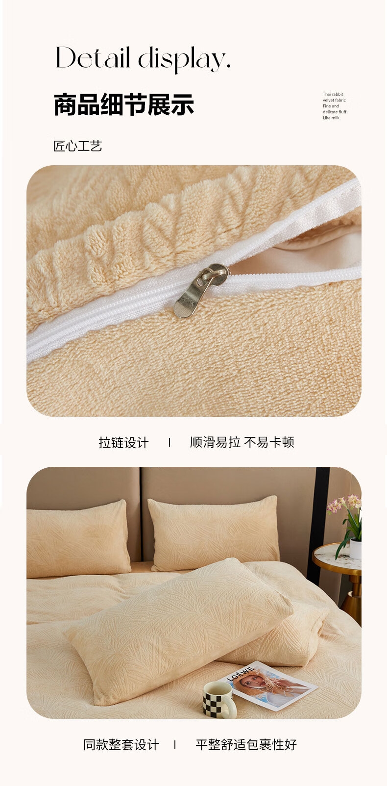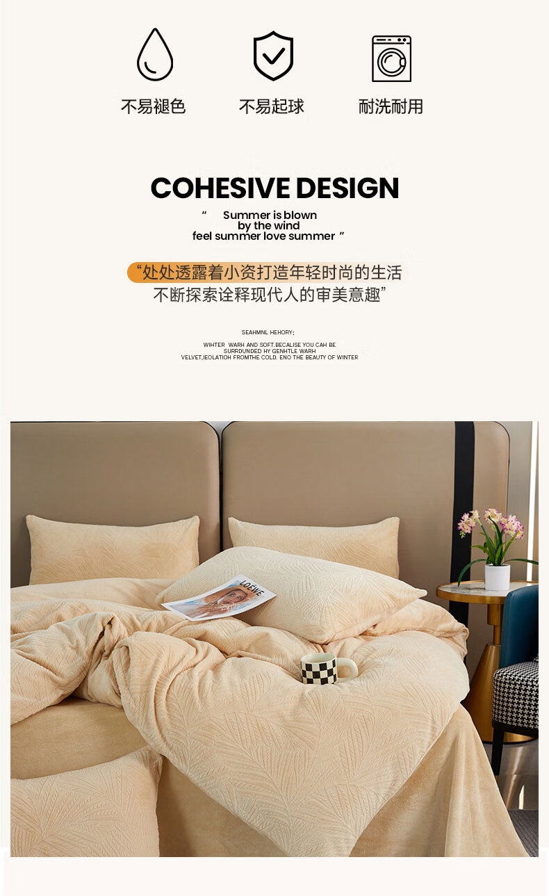 甄选立体雕花绒面料,手感亲肤细腻,柔软舒适;加厚高克重面料,速暖锁温快一步,驱散寒夜更温馨;绒毛细长密集,顺滑舒适,保暖性好