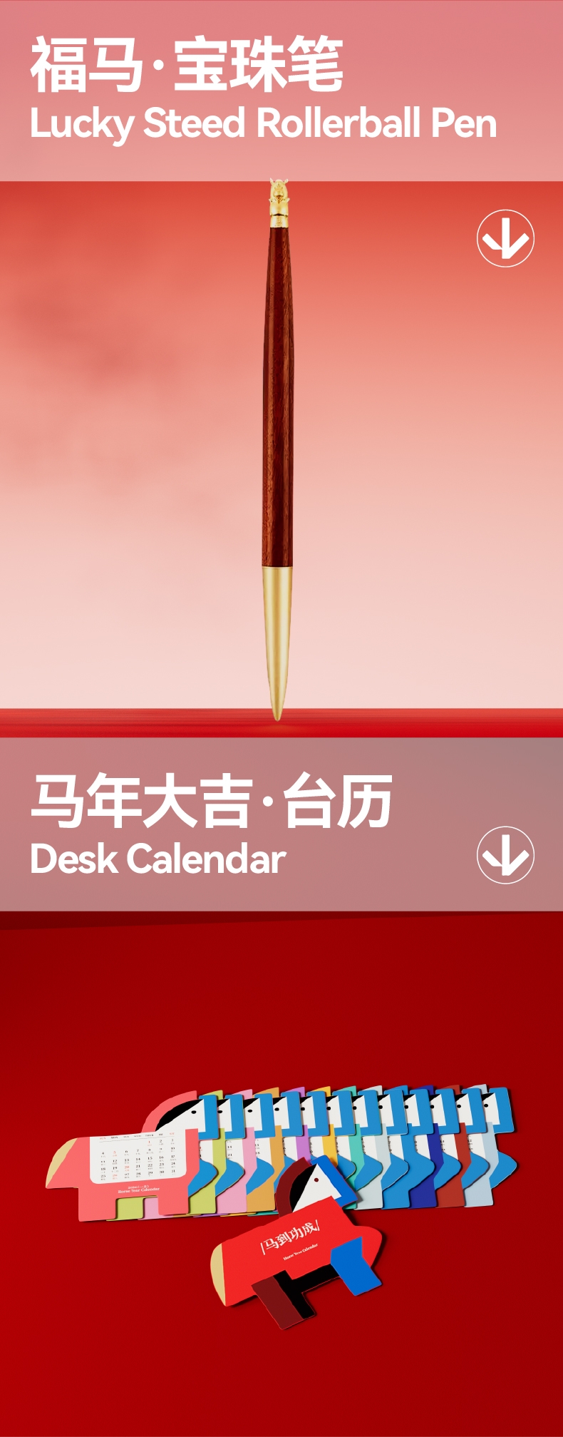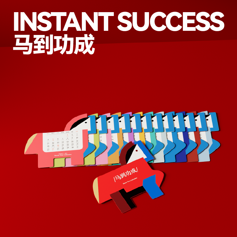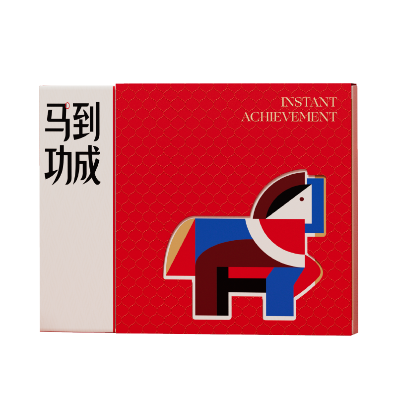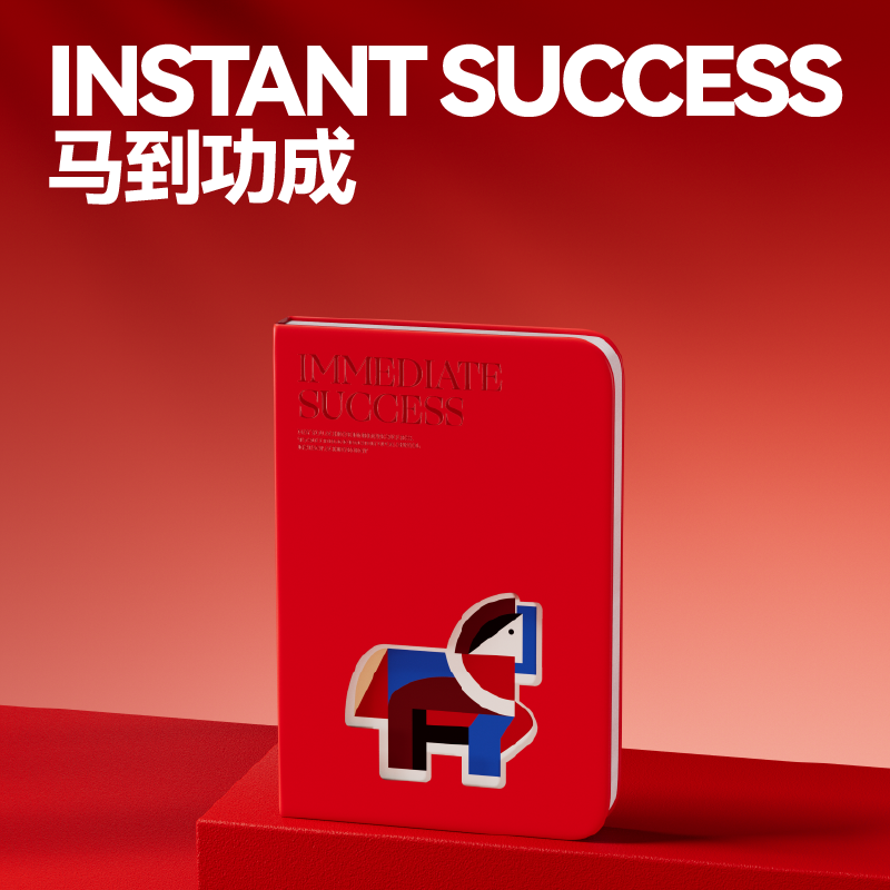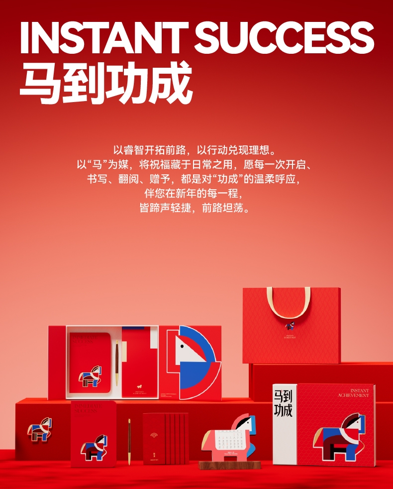 将东方生肖马的象凝练为棱角与曲度的共生体;选取笔记本笔磁吸铁台历红包等物品并非简单的物件堆砌;以“马”为媒,将祝福藏于日常之用