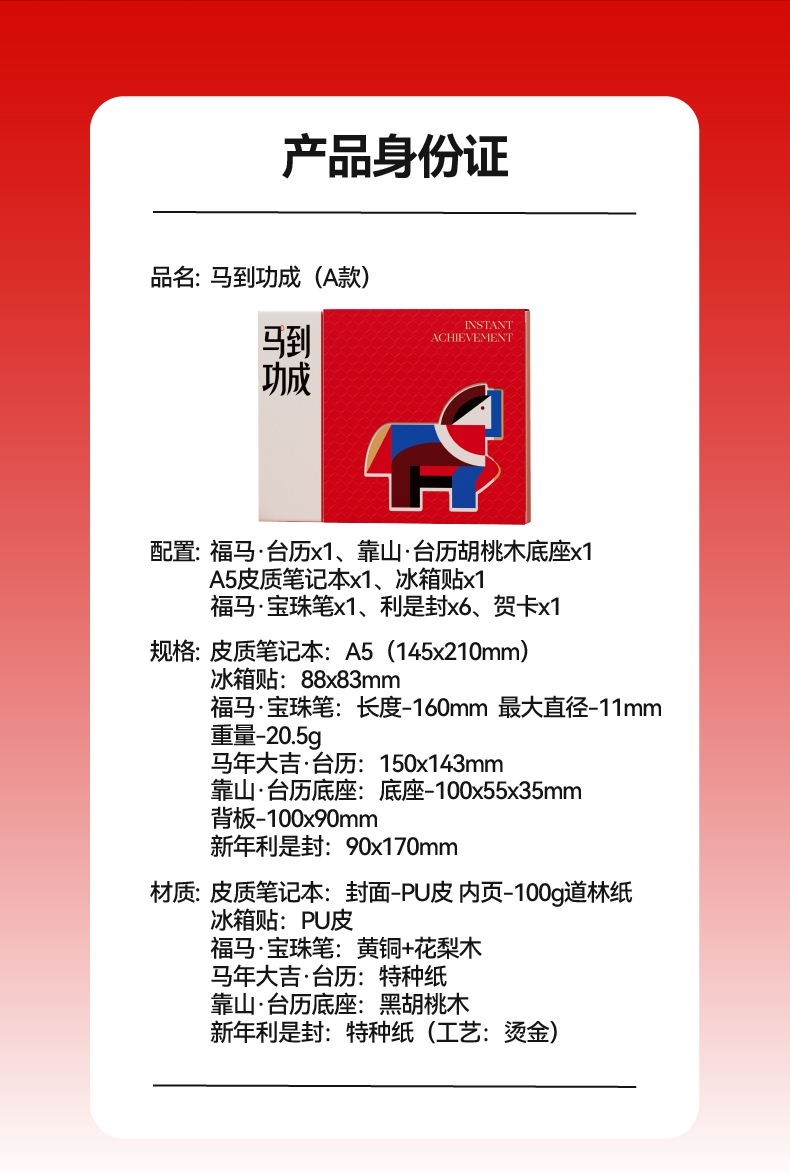配置清单:精装礼盒&手提袋 x1 福马·台历x1、冰箱贴x1 靠山·台历胡桃木底座(手机支架)x1 A5皮质笔记本x1、福马·宝珠笔x1 利是封x6、贺卡x1
