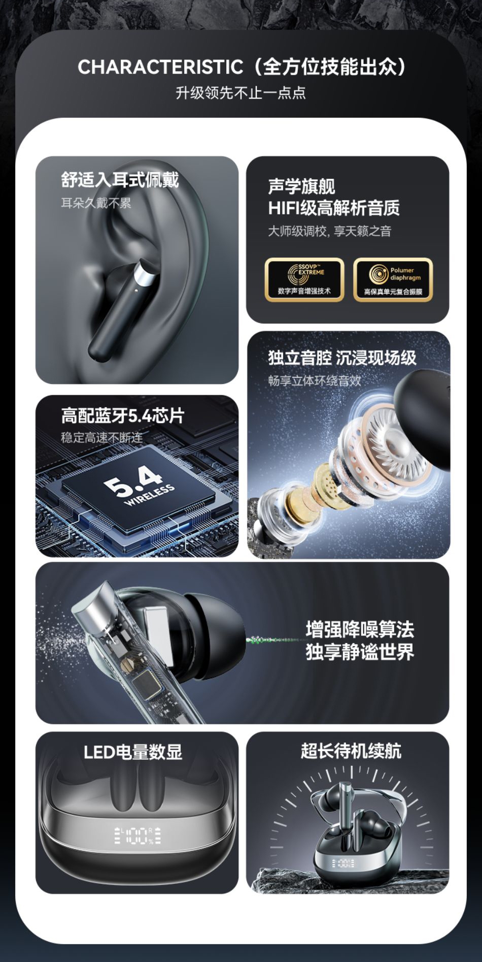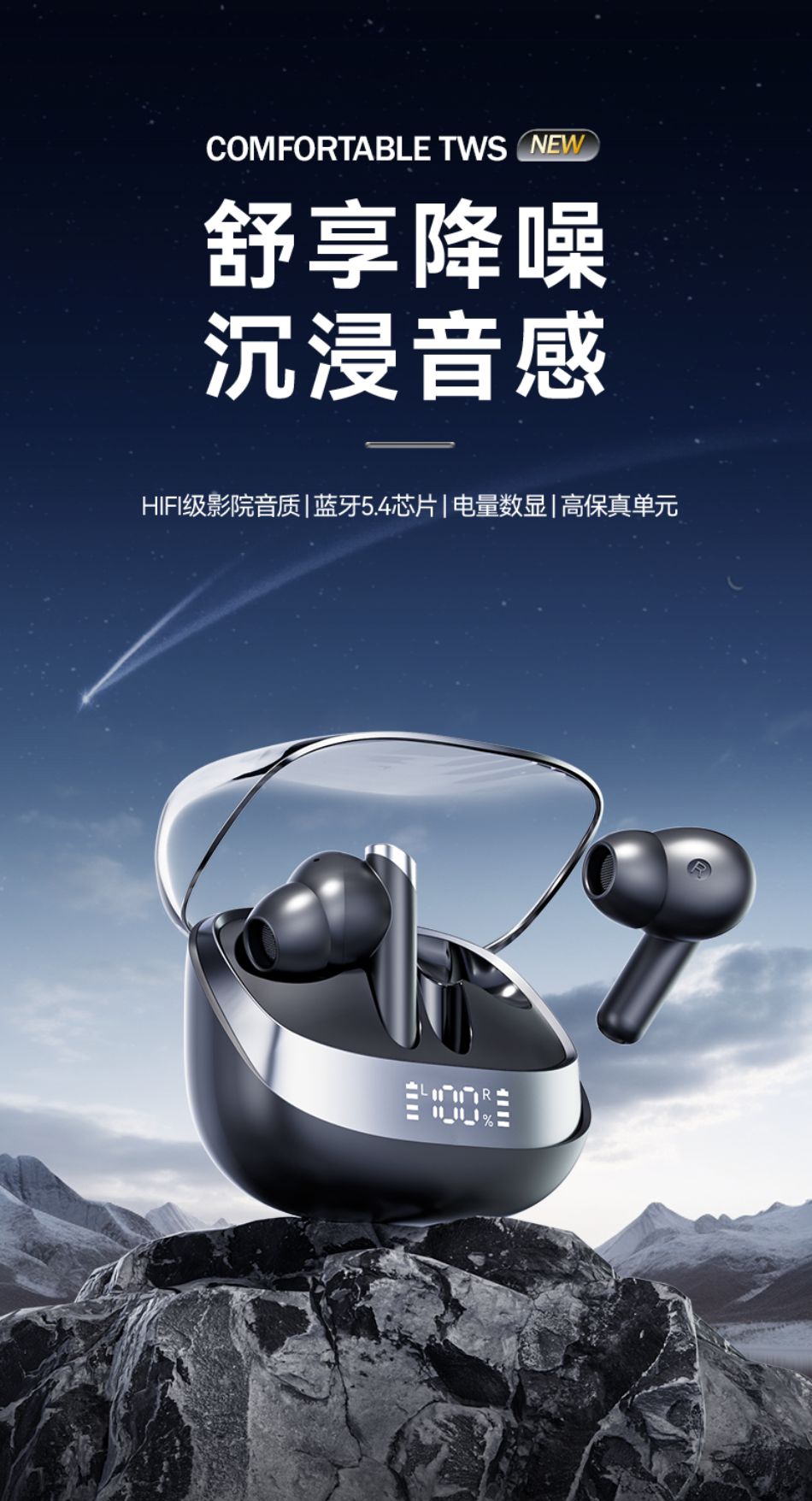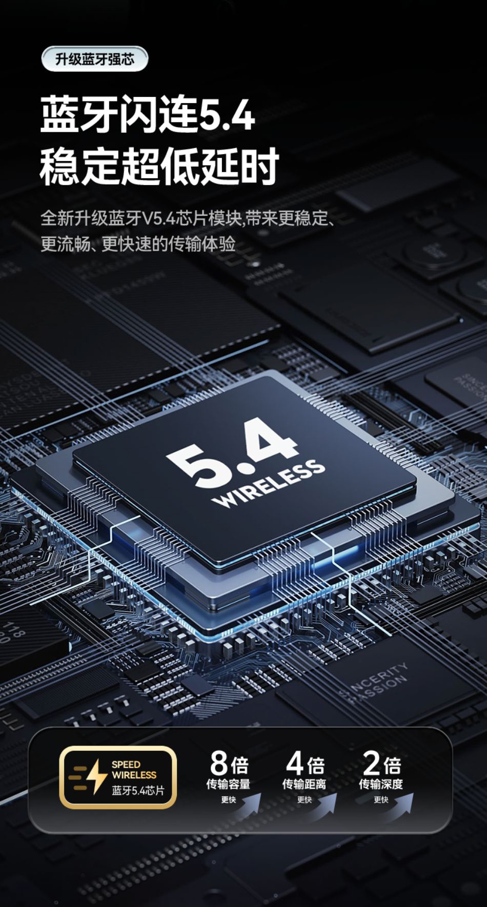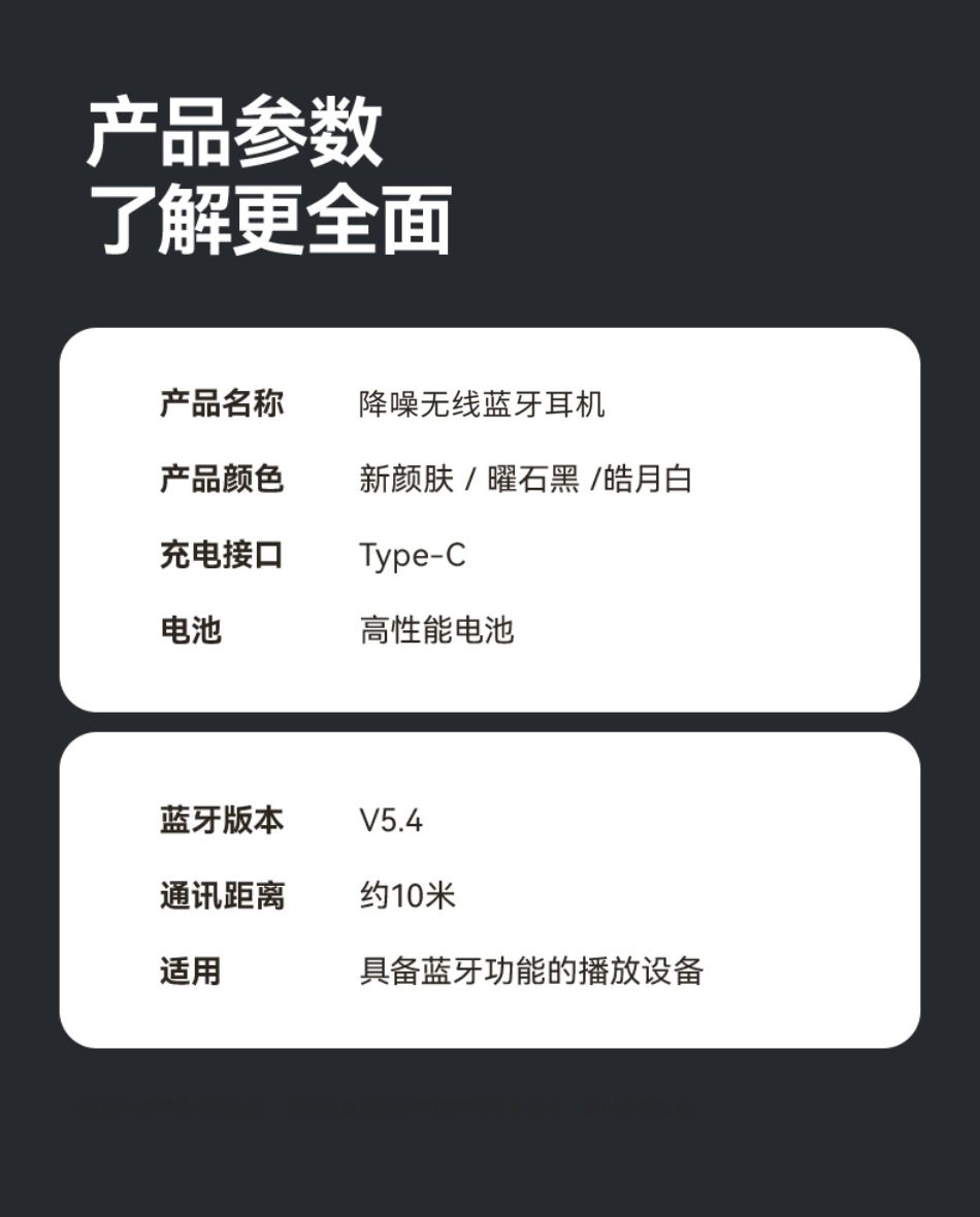 高配蓝牙5.4芯片 稳定高速不断连;智能电量数显 电量情况实时掌握;舒适入耳式佩戴 耳朵久戴不累