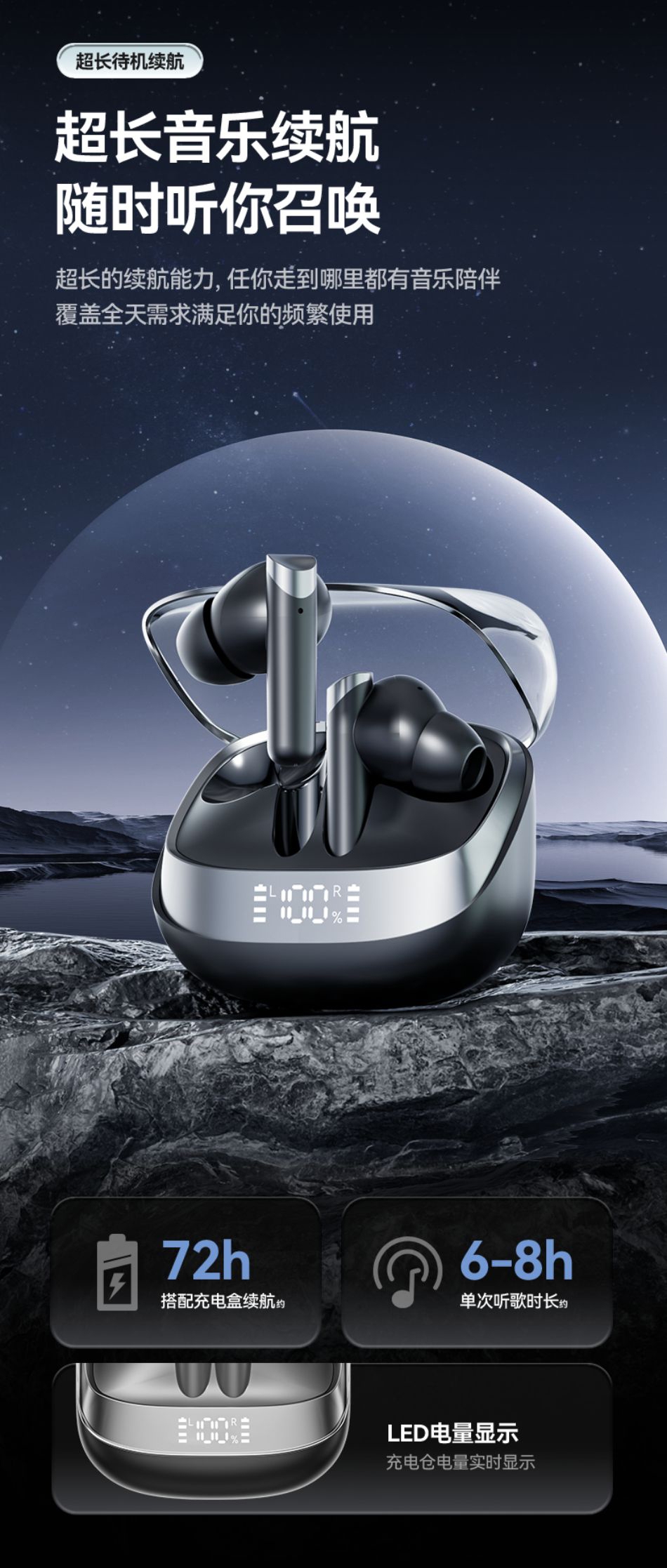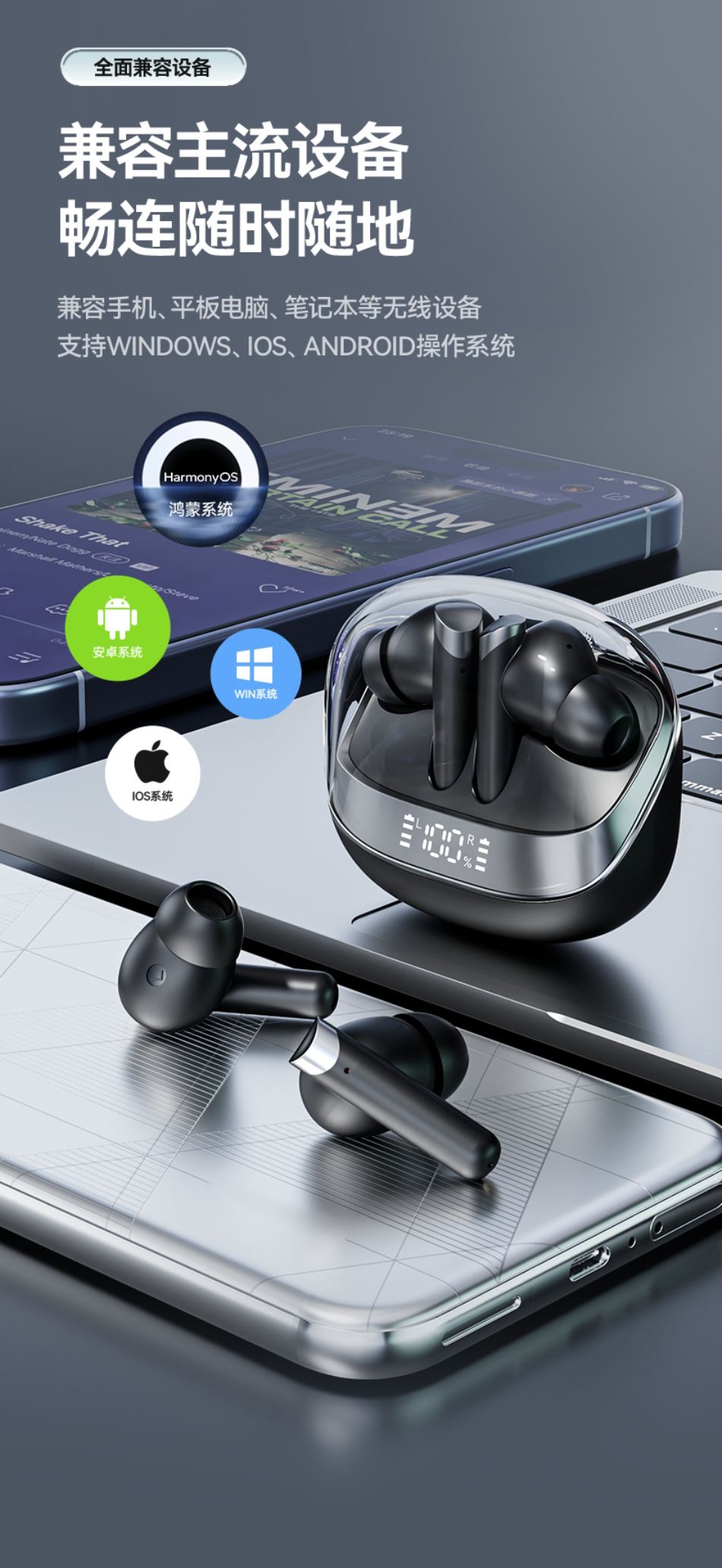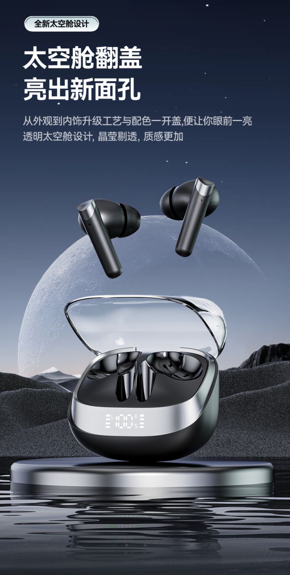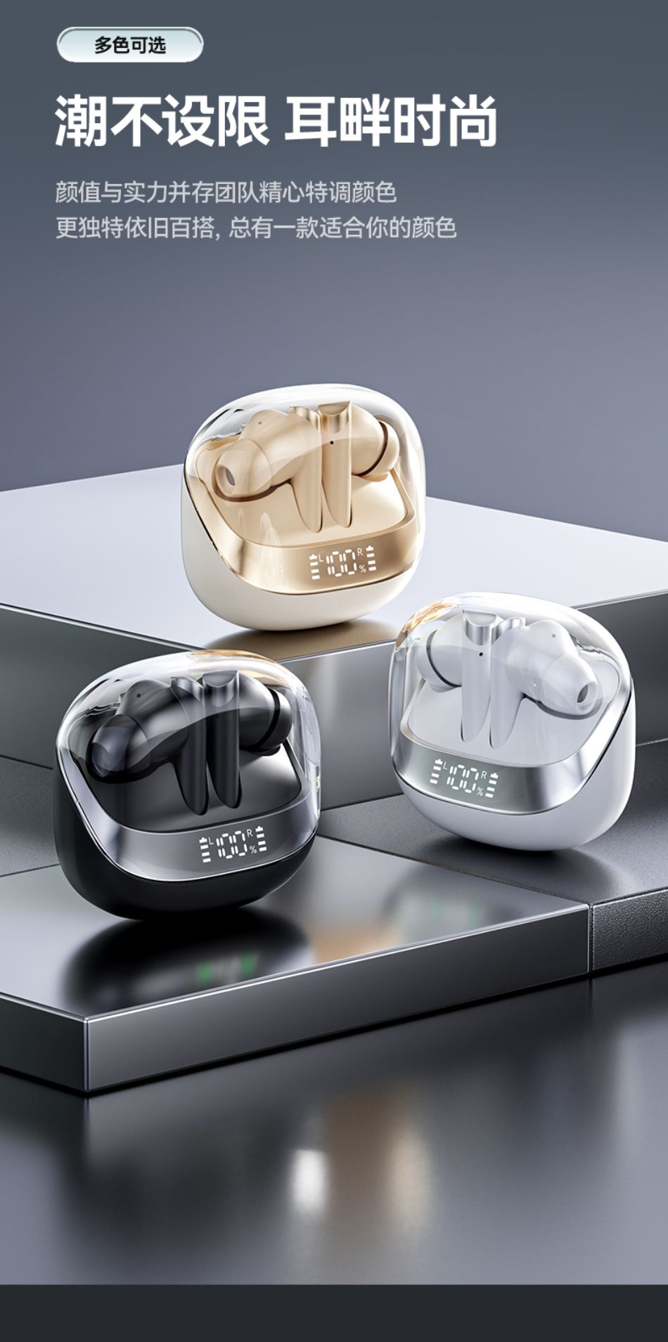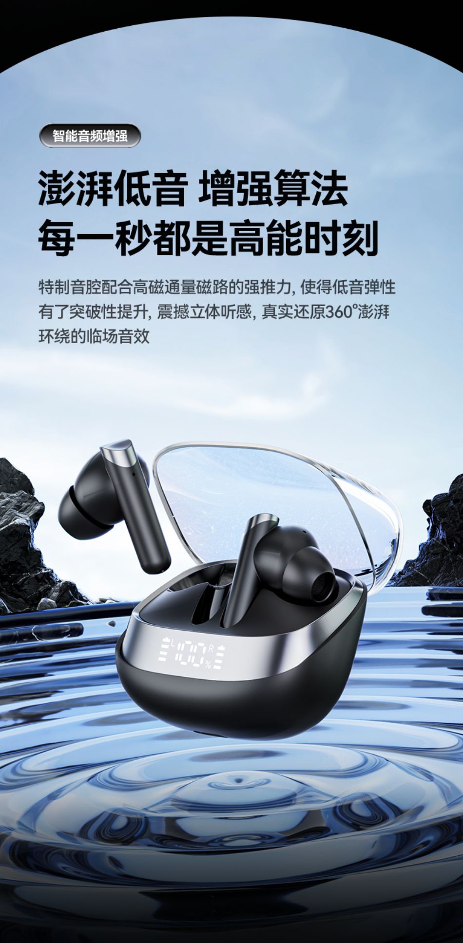 高配蓝牙5.4芯片 稳定高速不断连;智能电量数显 电量情况实时掌握;舒适入耳式佩戴 耳朵久戴不累