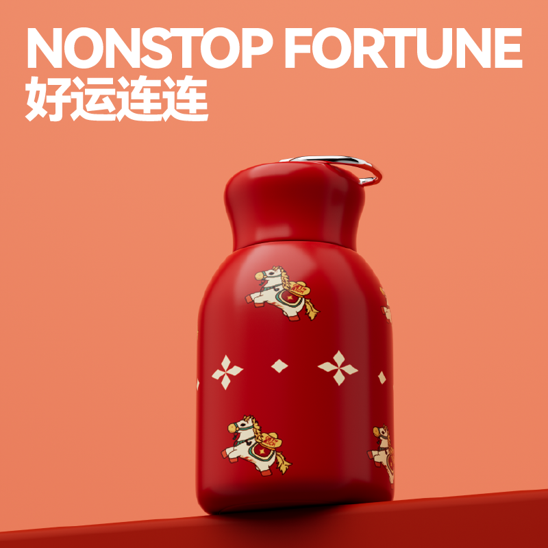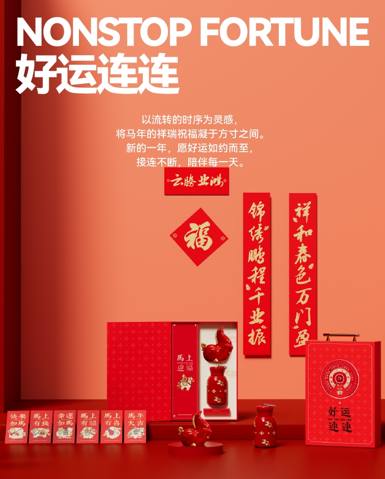 礼盒表面巧妙融入可转动圆盘,暗合“时来运转”的巧思;每转动一次就切换一幅精心绘制的插画对应一句马年祝福;搭配马年摆件,设计新颖
