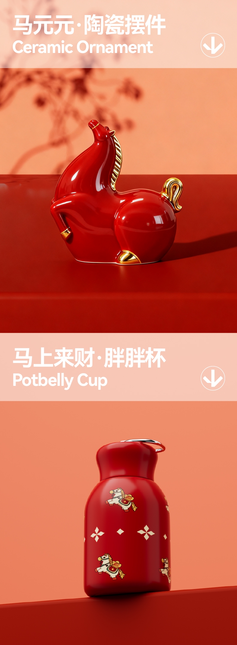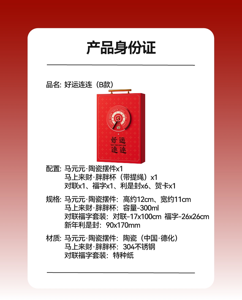 配置清单:精装提盒 x1 马元元·陶瓷摆件x1 马上来财·胖胖杯(带提绳)x1 对联x1、福字x1 利是封x6、贺卡x1