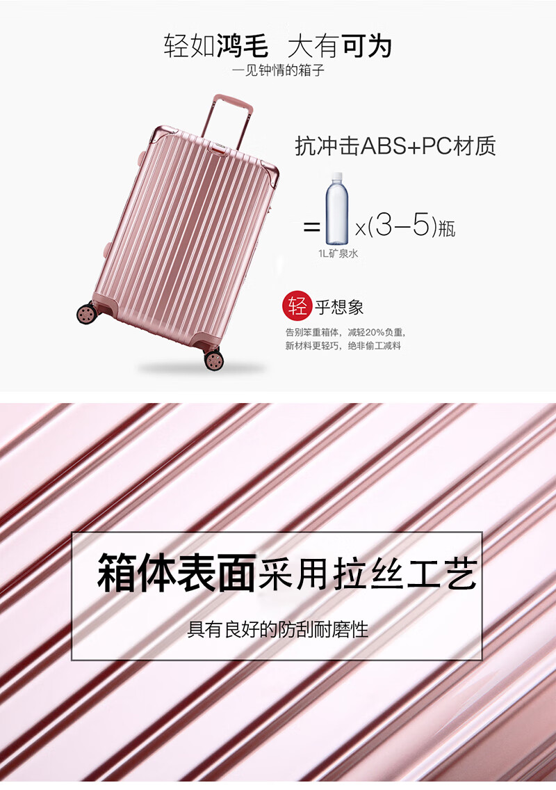 轻盈 柔韧 抗压 采用抗冲击ABS+PC材质;一个箱子仅有三到五瓶矿泉水的重量,同时兼顾抗压抗摔;告别沉重箱体,让出行更简单。