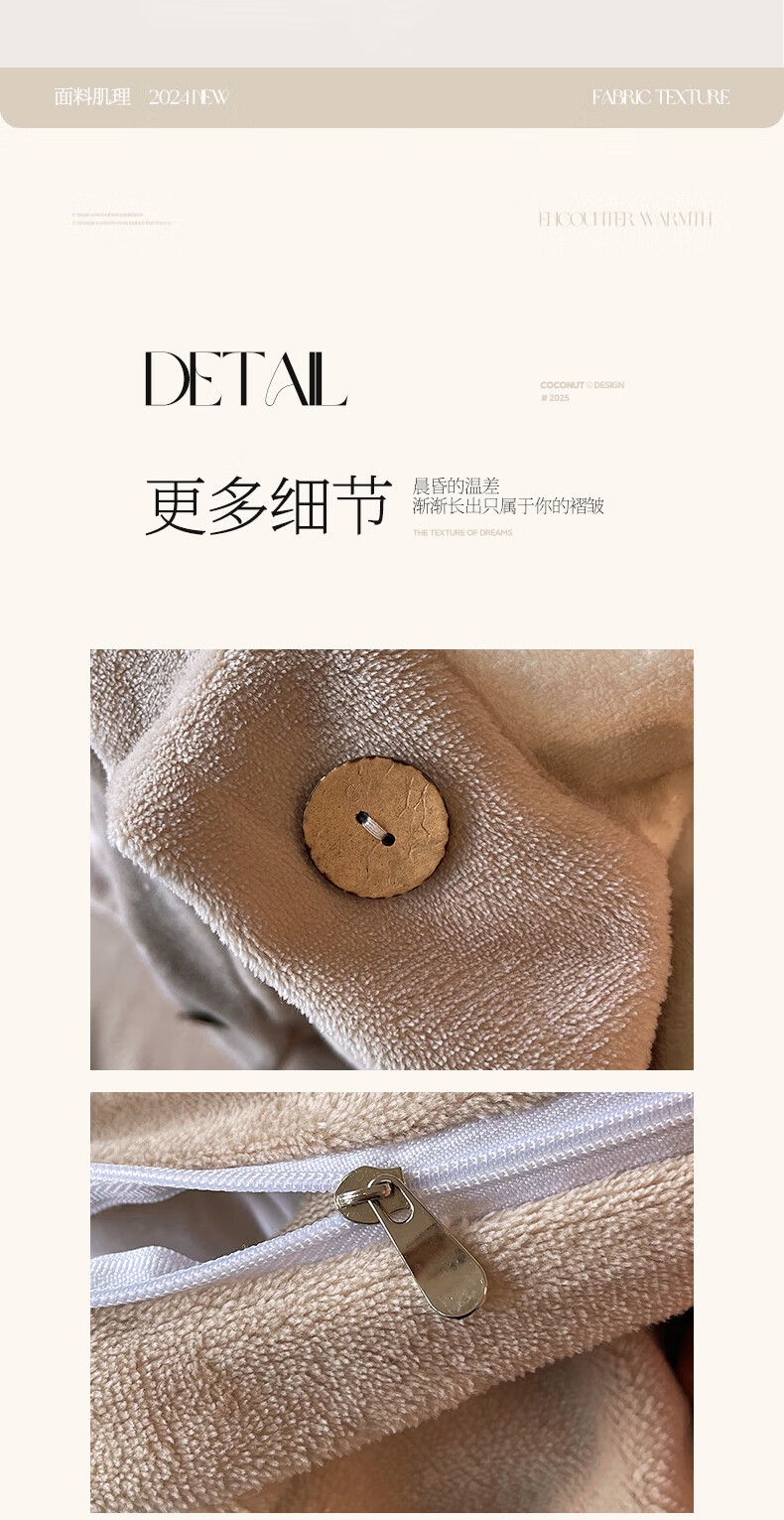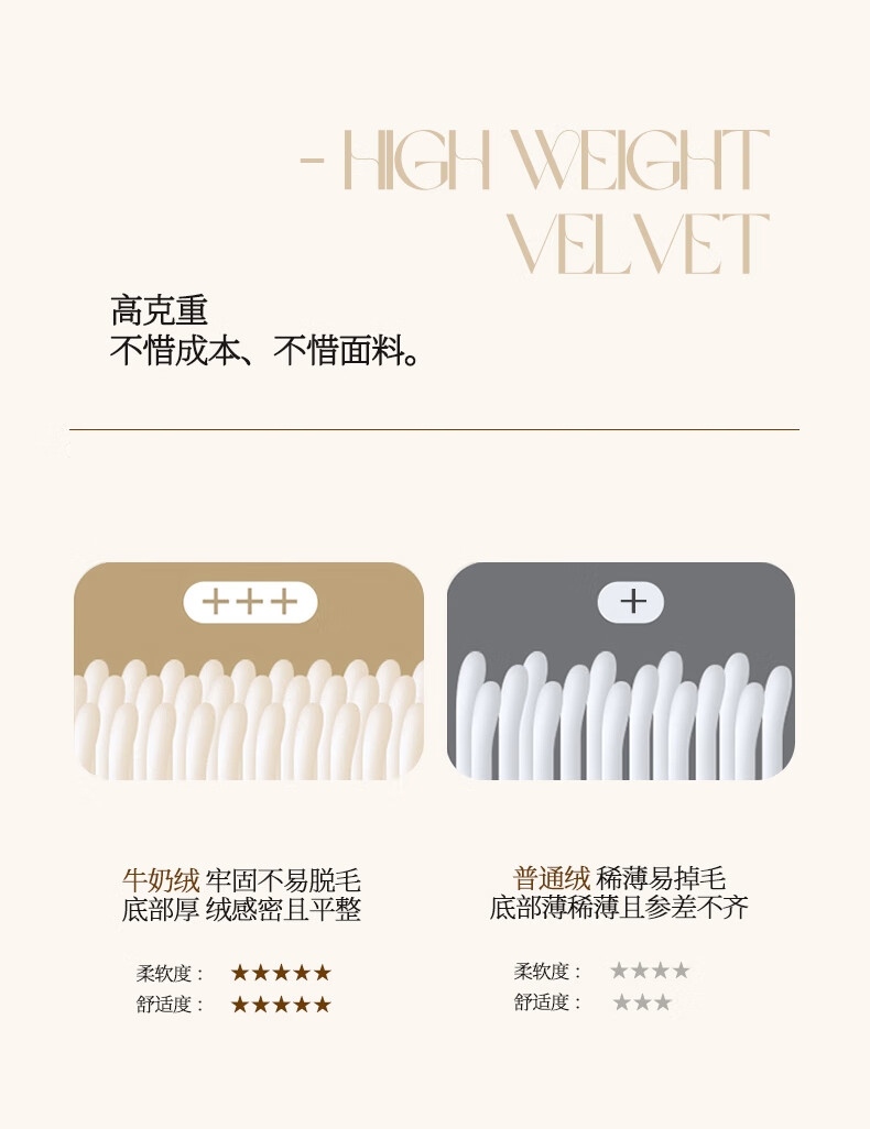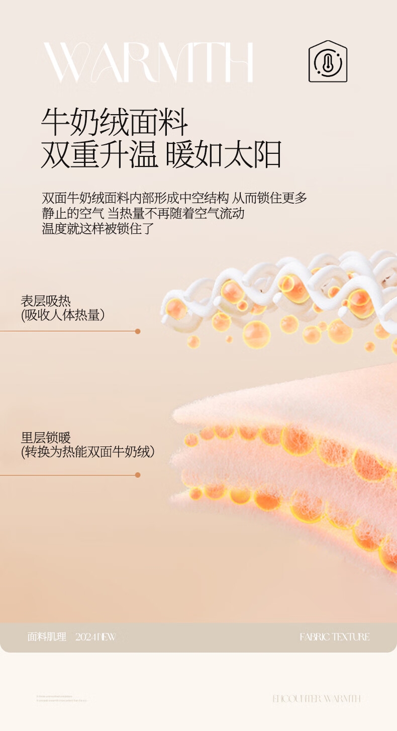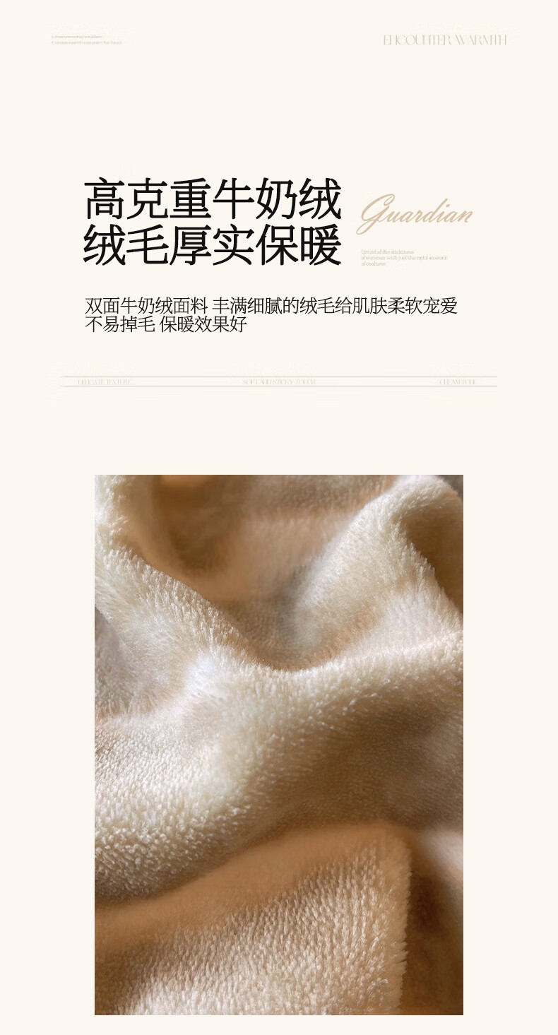 甄选A类高克重牛奶绒面料,双面绒毛,厚实保暖;采用牛奶绒烂花工艺,立体浮雕感强,手感软糯;面料内置导电丝,有效抗静电功效,带走冬日触电烦恼