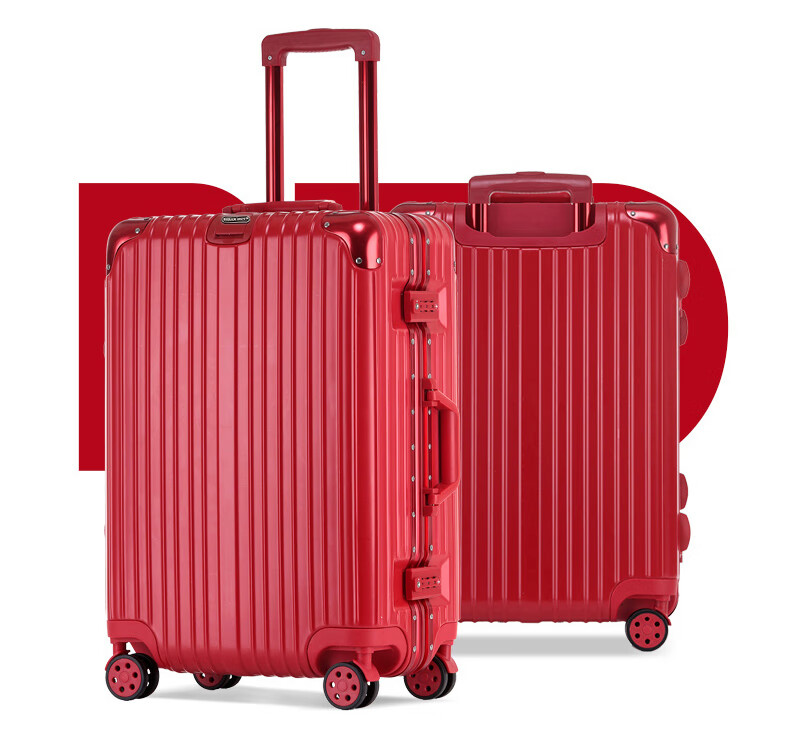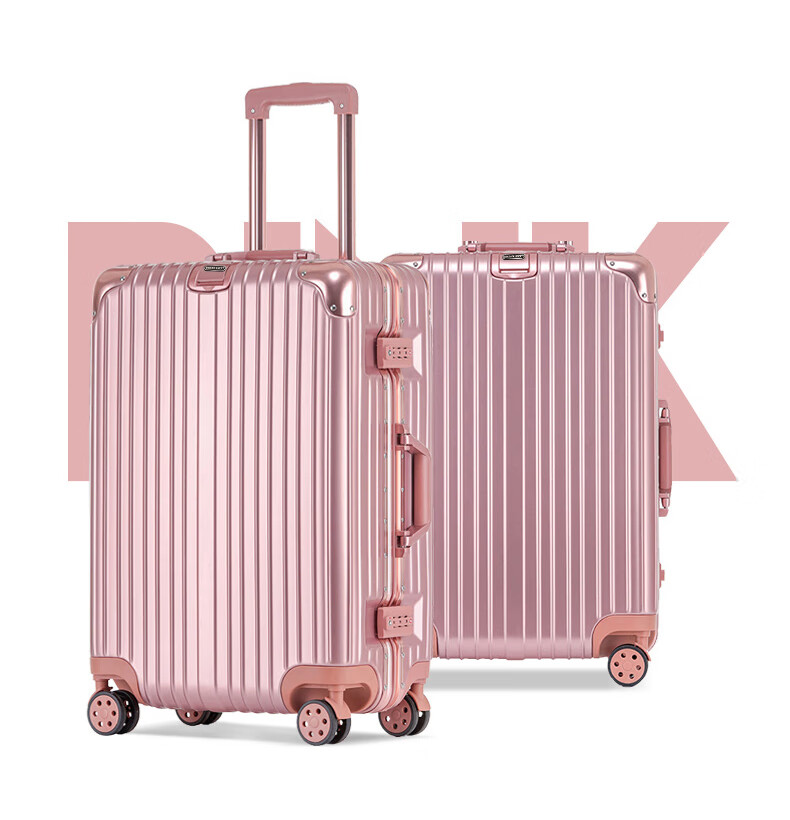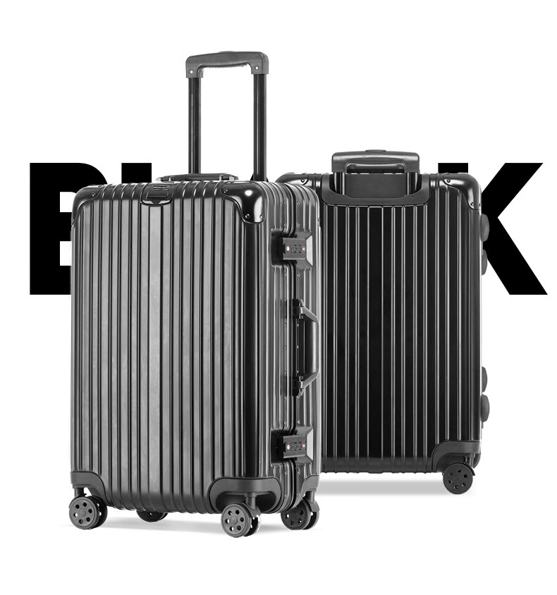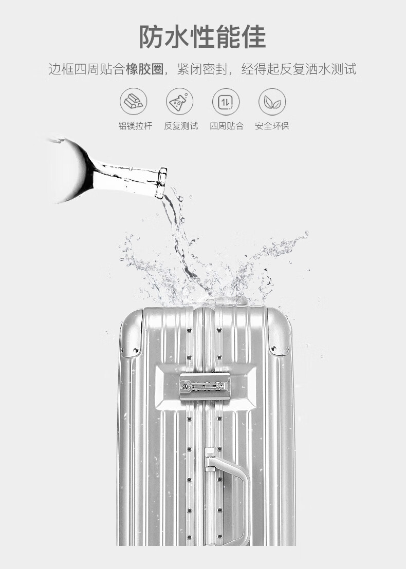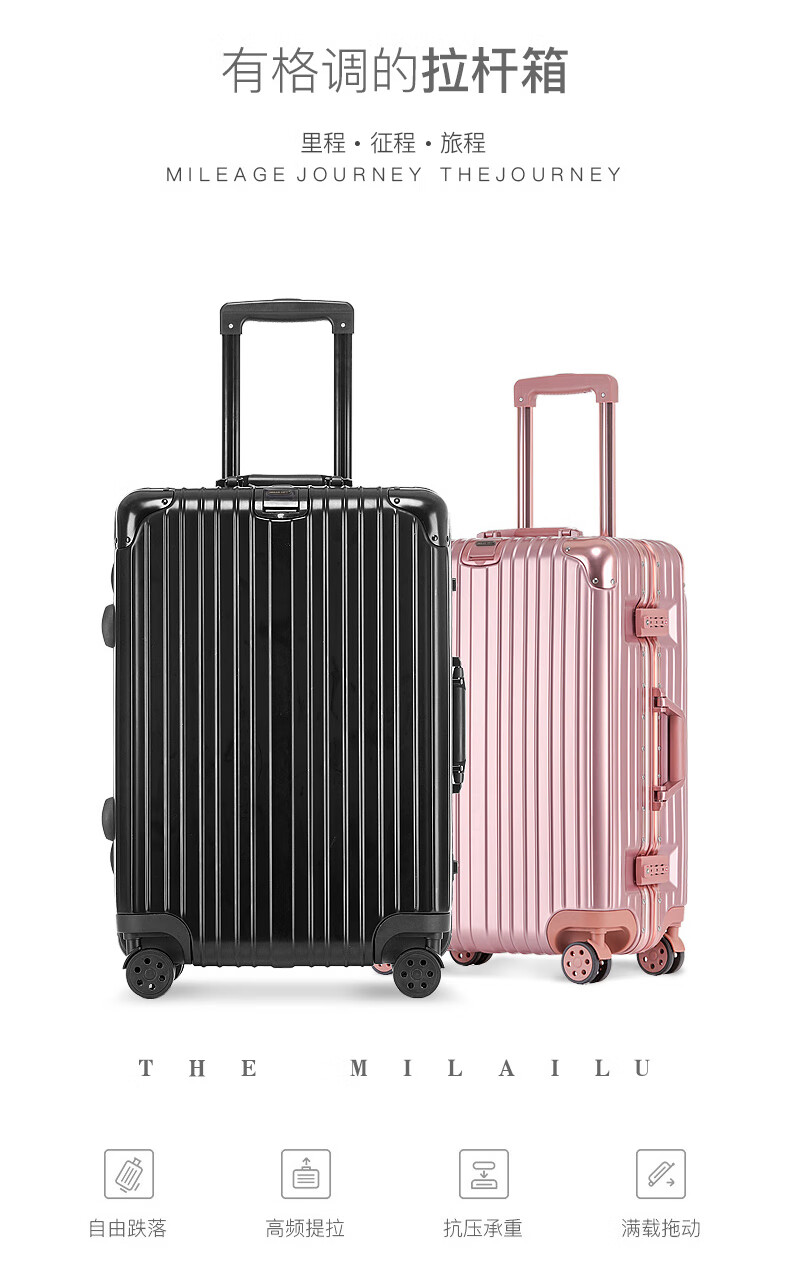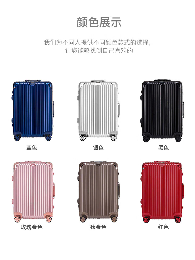 时尚有格调的拉杆箱 · 提供多种颜色与款式 ;箱体配备铝合金拉杆,可提拉3000+次;边框四周贴合橡胶圈,防水性能极佳,简约大气的外观