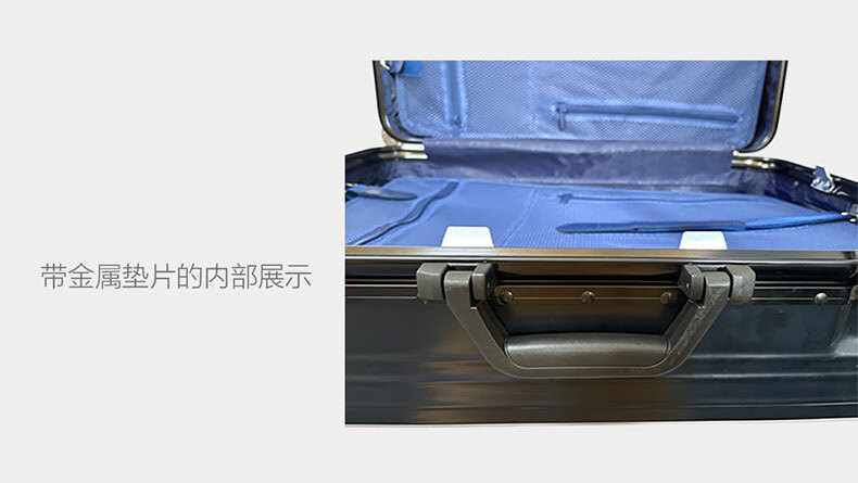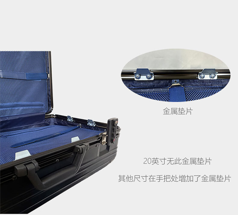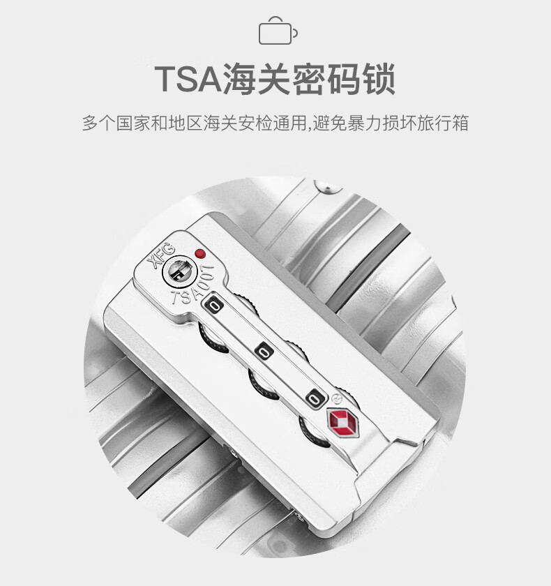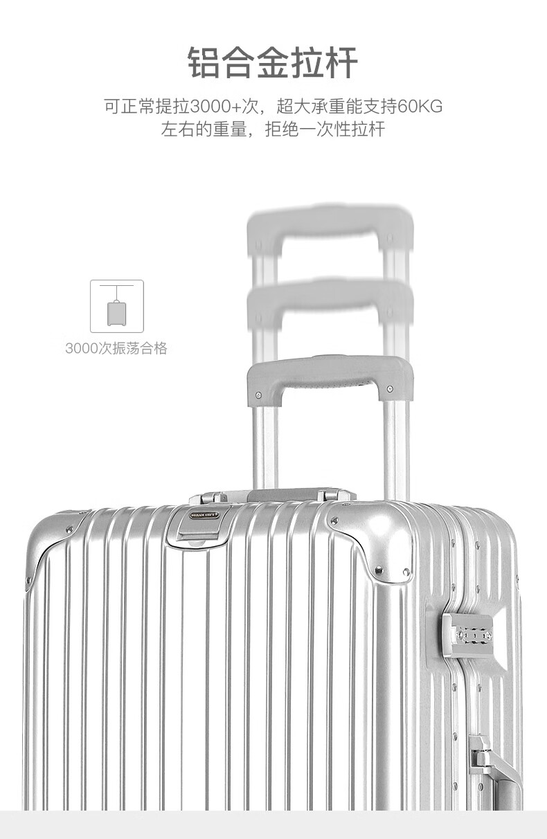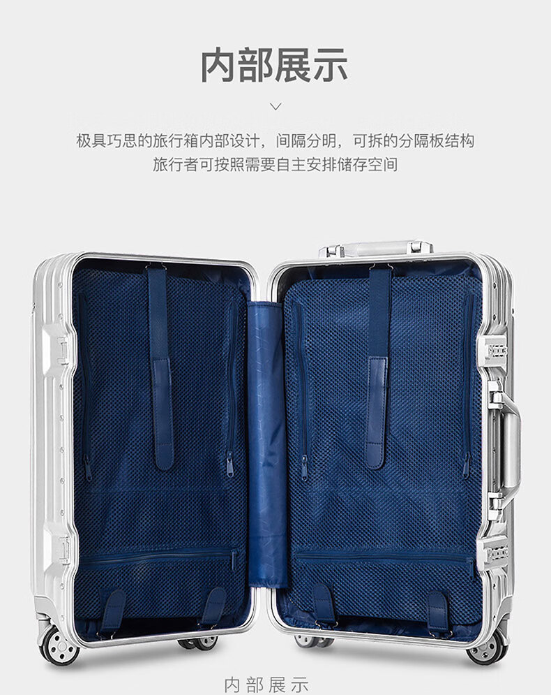说明:TSA海关锁、万向轮、加厚全铝拉杆、铝框箱、双面格挡内里