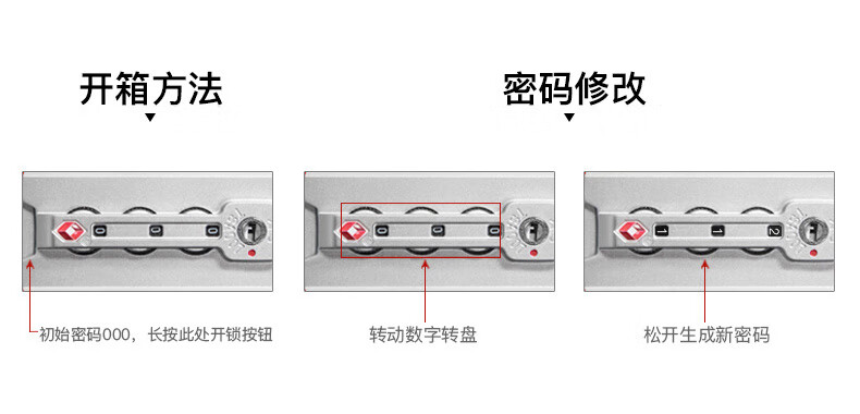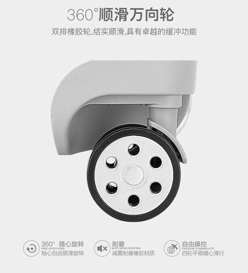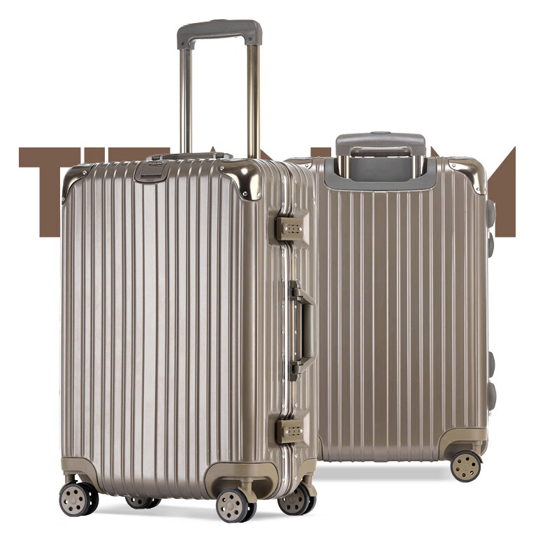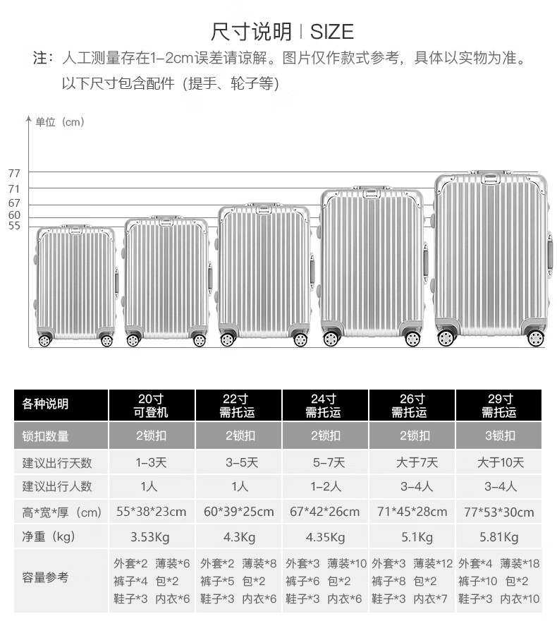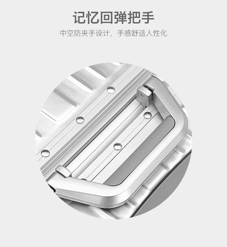 说明:TSA海关锁、万向轮、加厚全铝拉杆、铝框箱、双面格挡内里