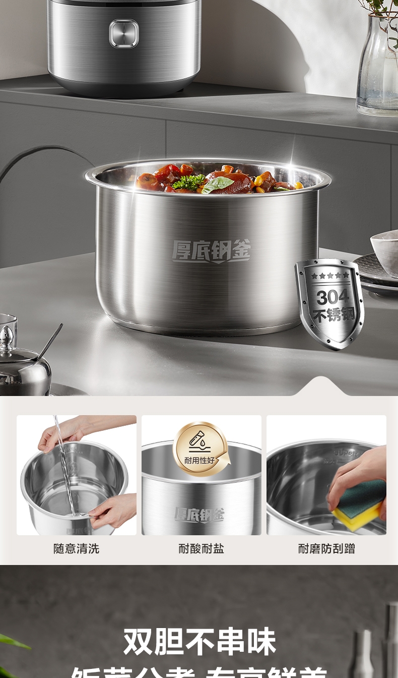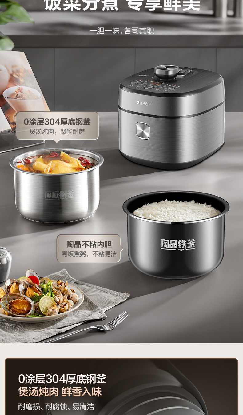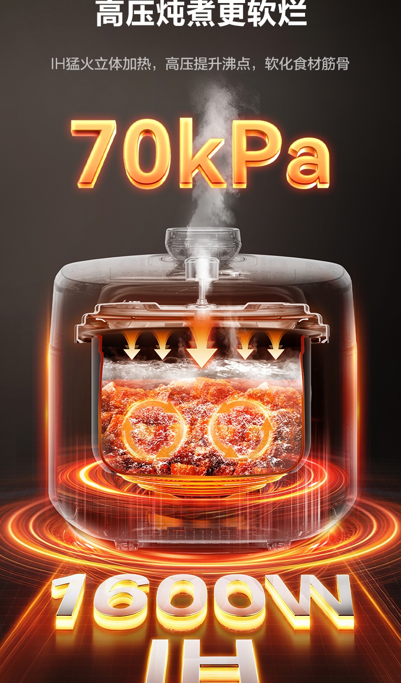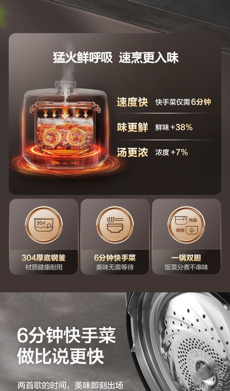 IH鲜呼吸;0涂层304不锈钢厚底钢釜+陶晶不粘内胆;70kPa高压,猛火高压速烹 6 分钟一道菜