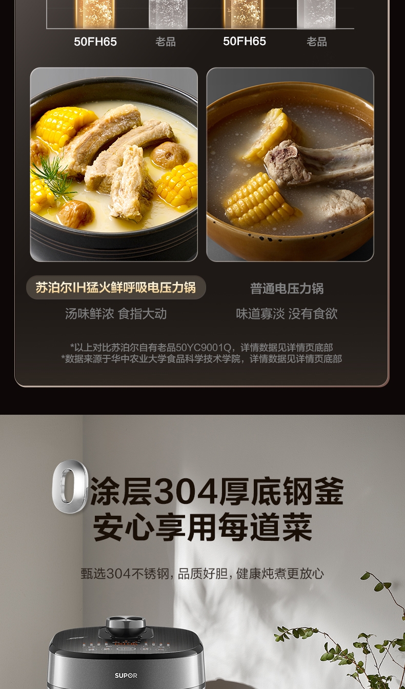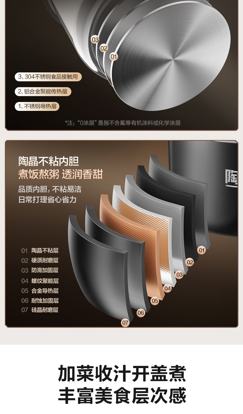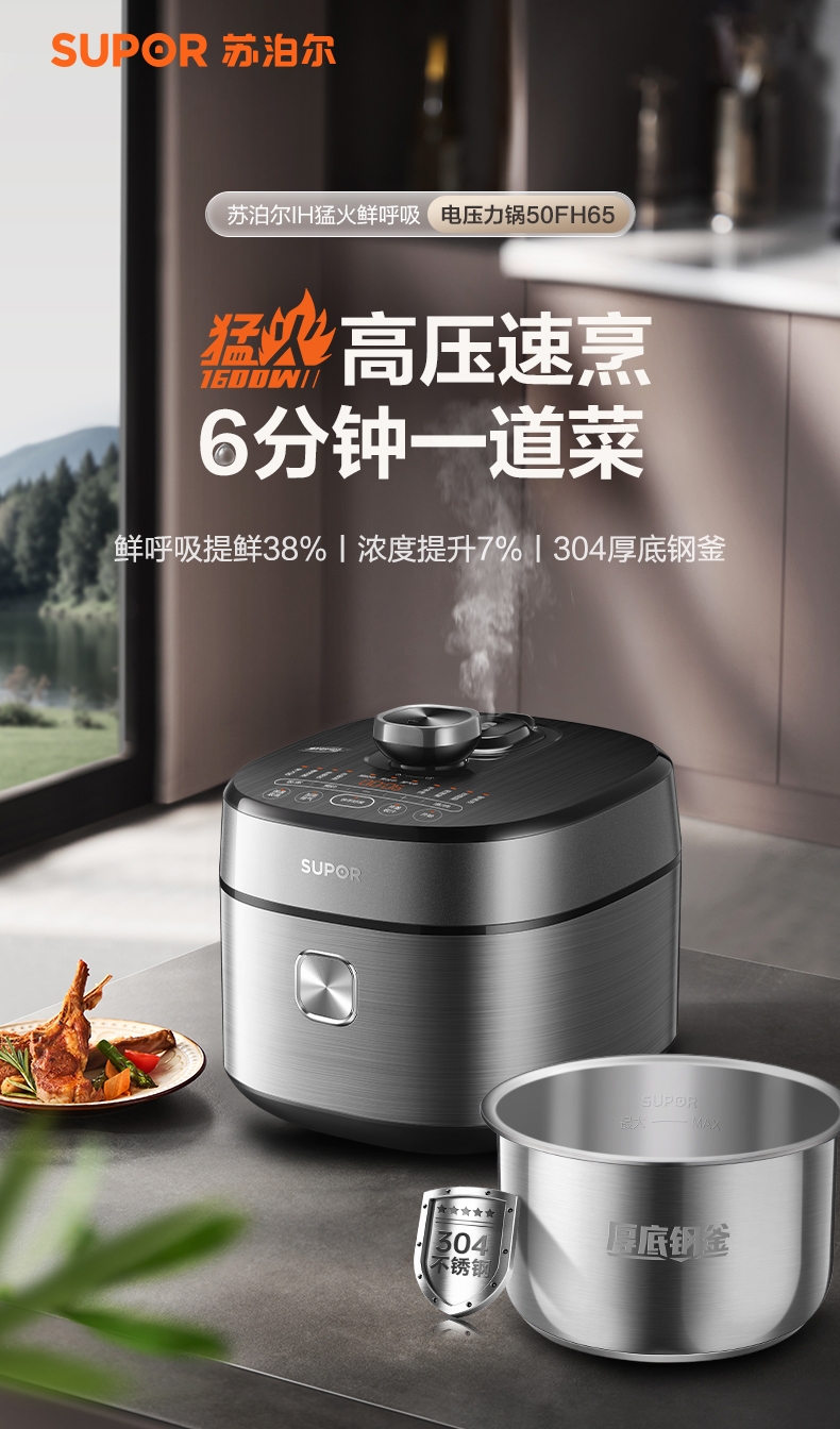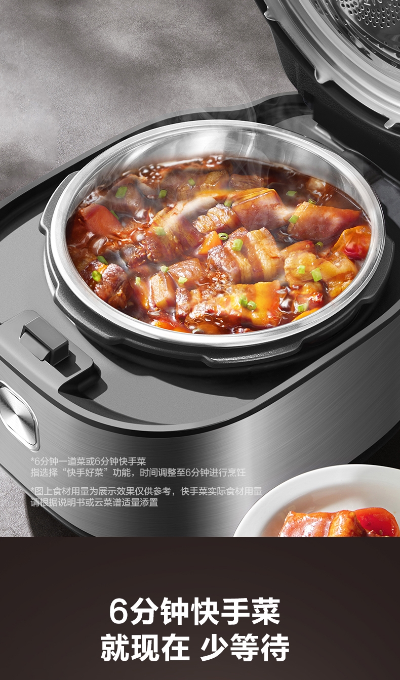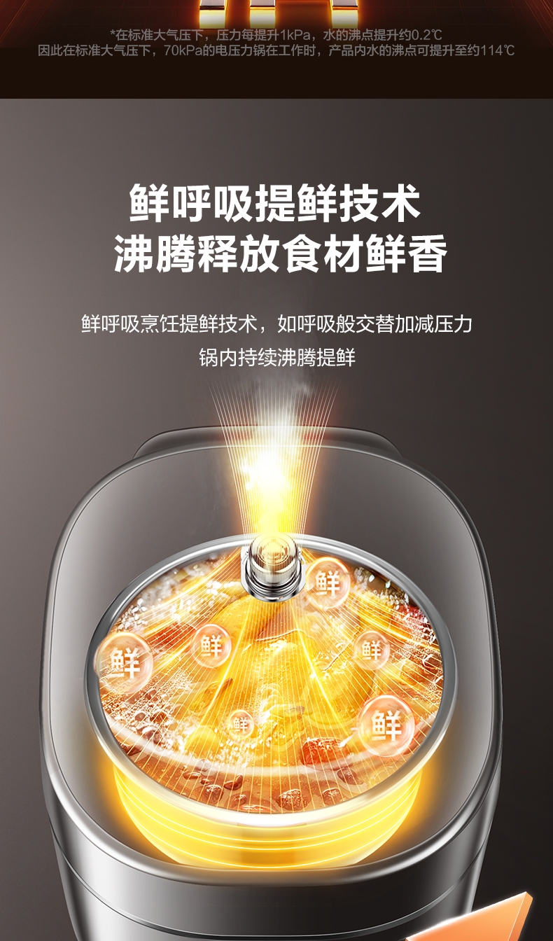 IH鲜呼吸;0涂层304不锈钢厚底钢釜+陶晶不粘内胆;70kPa高压,猛火高压速烹 6 分钟一道菜