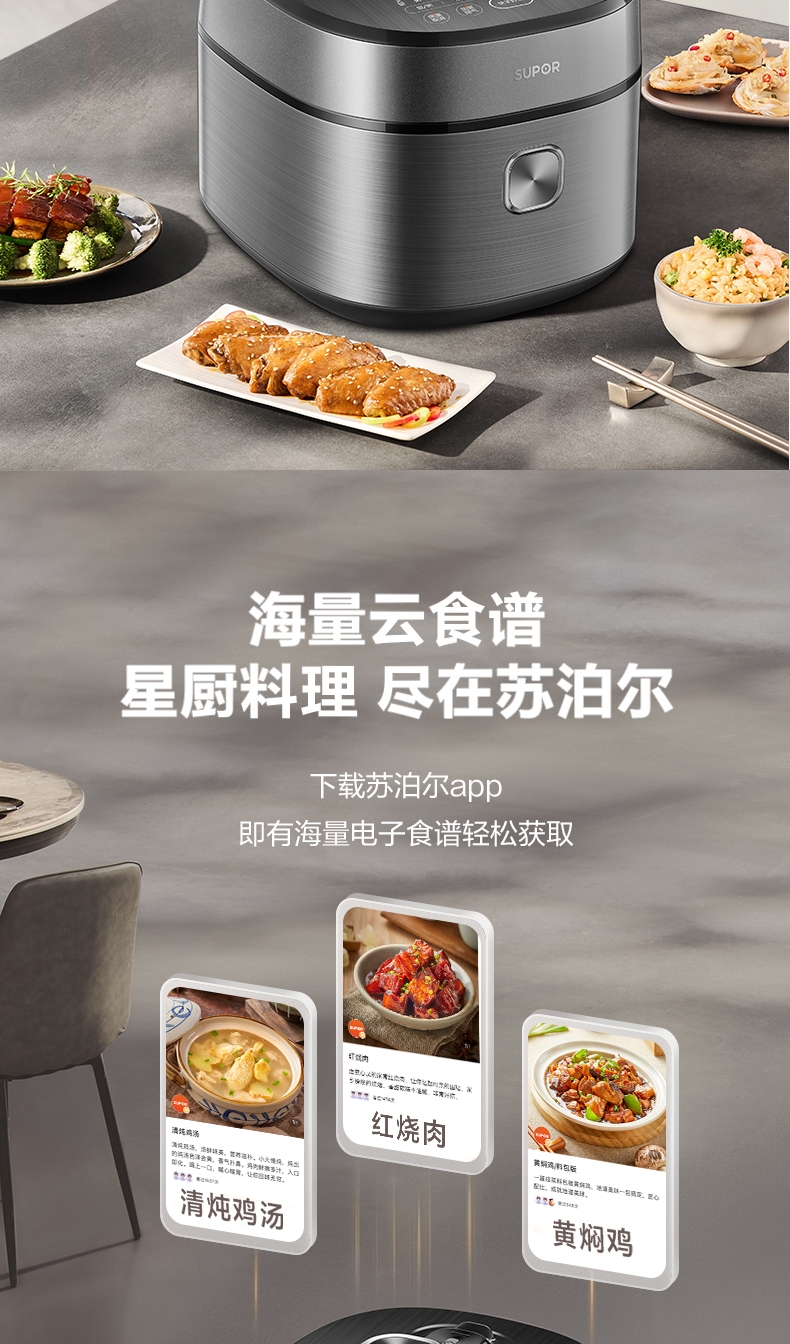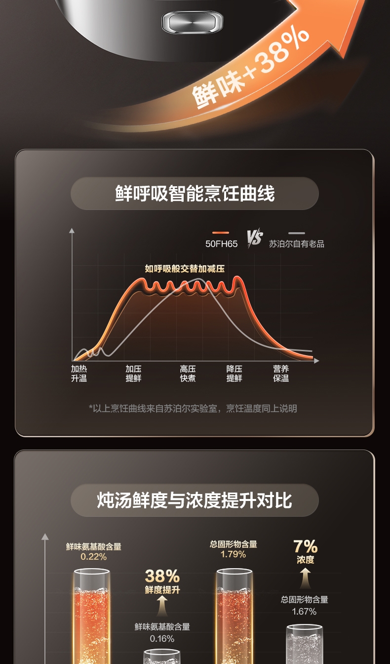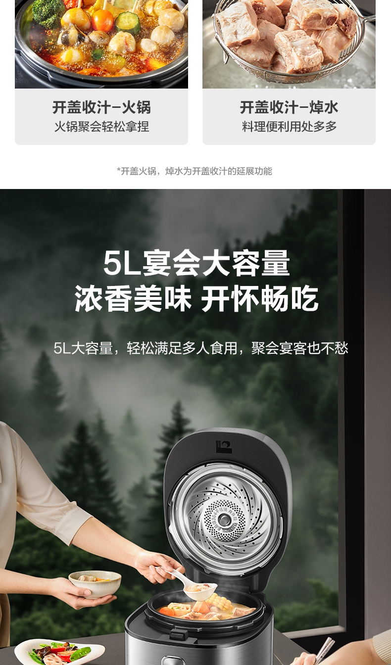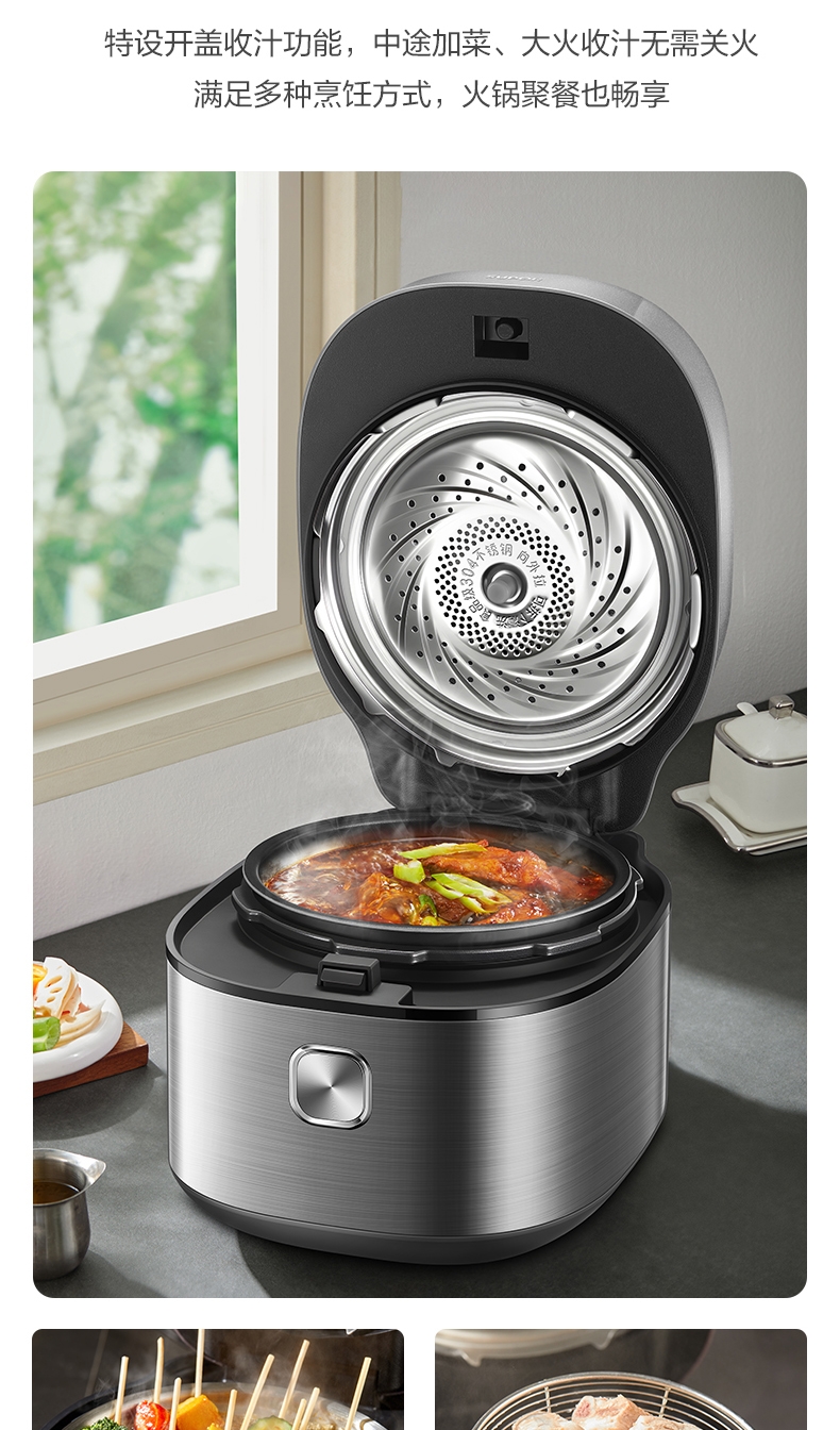 IH鲜呼吸;0涂层304不锈钢厚底钢釜+陶晶不粘内胆;70kPa高压,猛火高压速烹 6 分钟一道菜