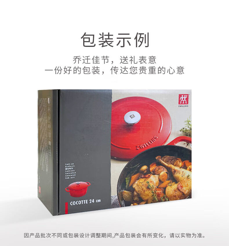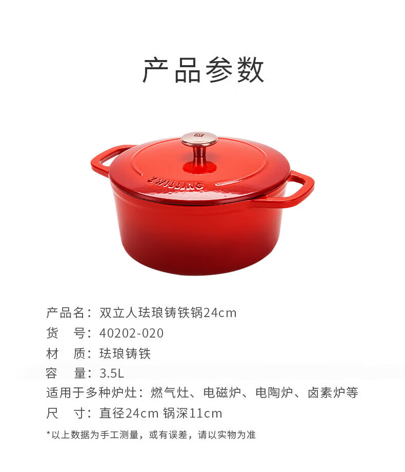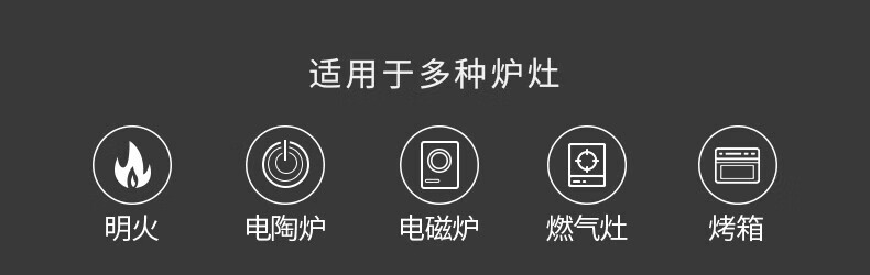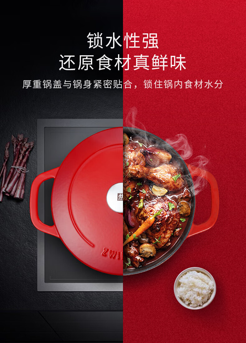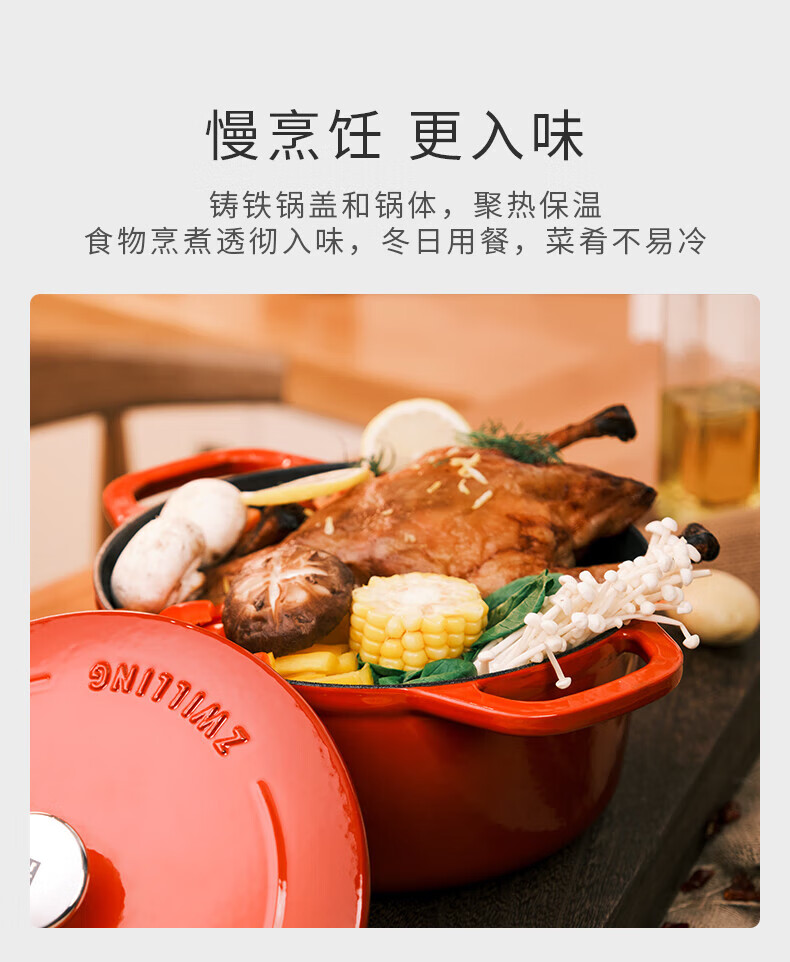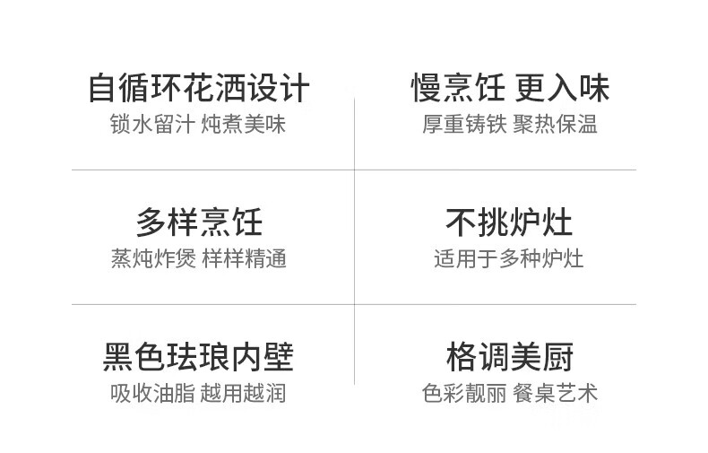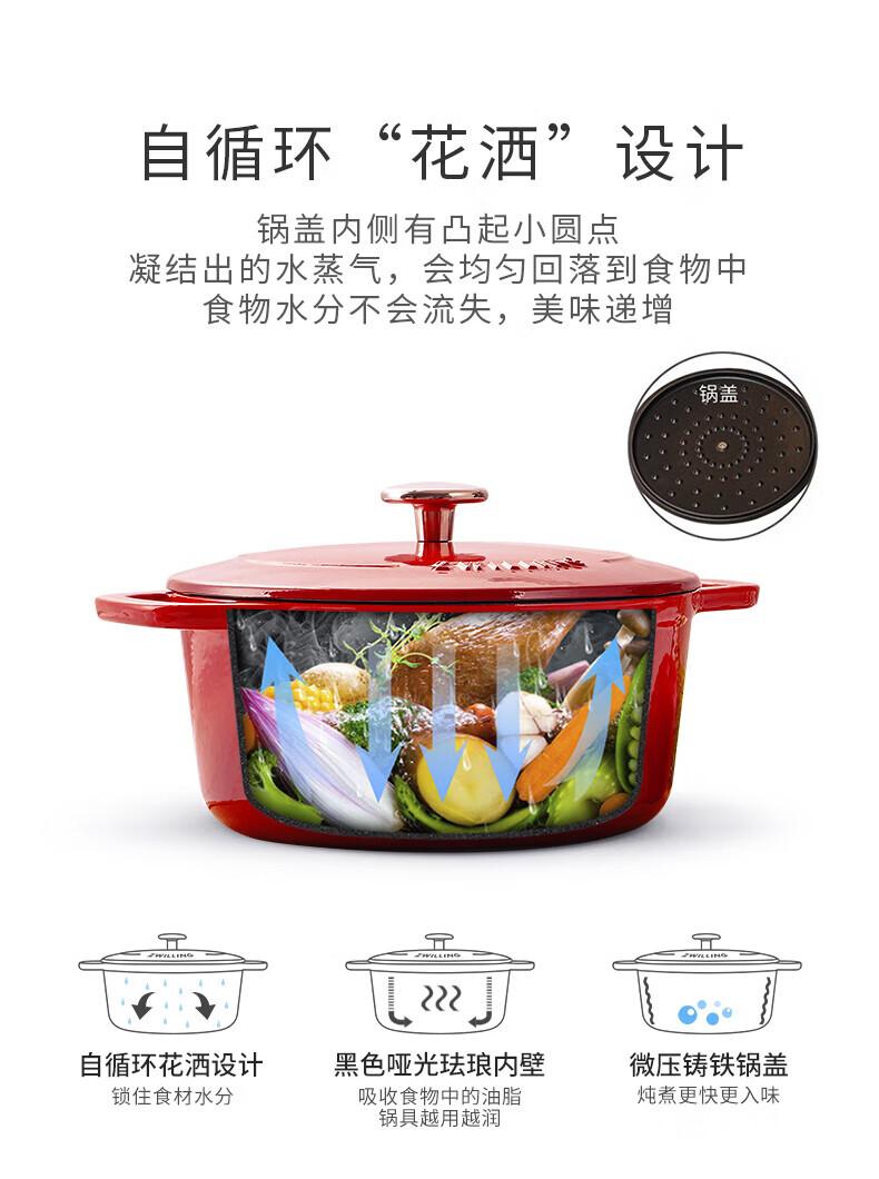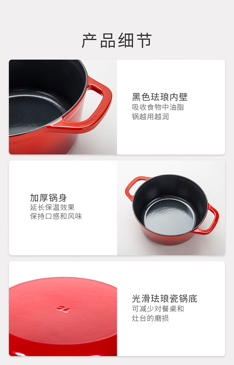 天然珐琅铸铁材质,适用于各种炉灶及烤箱;深色内层珐琅,适合各种烹调方式;传热迅速,持久保温,坚固耐用