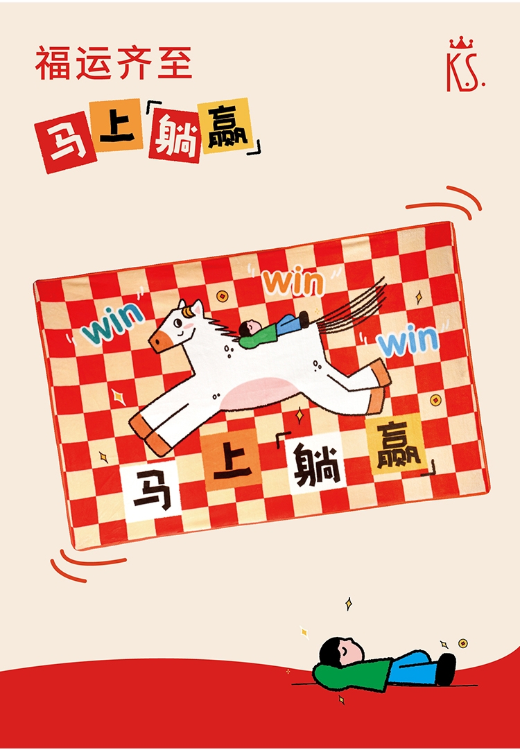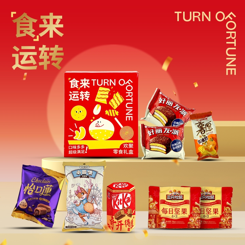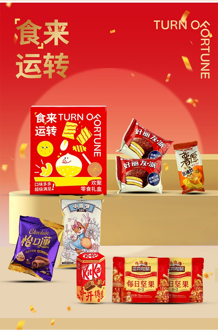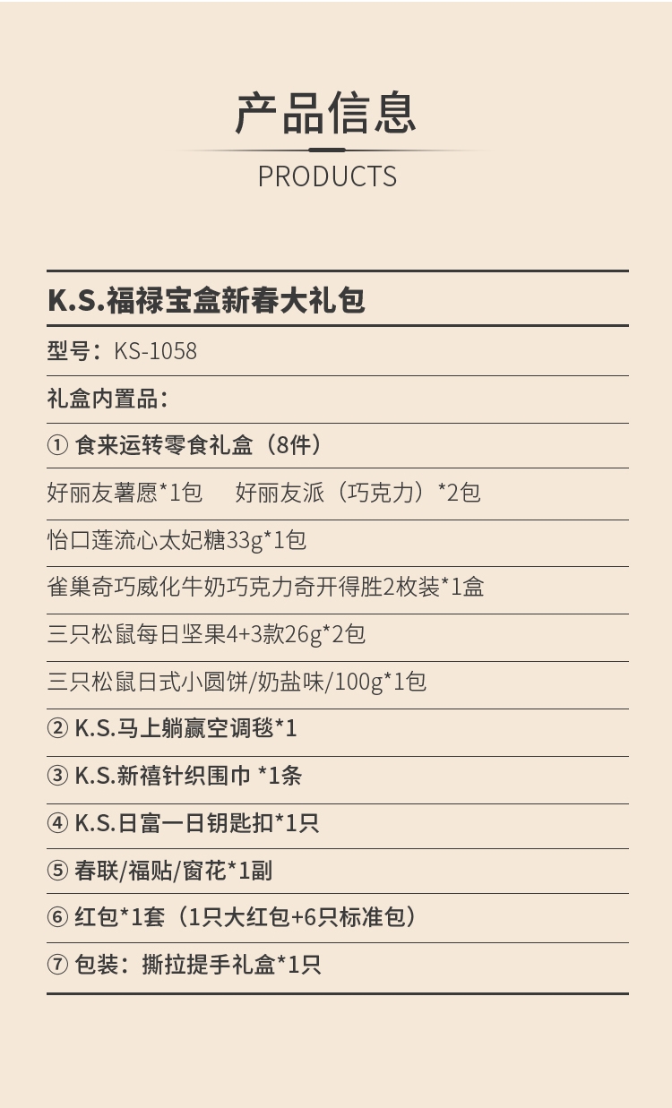 配置清单:① 食来运转零食礼盒8件套 ②K.S.马上躺赢空调毯*1 ③K.S.新禧针织围巾 *1条 ④K.S.日富一日钥匙扣*1只 ⑤春联/福贴/窗花*1副 ⑥红包*1套(1只大红包+6只标准包) ⑦包装:撕拉提手礼盒*1只