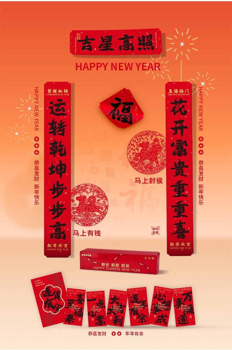 材质:围巾30*170cm、100%涤纶 毛毯/95x148cm、 300克涤纶针织布 钥匙扣:绳长100mm、亚克力直径55mm 亚克力 春联/福贴*1副(157G铜版纸) 窗花/pvc10丝带纸140G静电膜23.5*23.5cm 红包/铜版纸200g