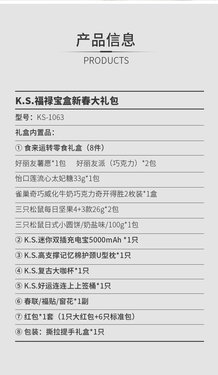 配置清单:①食来运转零食礼盒8件套 ②K.S.红点迷你双插充电宝5000mAh *1只 ③K.S.高支撑记忆棉护颈U型枕*1只 ④K.S.复古大咖杯*1只 ⑤好运连连上上签桶*1只 ⑥春联/福贴/窗花*1副 ⑦红包*1套(1只大红包+6只标准包) ⑧包装:撕拉提手礼盒*1只