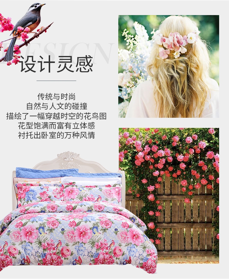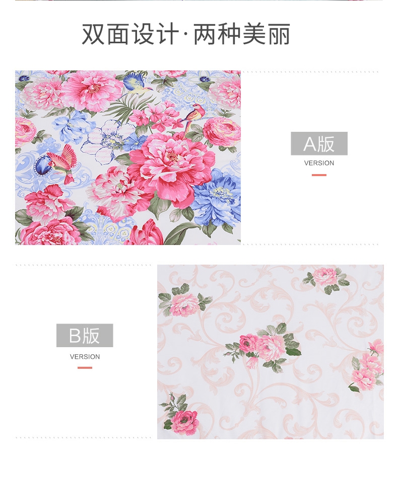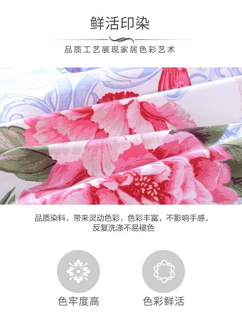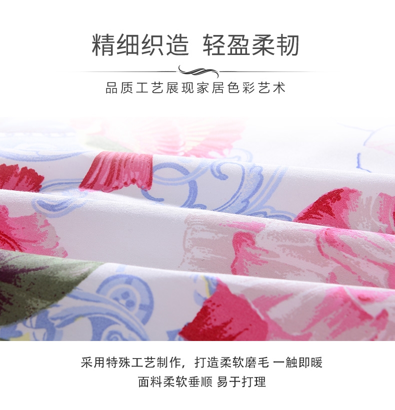 面料经过两次打磨处理,在表面会形成一种细密短绒毛;原创印花,鲜活印染,花型更立体,久用不褪色,好品质;历经多道印染工艺,面料颜色丰富,花型层次感佳