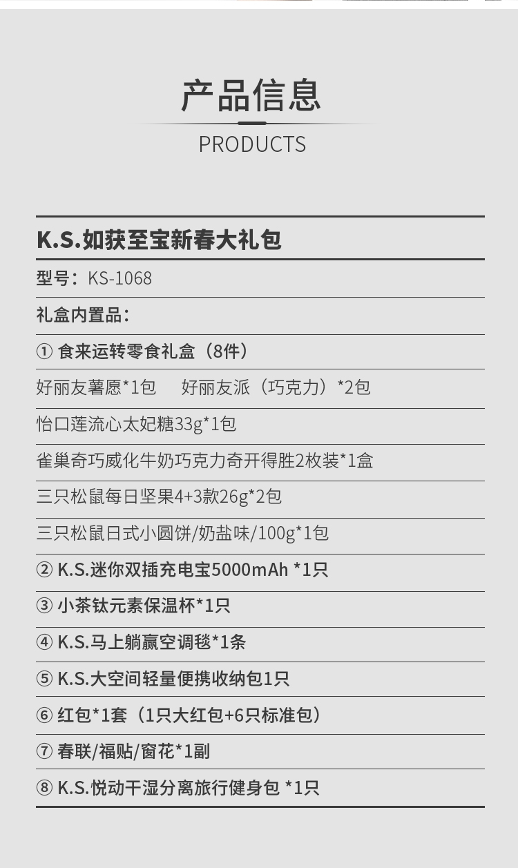 配置清单:①食来运转零食礼盒8件套 ②K.S.红点迷你双插充电宝5000mAh *1只 ③小茶钛元素保温杯*1只 ④K.S.马上躺赢空调毯*1条 ⑤K.S.大空间轻量便携收纳包1只 ⑥红包*1套(1只大红包+6只标准包) ⑦春联/福贴/窗花*1副 ⑧K.S.悦动干湿分离旅行健身包 *1只