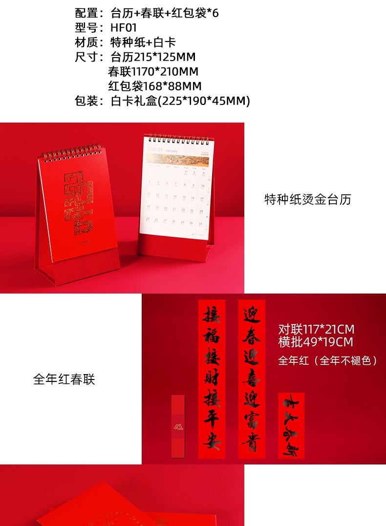 尺寸:台历215*125mm 春联1170*210mm 红包袋168*88mm