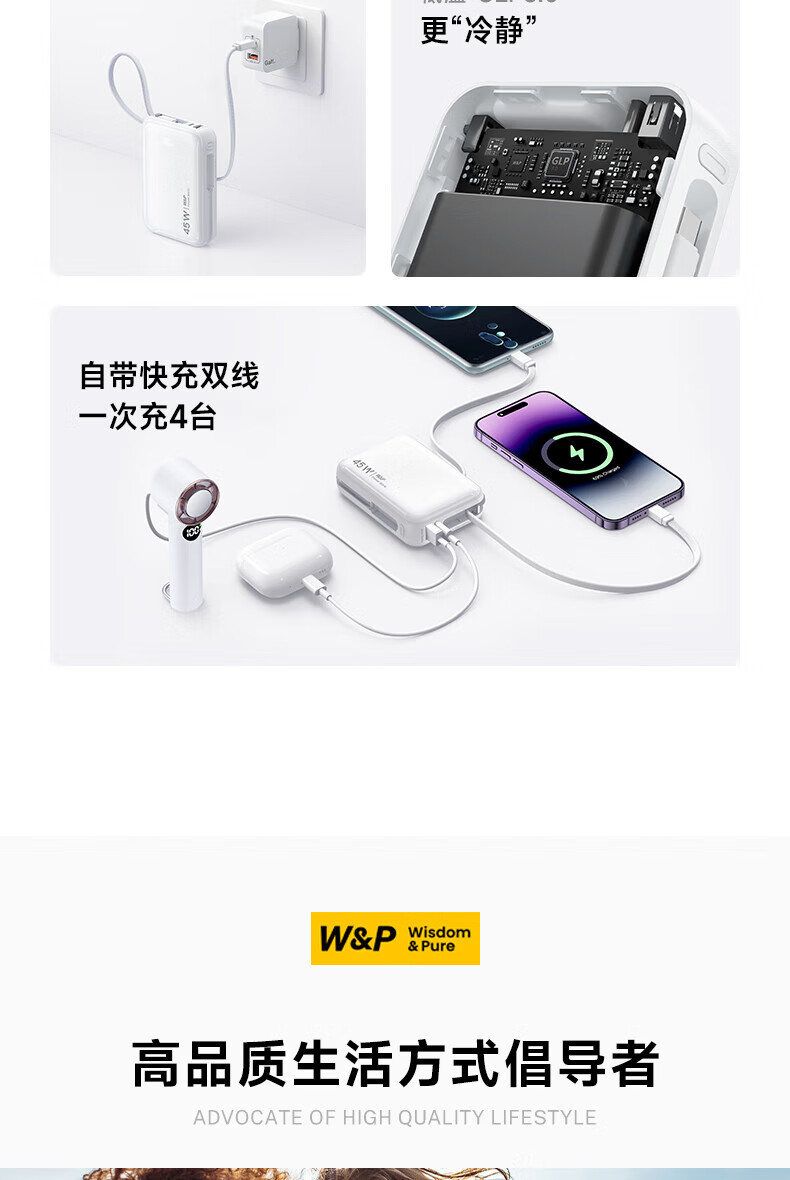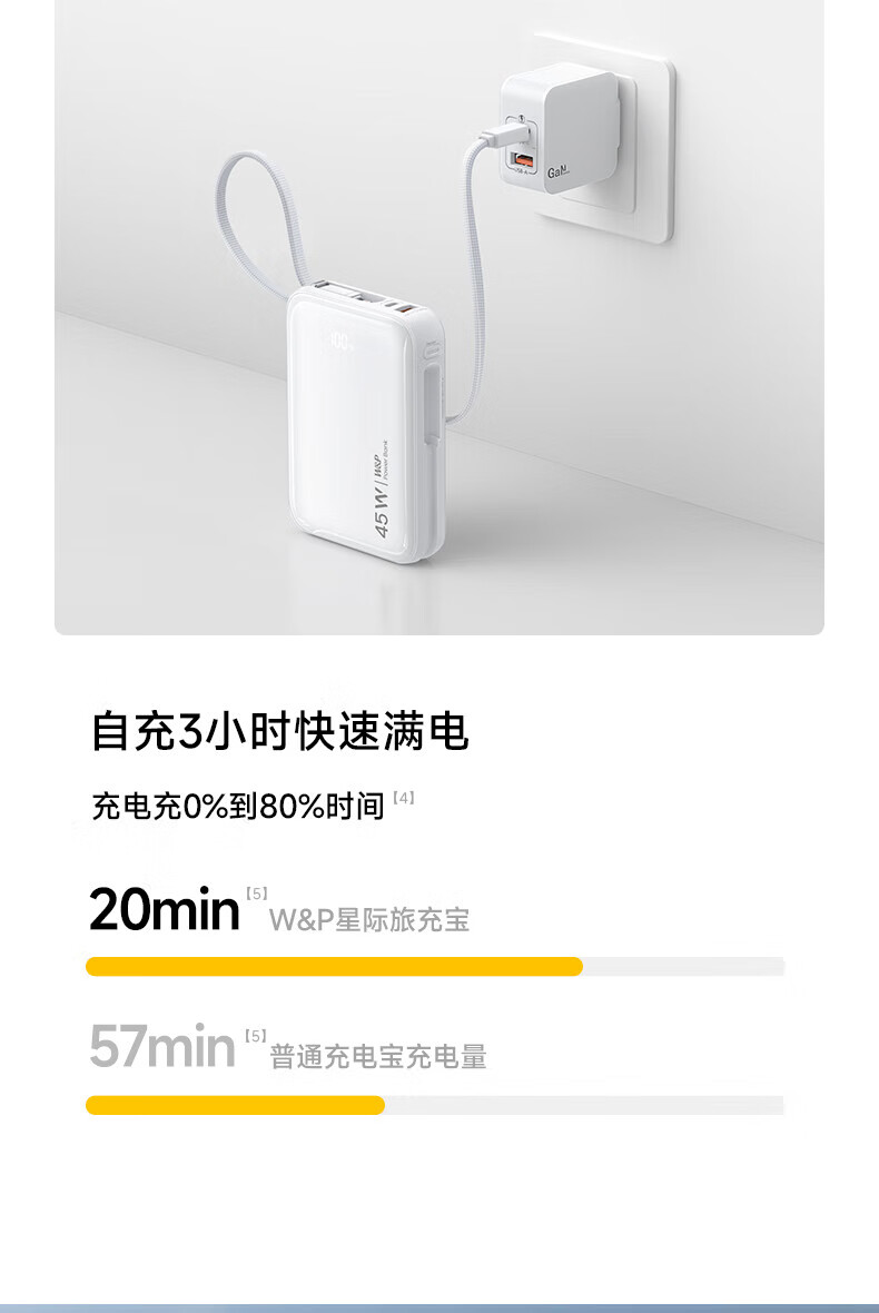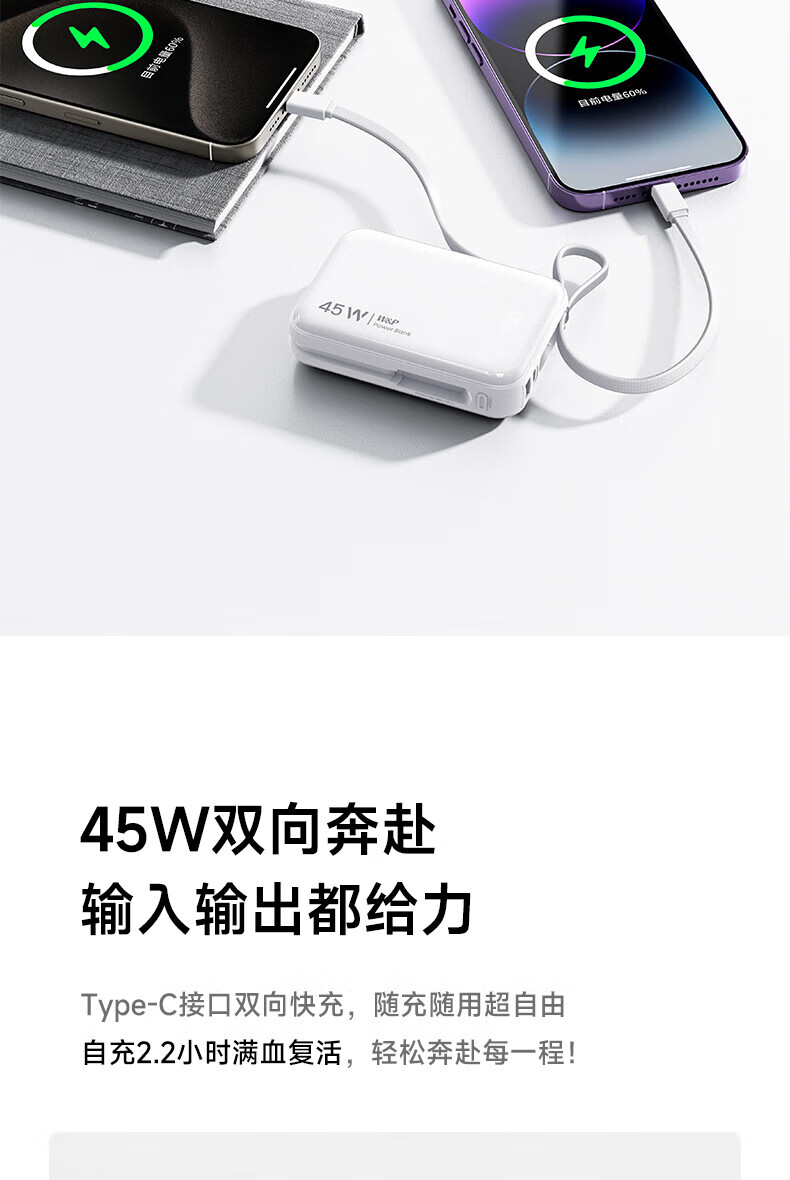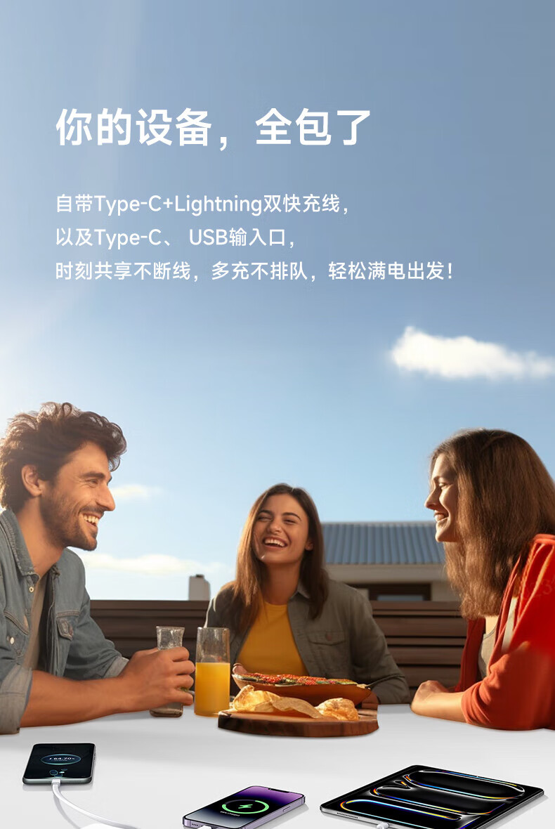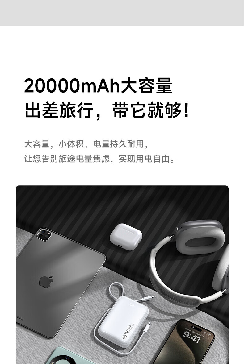 自带快充双线 无需带线,拿起就充;20000mAh大容量每次,远行都有底气;自带快充双线一次充4台