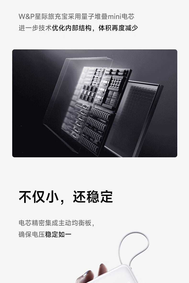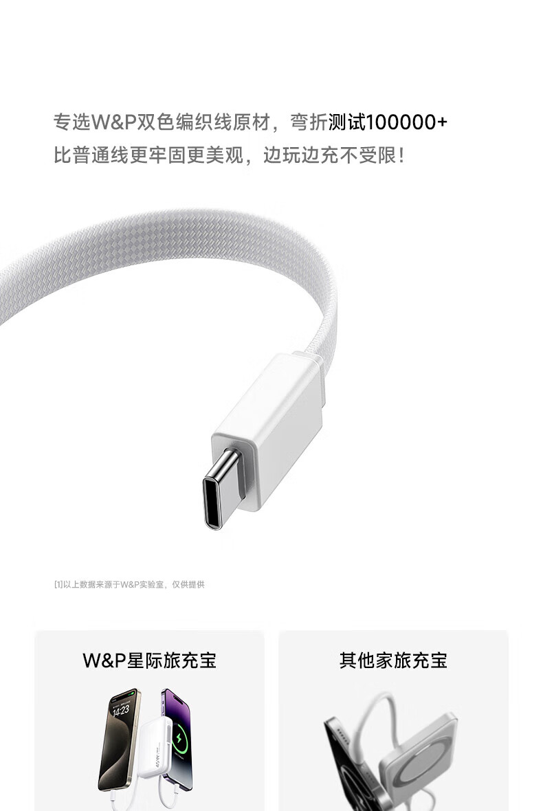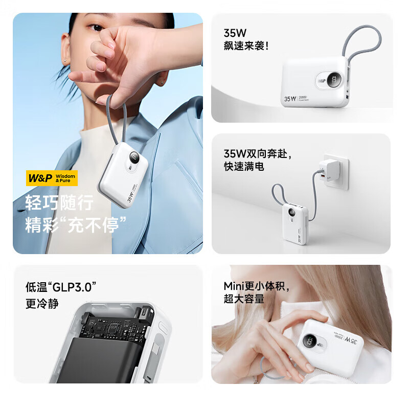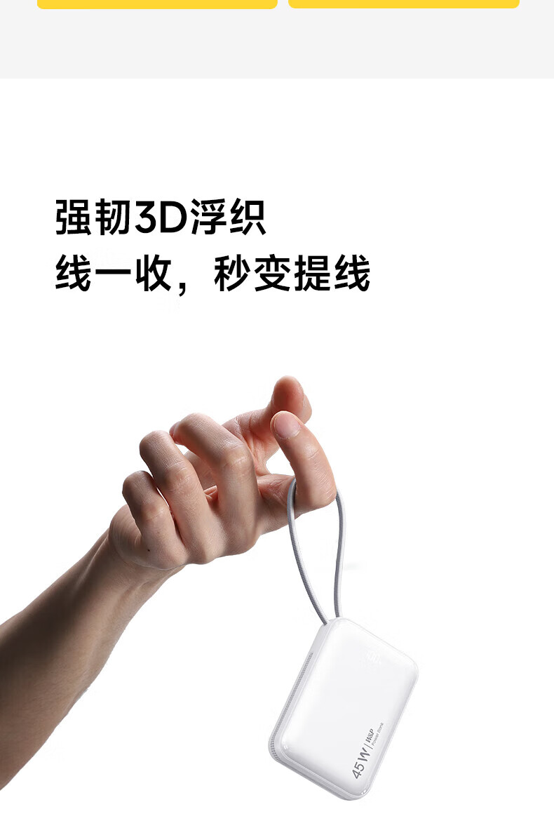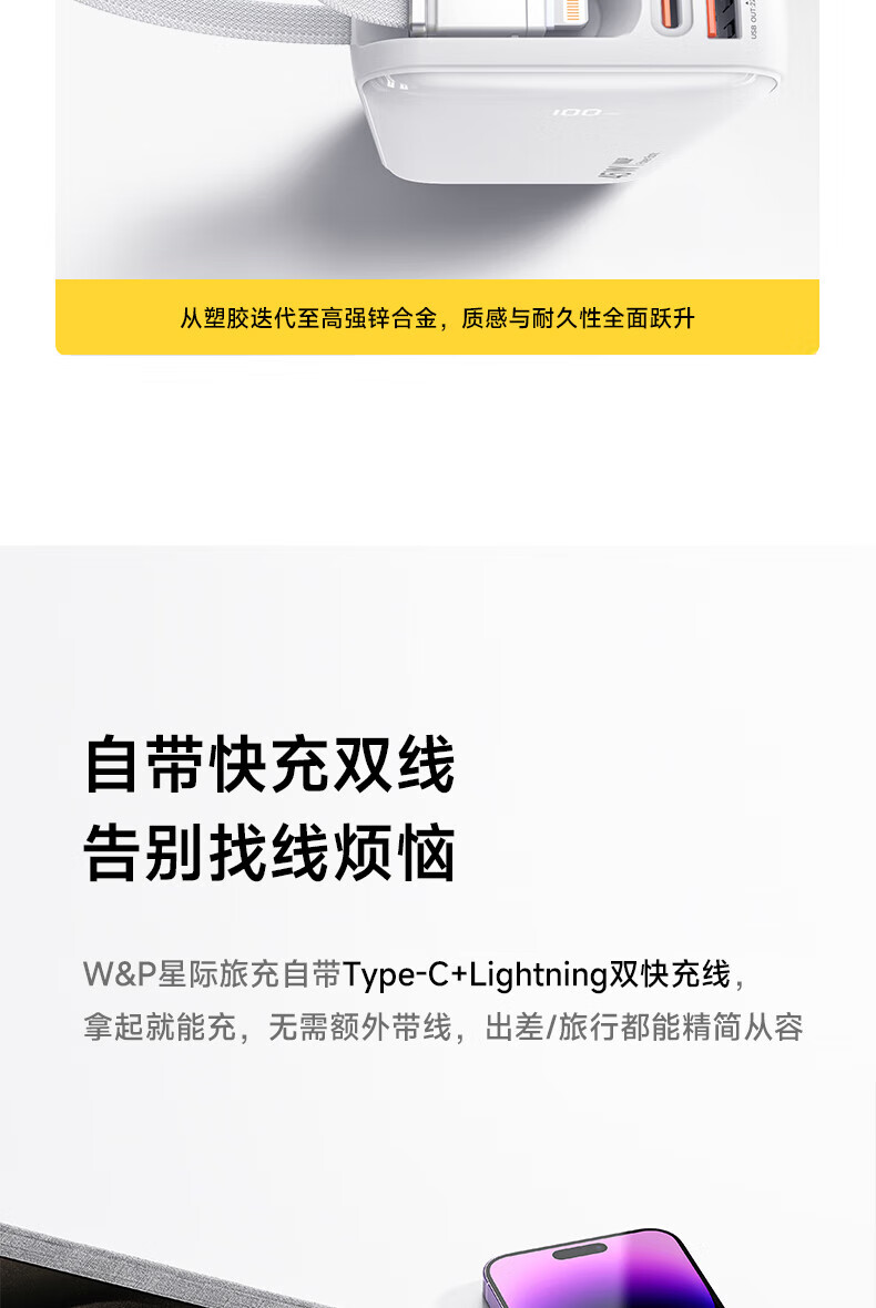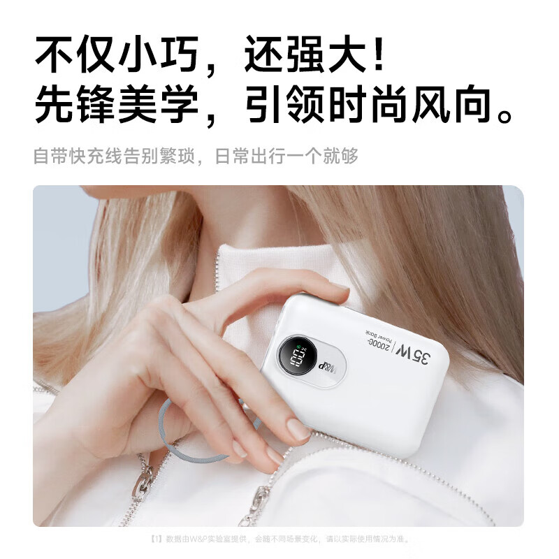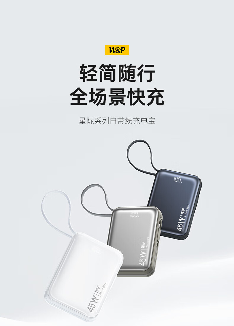 自带快充双线 无需带线,拿起就充;20000mAh大容量每次,远行都有底气;自带快充双线一次充4台