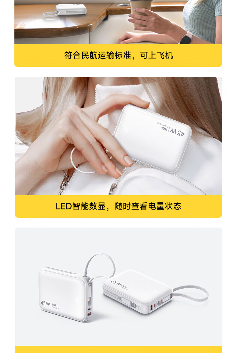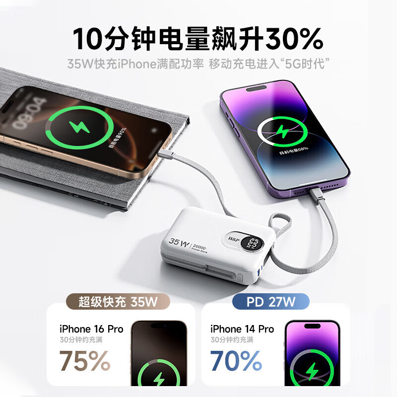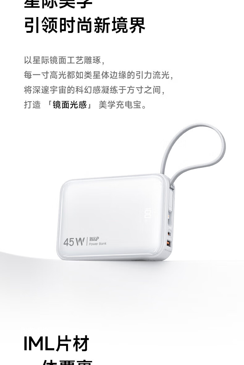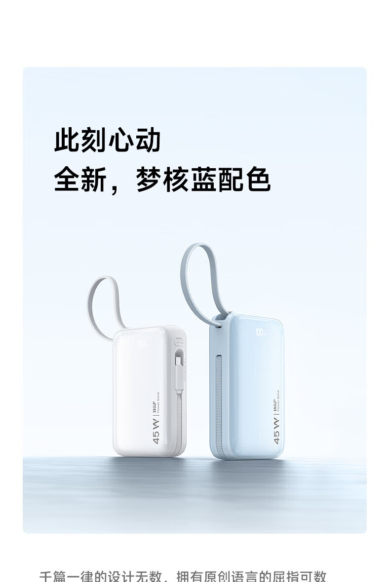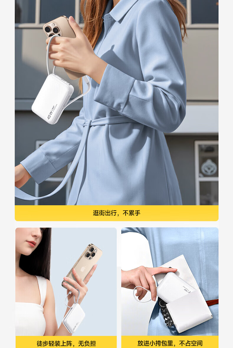 自带快充双线 无需带线,拿起就充;20000mAh大容量每次,远行都有底气;自带快充双线一次充4台