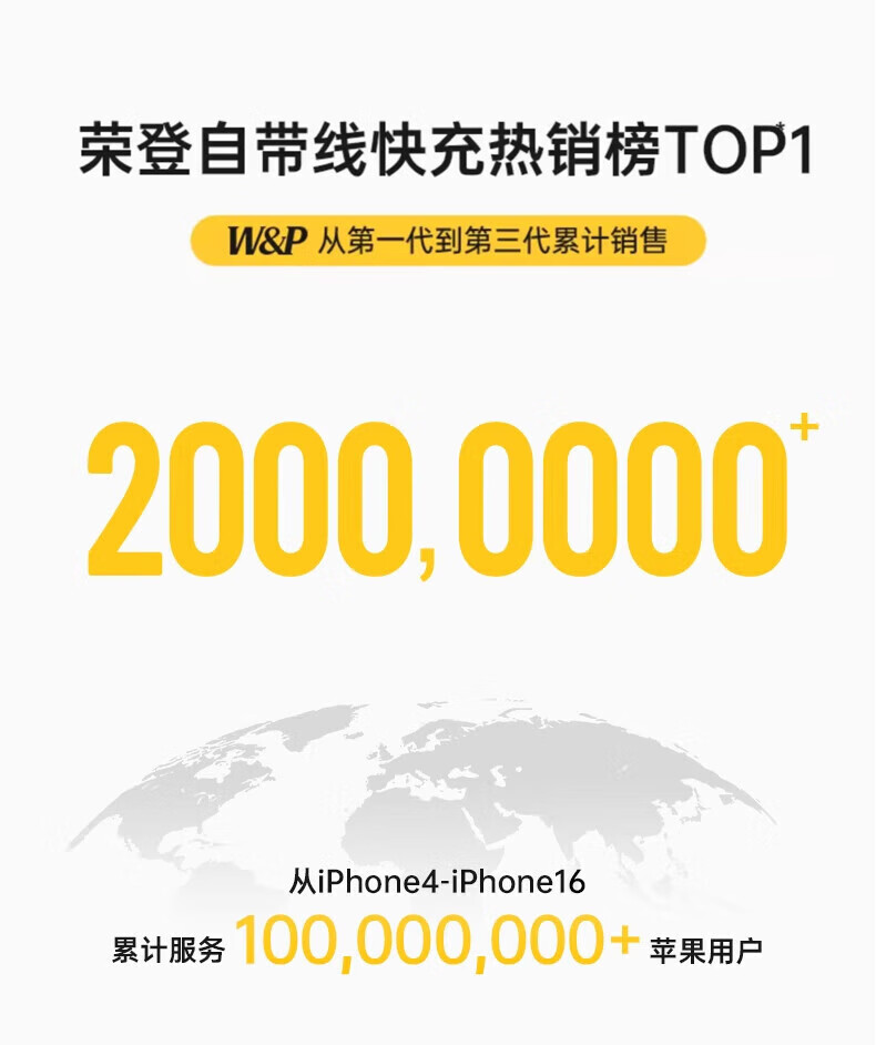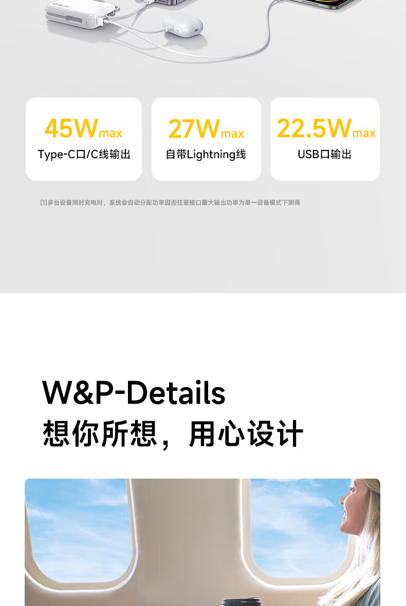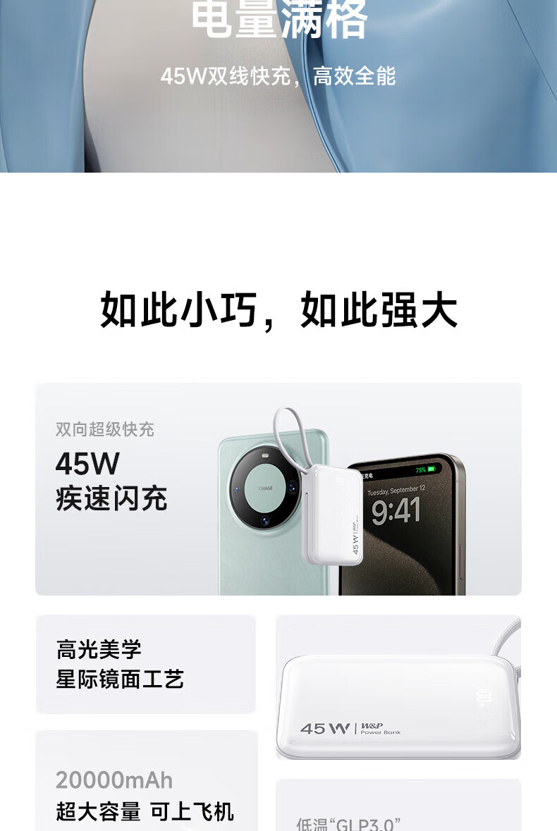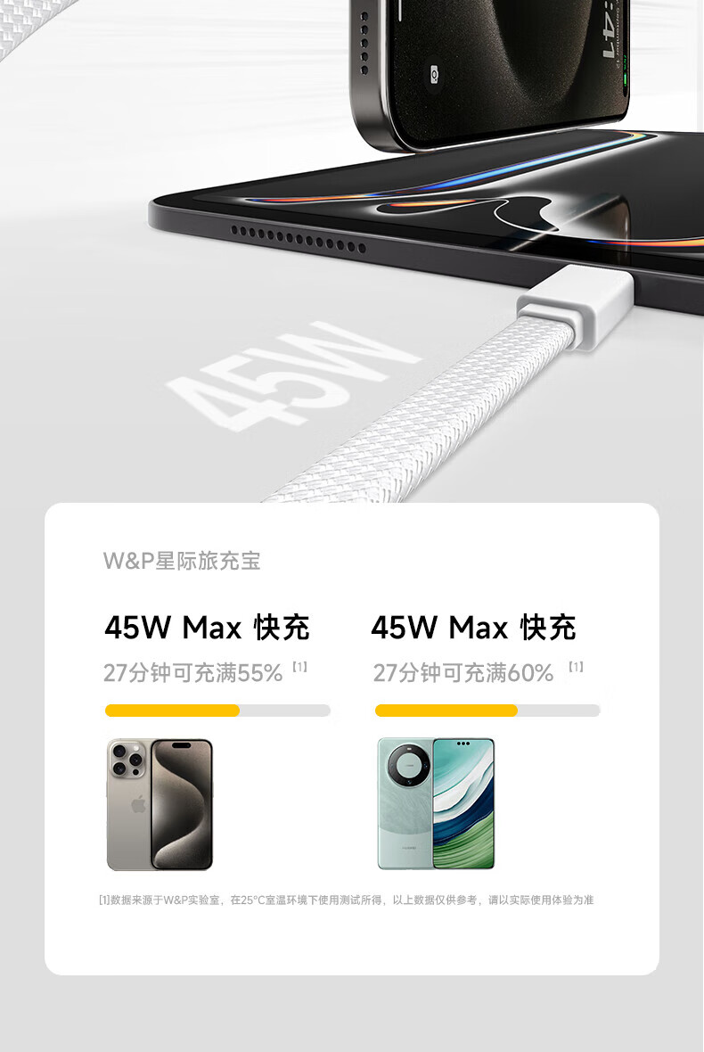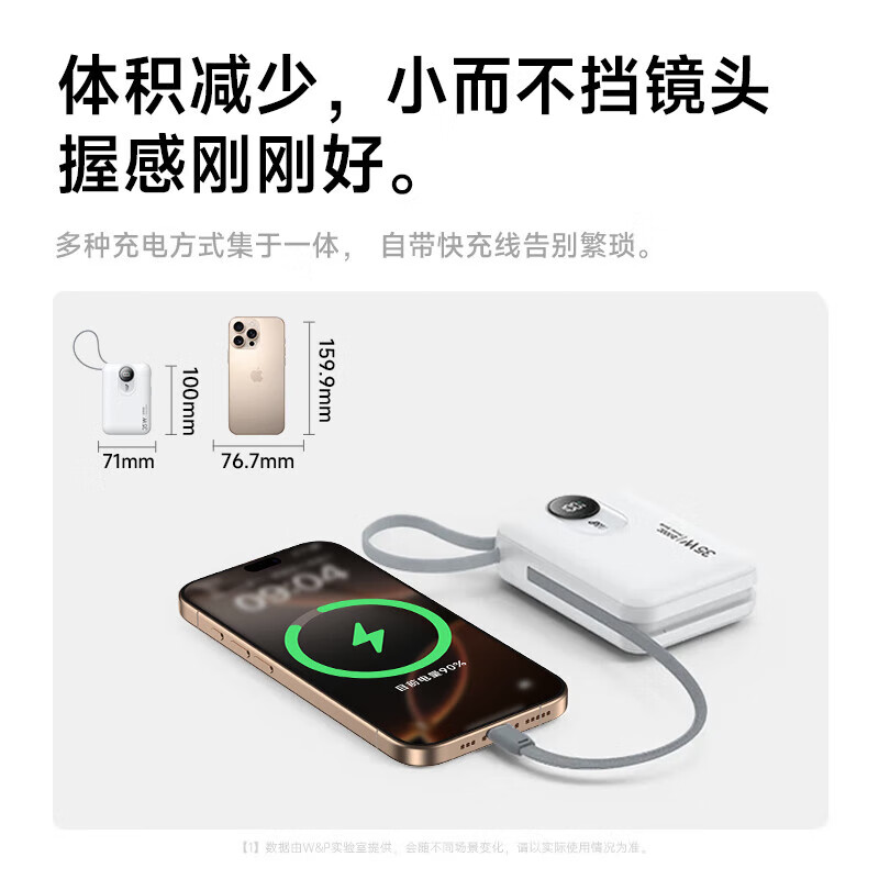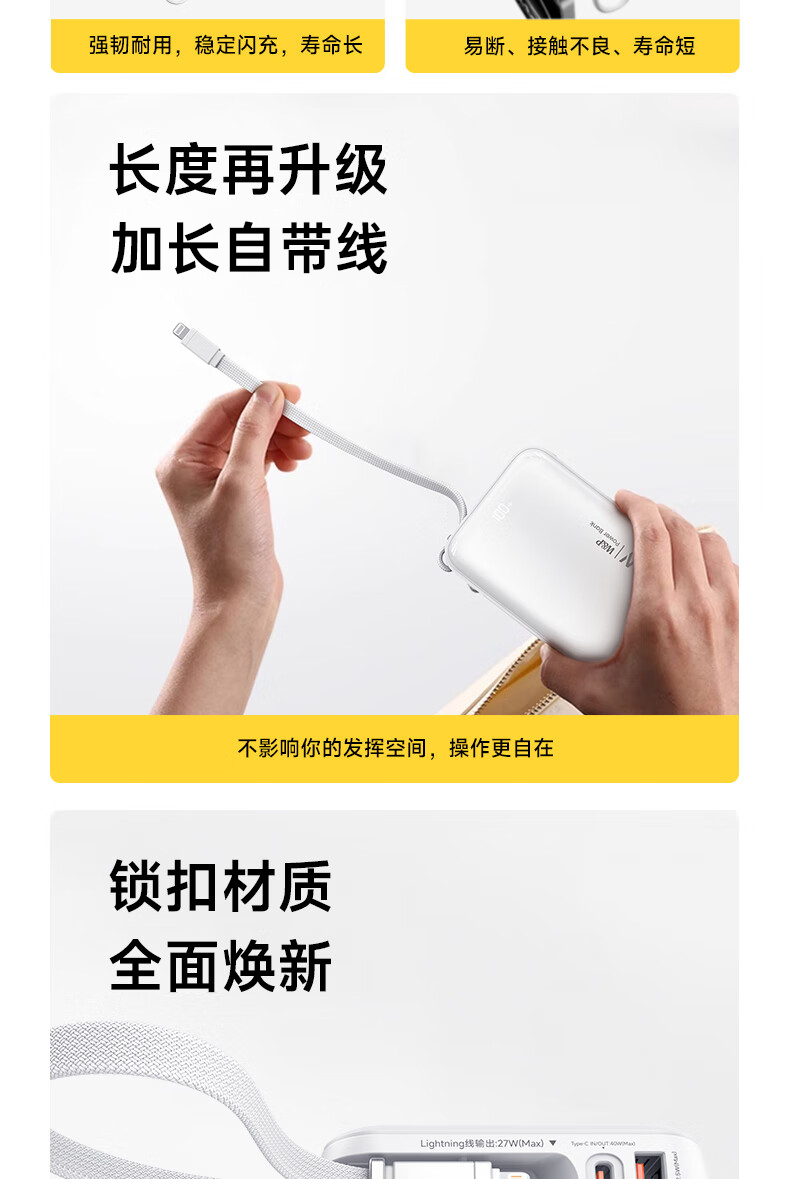 自带快充双线 无需带线,拿起就充;20000mAh大容量每次,远行都有底气;自带快充双线一次充4台