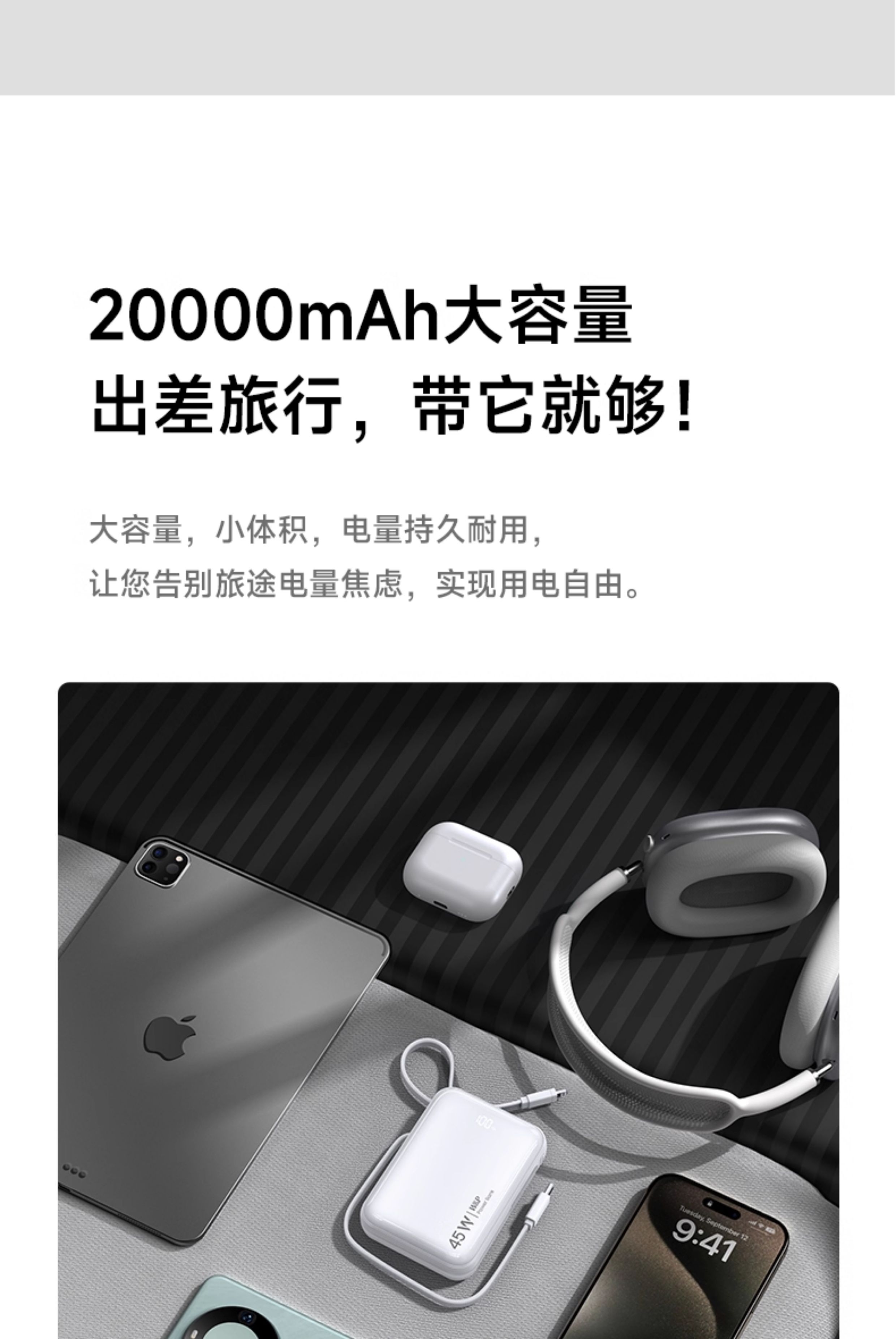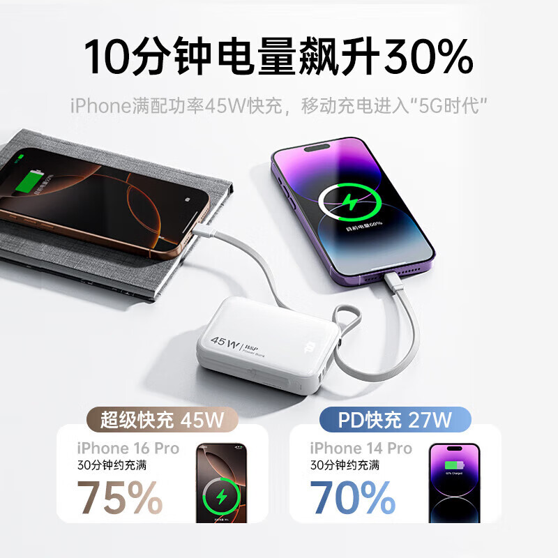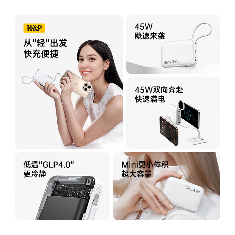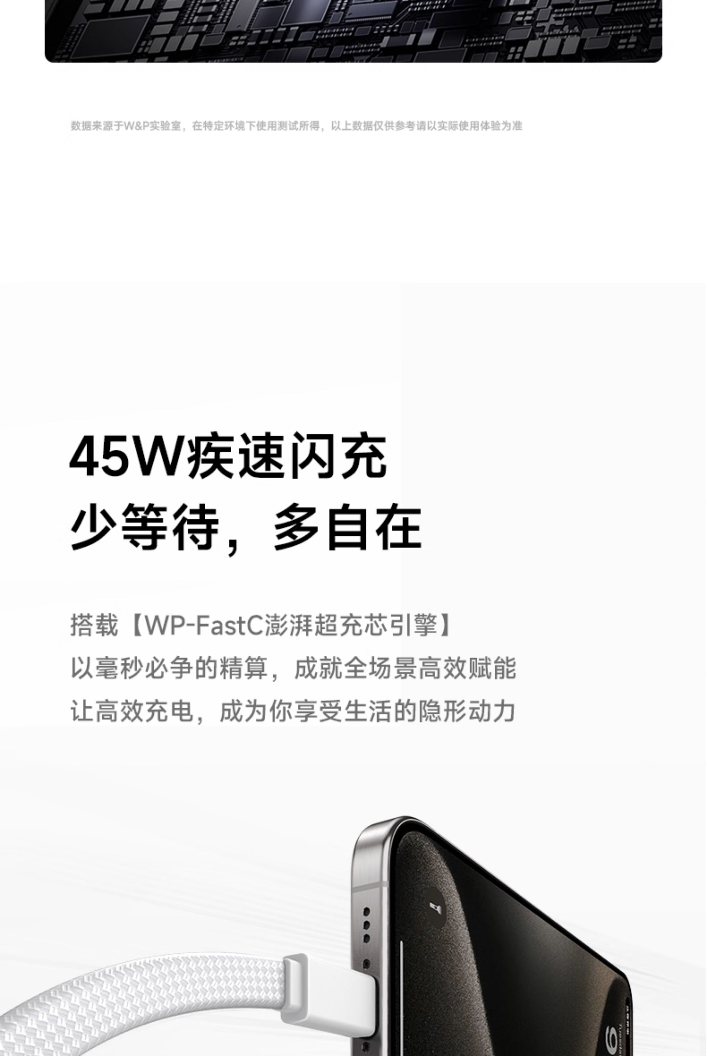 45W超充自带双线;从“轻”出发快充便捷;超大容量 Mini更小体积