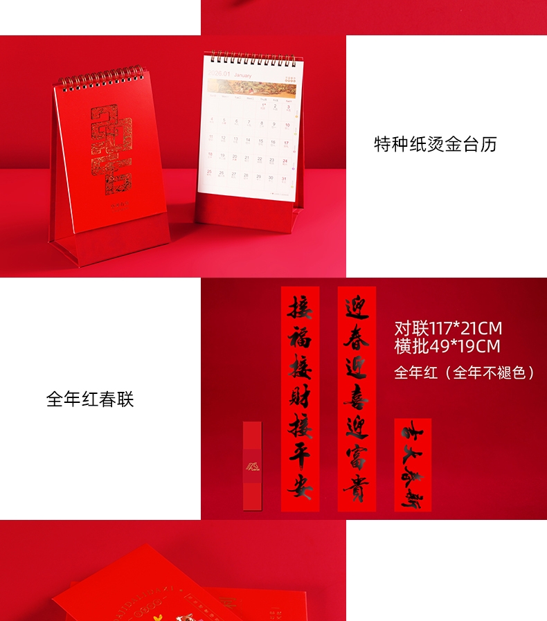 尺寸:笔记本210*145mm 金属笔140*10mm 台历215*125mm 春联1170*210mm 红包袋168*88mm