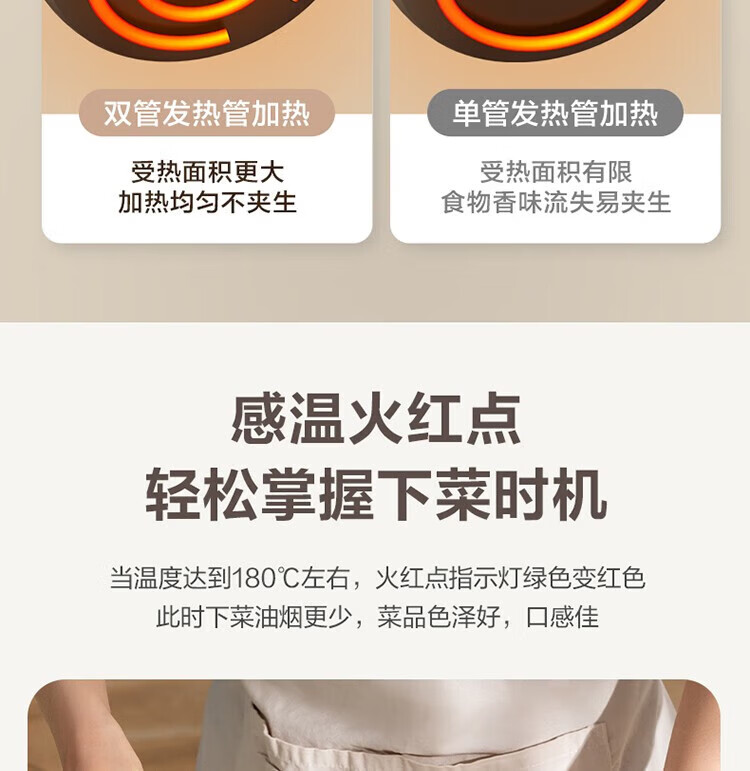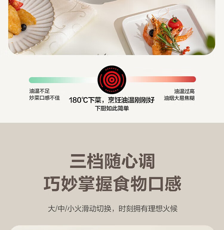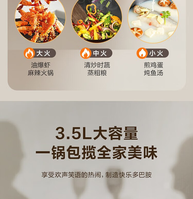 500W双管速热 猛火爆炒才更香;火红点翻炒少油烟;三挡火力调节 ,轻松拿捏火候