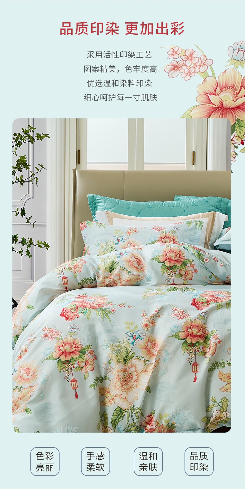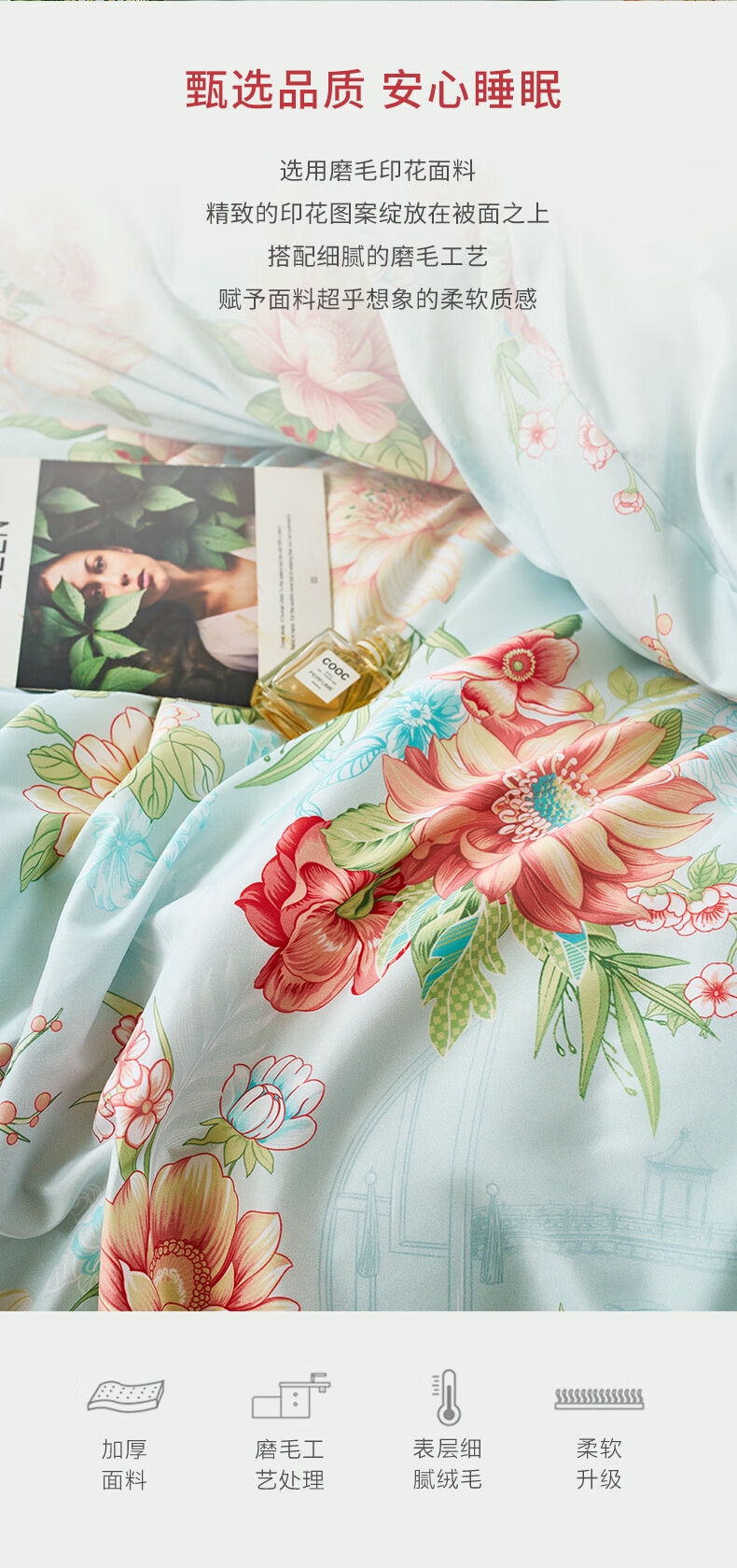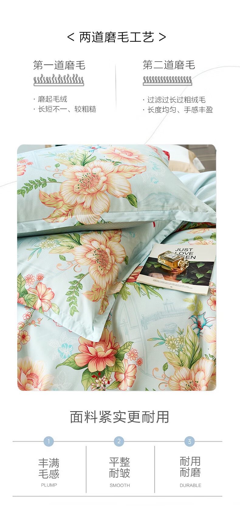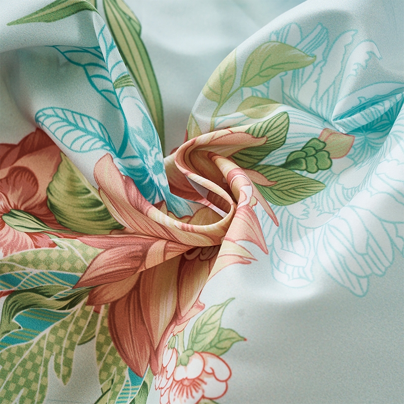 面料经过两次打磨处理,在表面会形成一种细密短绒毛;原创印花,鲜活印染,花型更立体,久用不褪色,好品质;历经多道印染工艺,面料颜色丰富,花型层次感佳